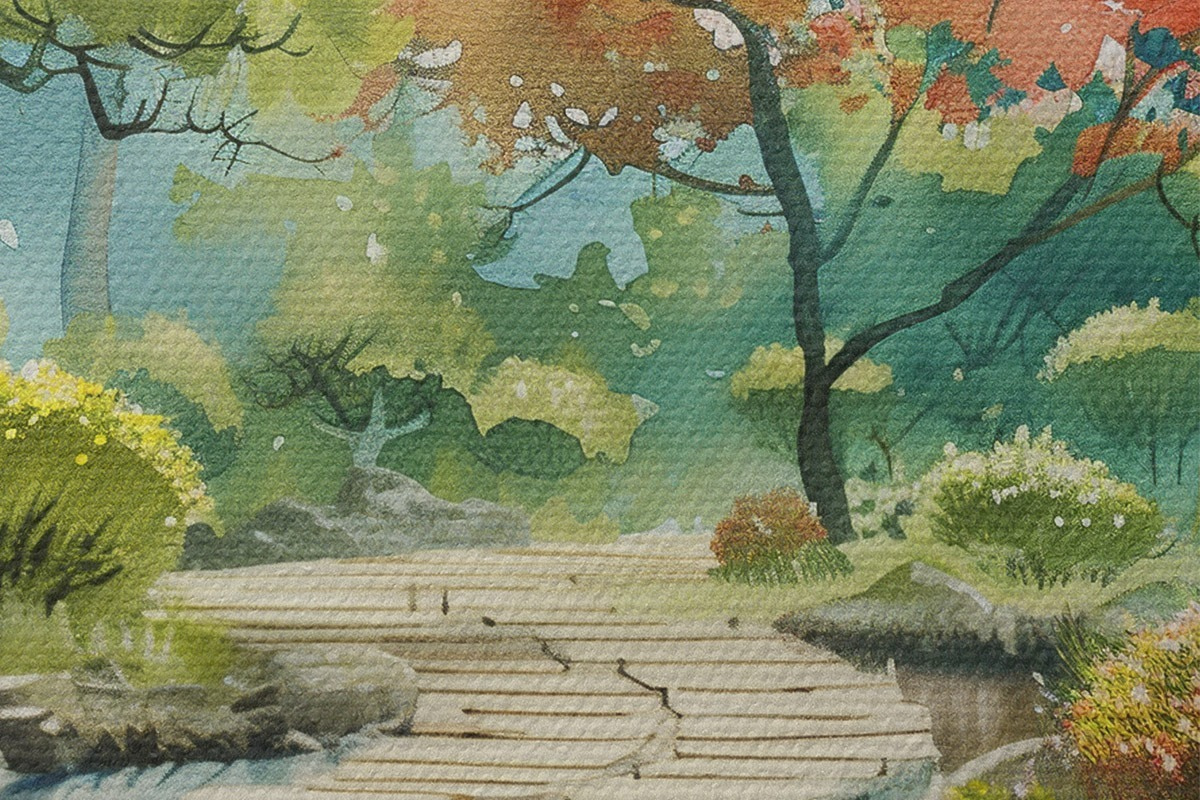 Nuotrauka Parkas su medžiais ir gėlių krūmais, tvenkinys, vyšnia Nr r39778