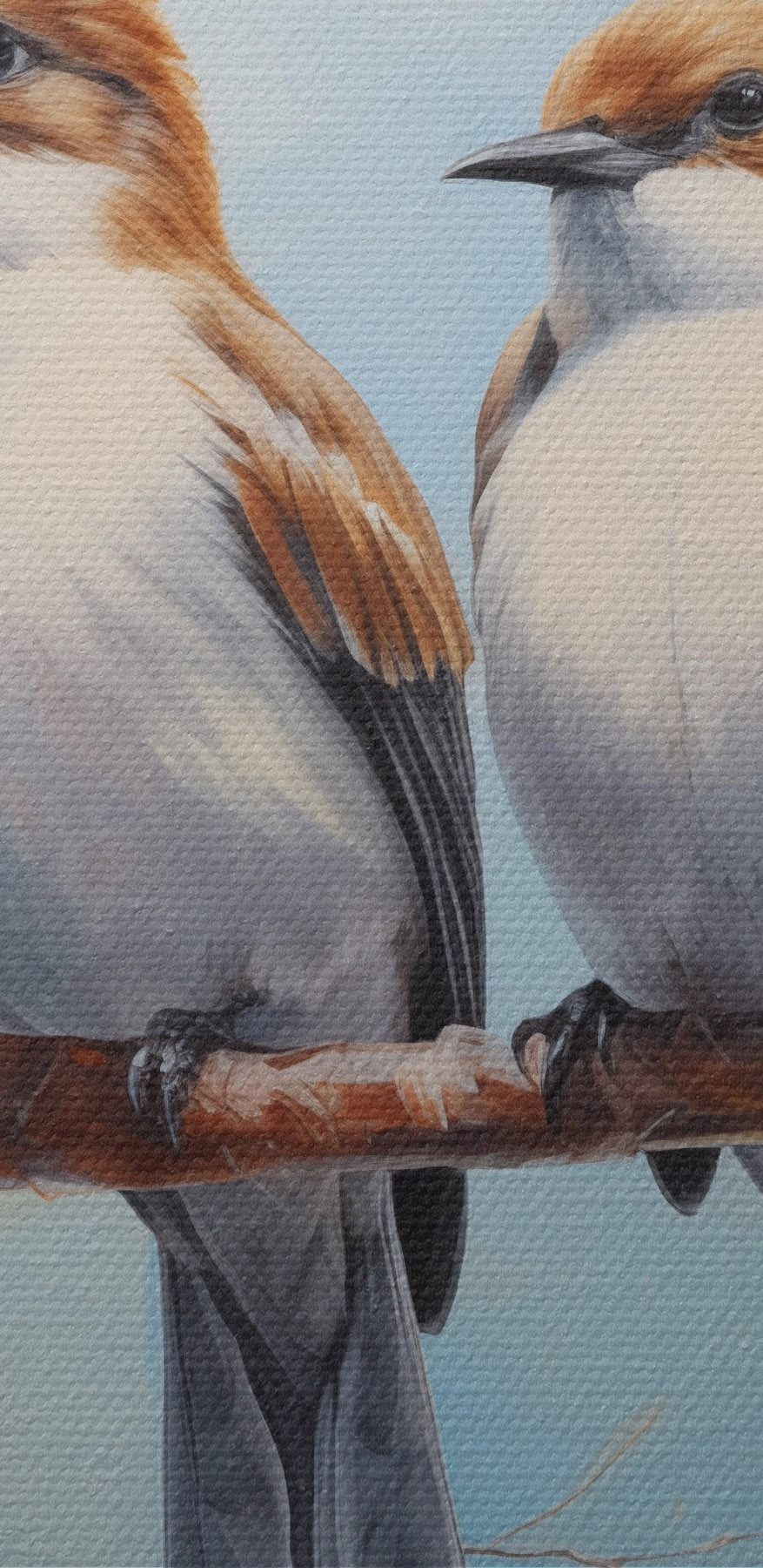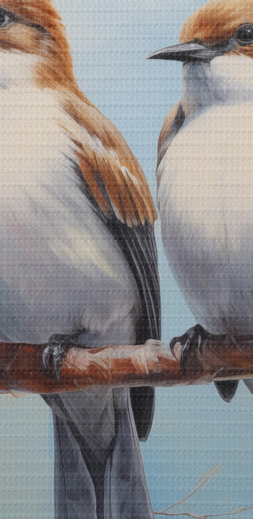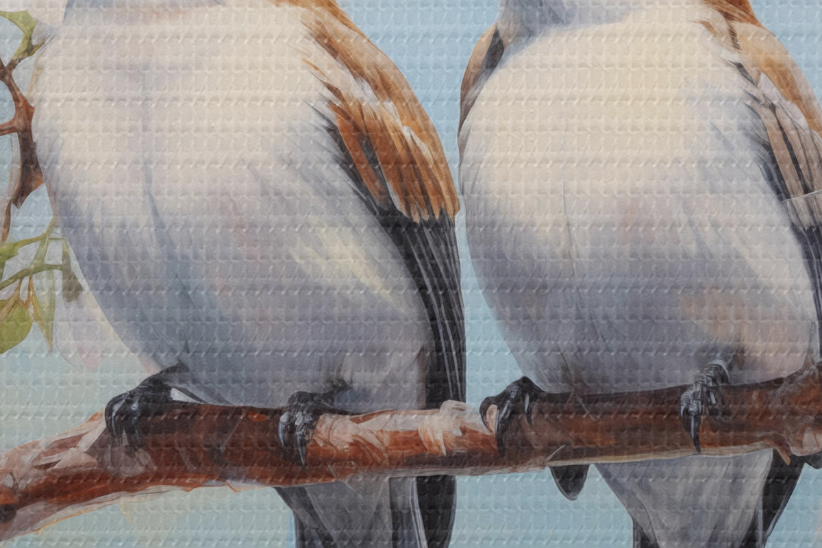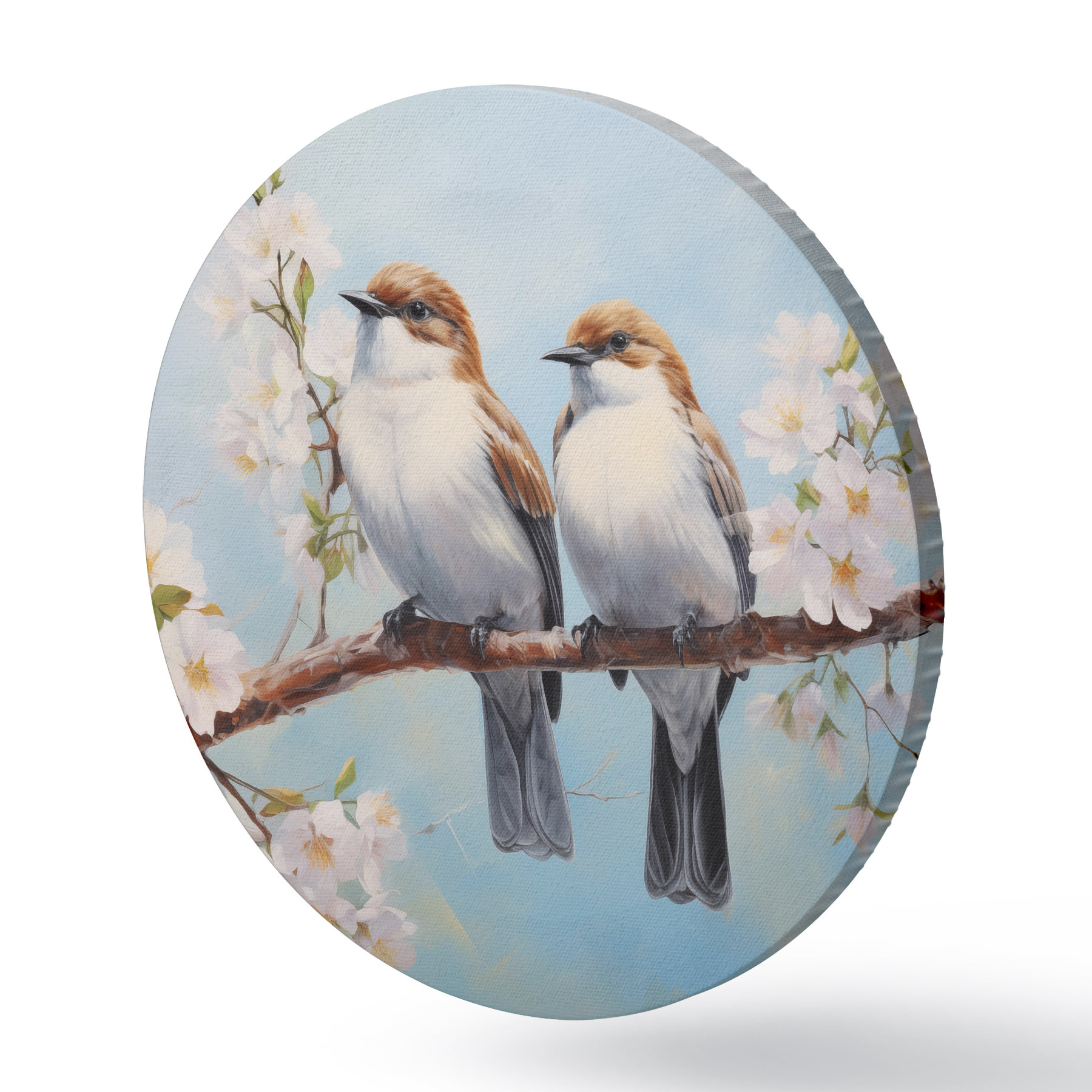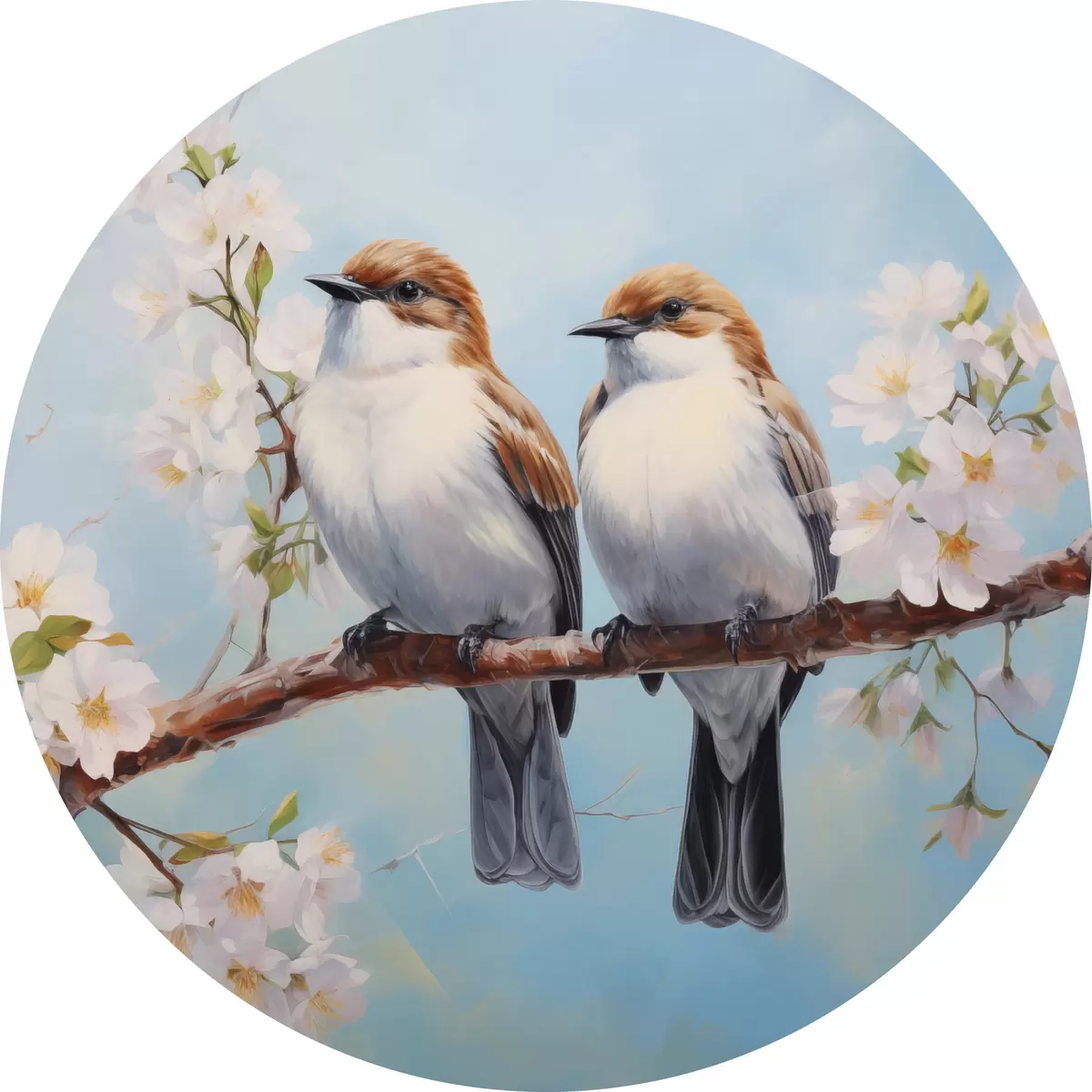 Nuotrauka Ant žydinčios šakos sėdintys žvirbliai aliejinė tapyba, mėlyna, balta, ruda Nr r39829
