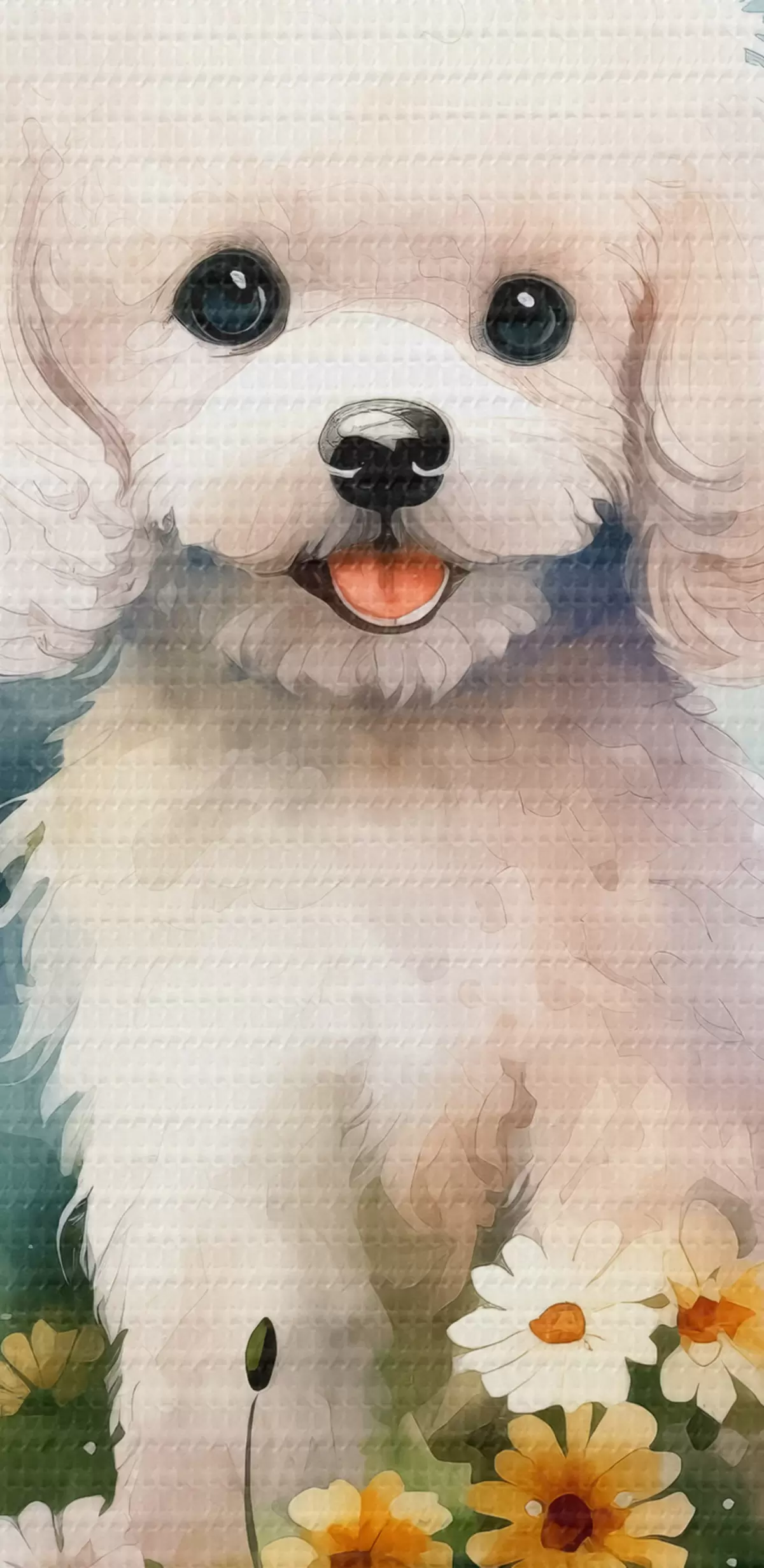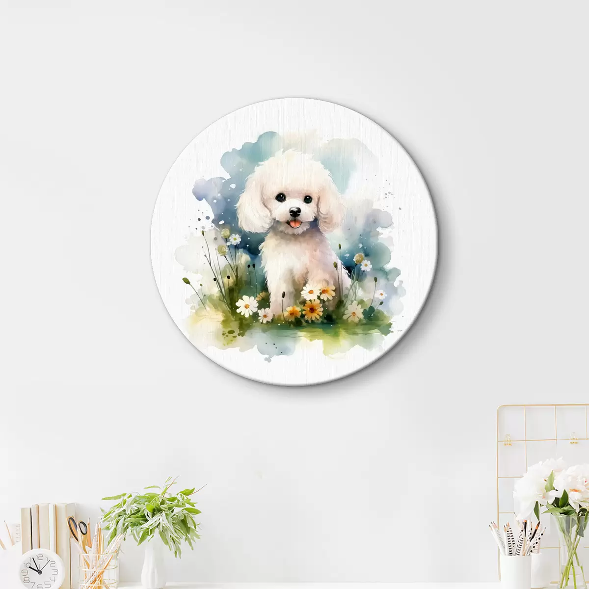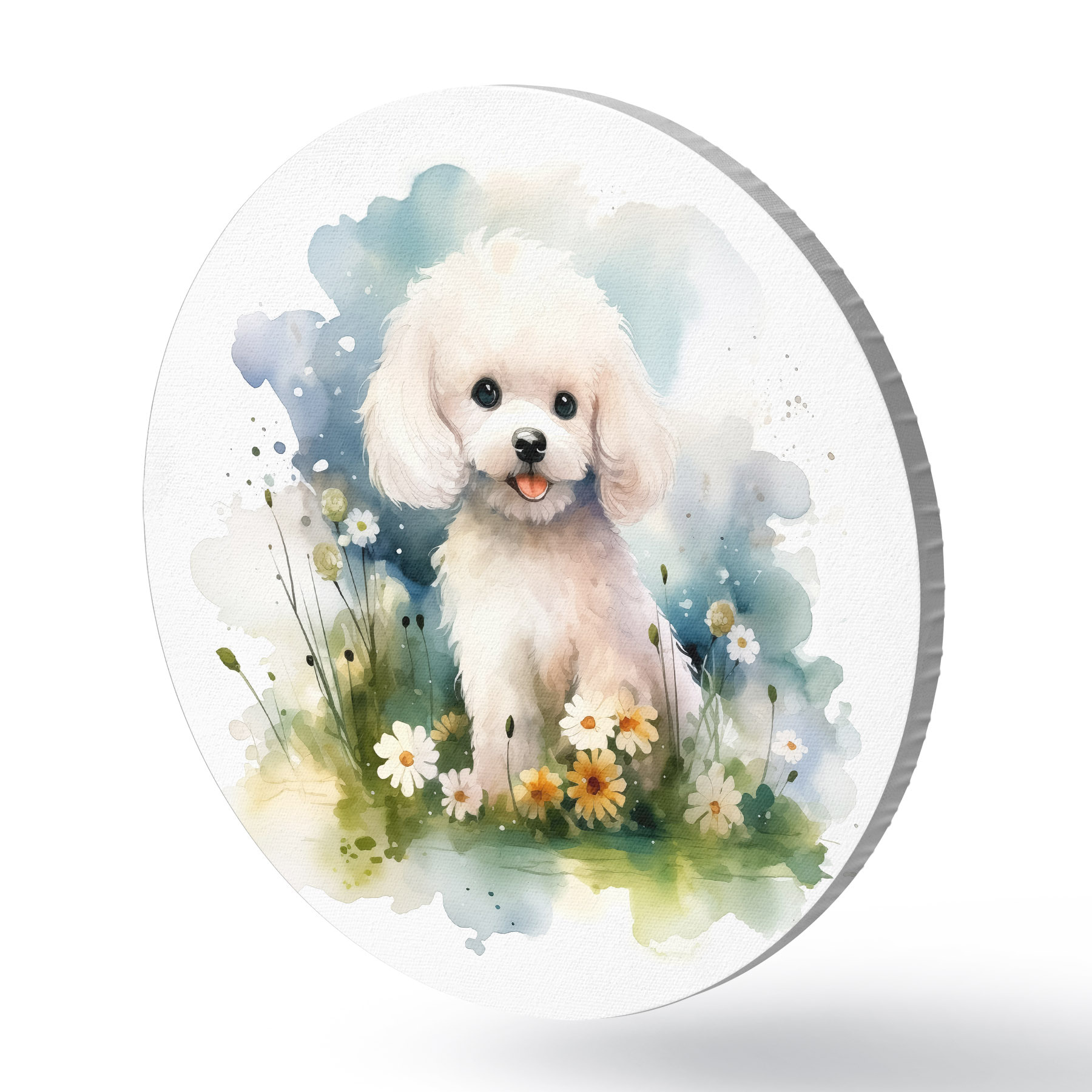 Nuotrauka Mažas baltas pudelis, sėdintis gėlių akvarelėje Nr r39928