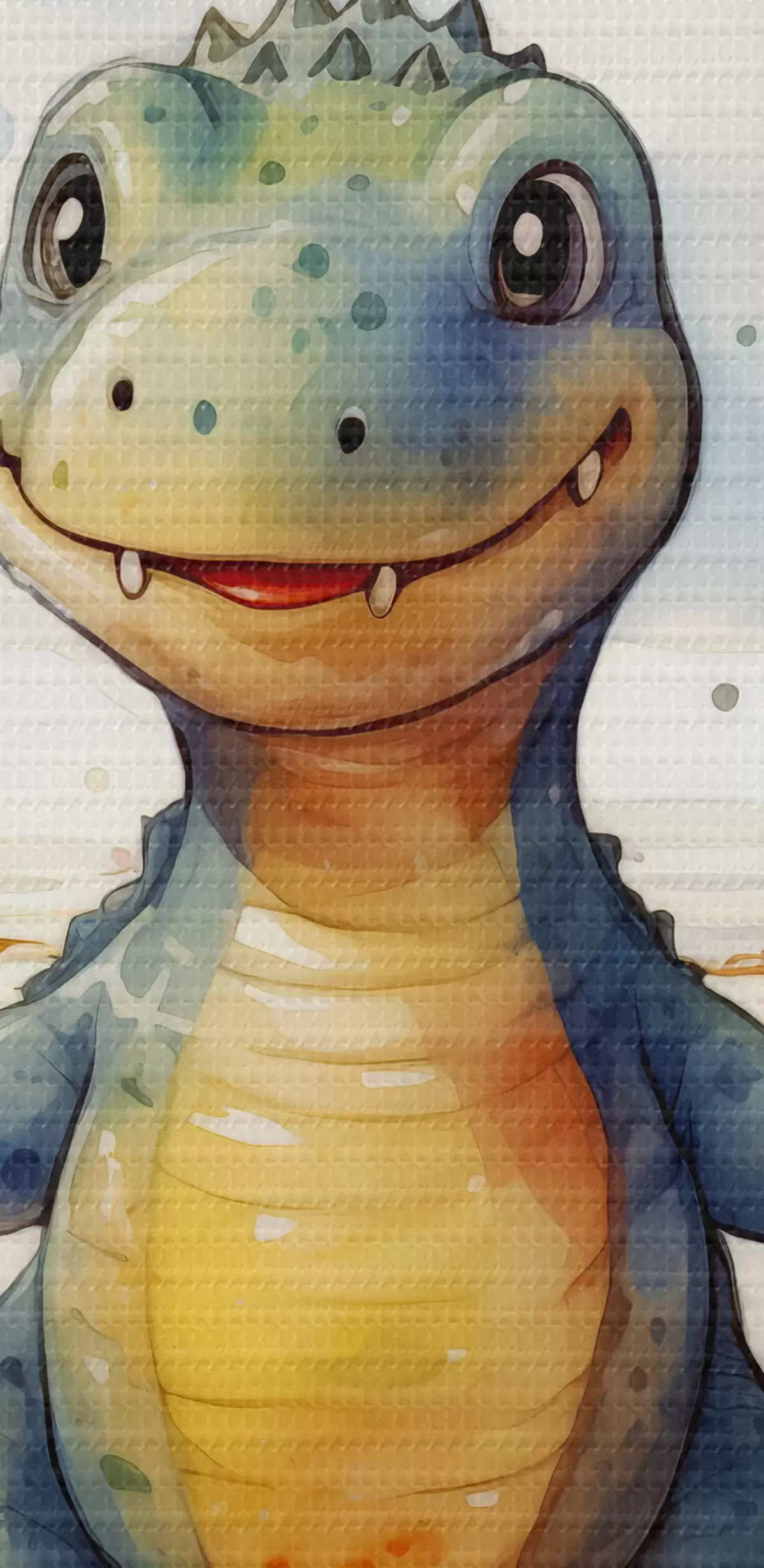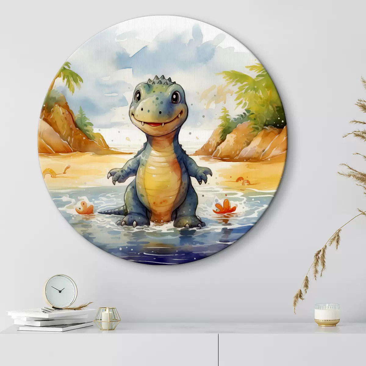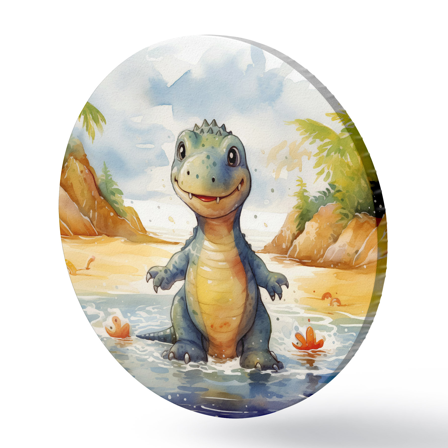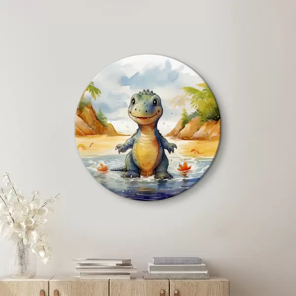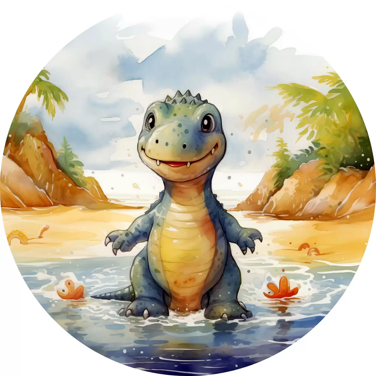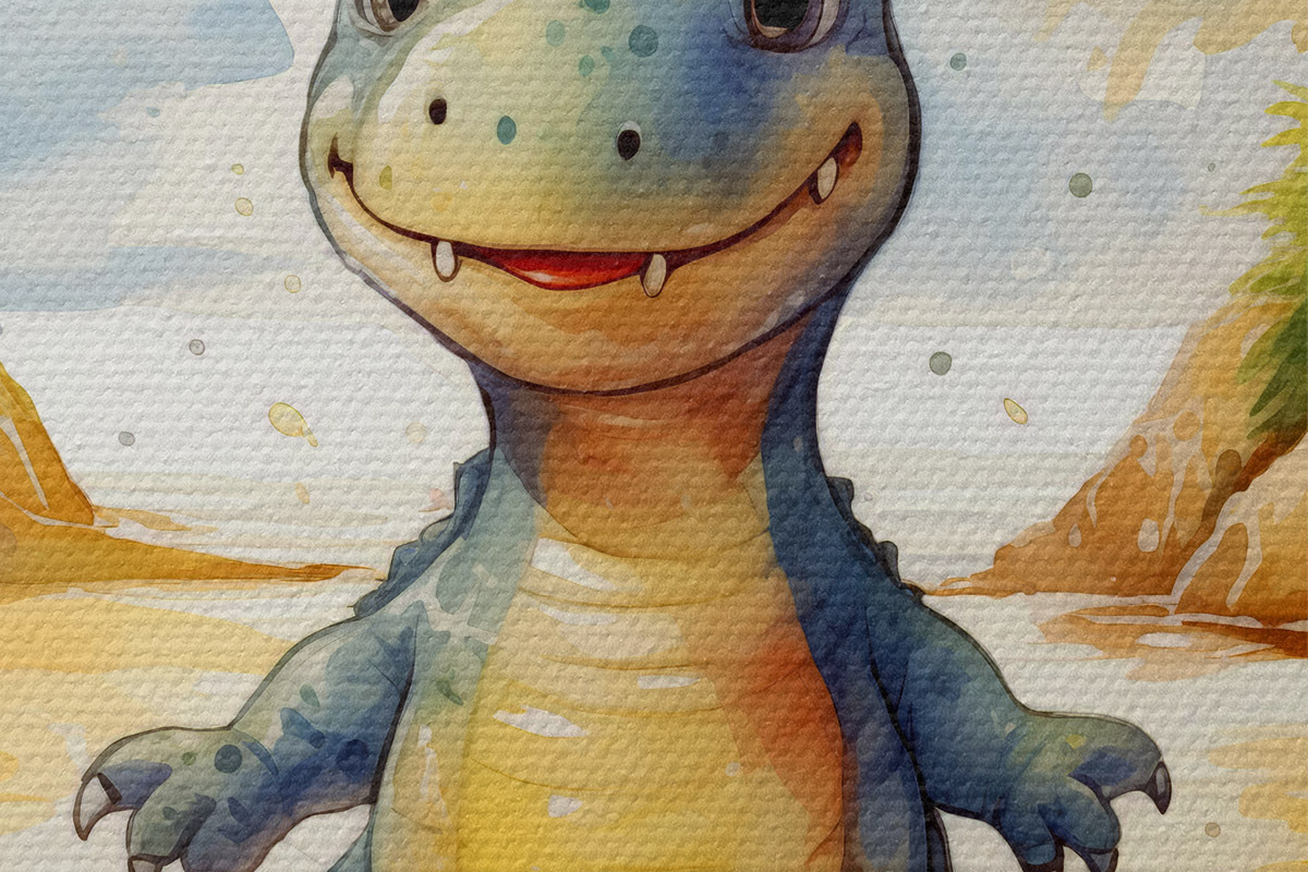 Nuotrauka Dinozauras upėje kalnų ir paparčių akvarelės fone Nr r39930
