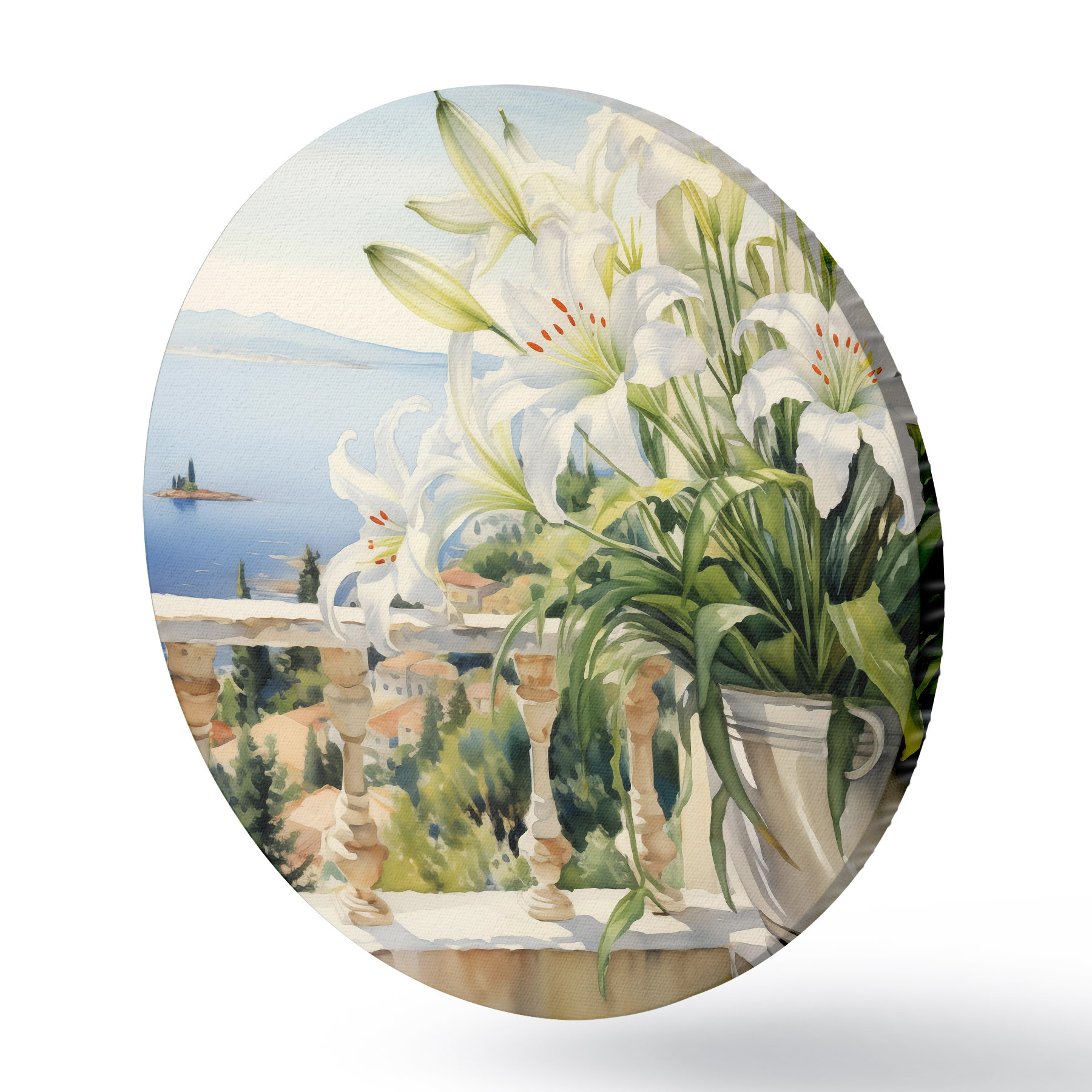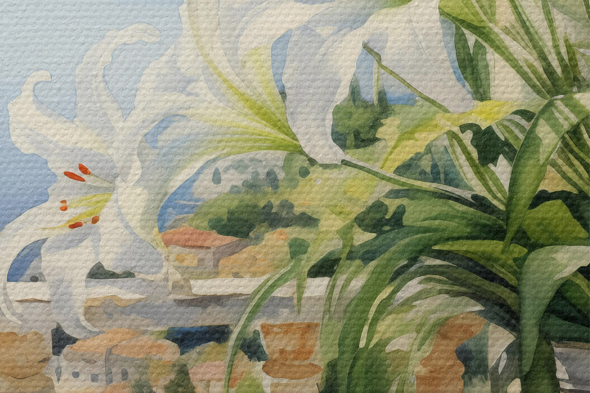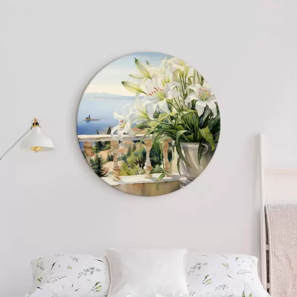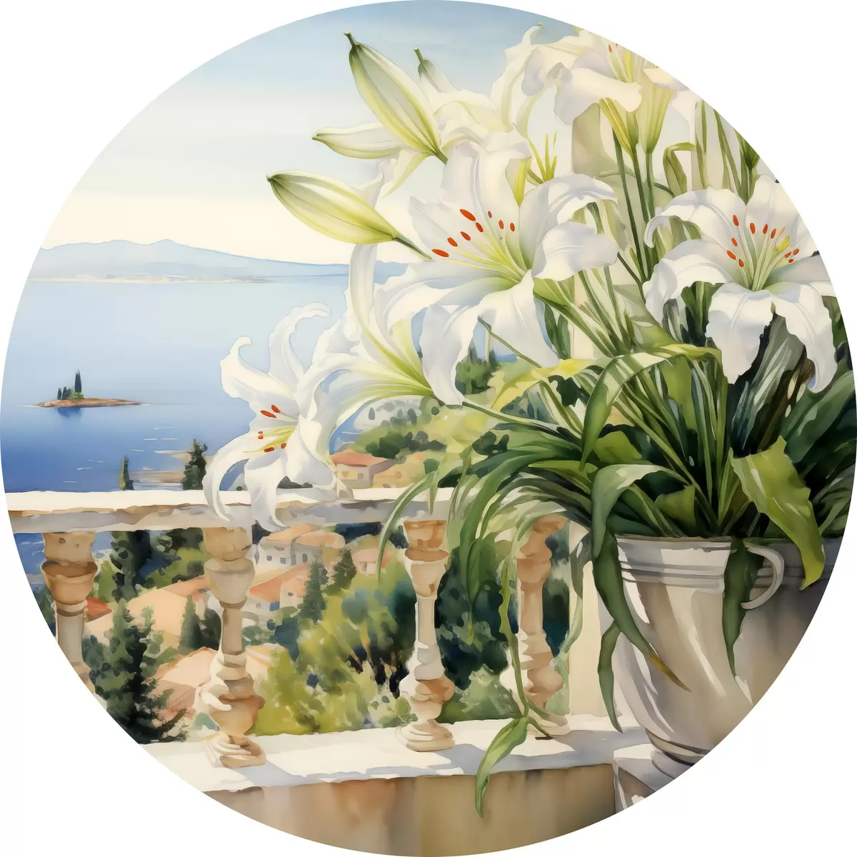 Nuotrauka Baltos lelijos vazonėlyje balkone įlankos akvarelės fone Nr r39932