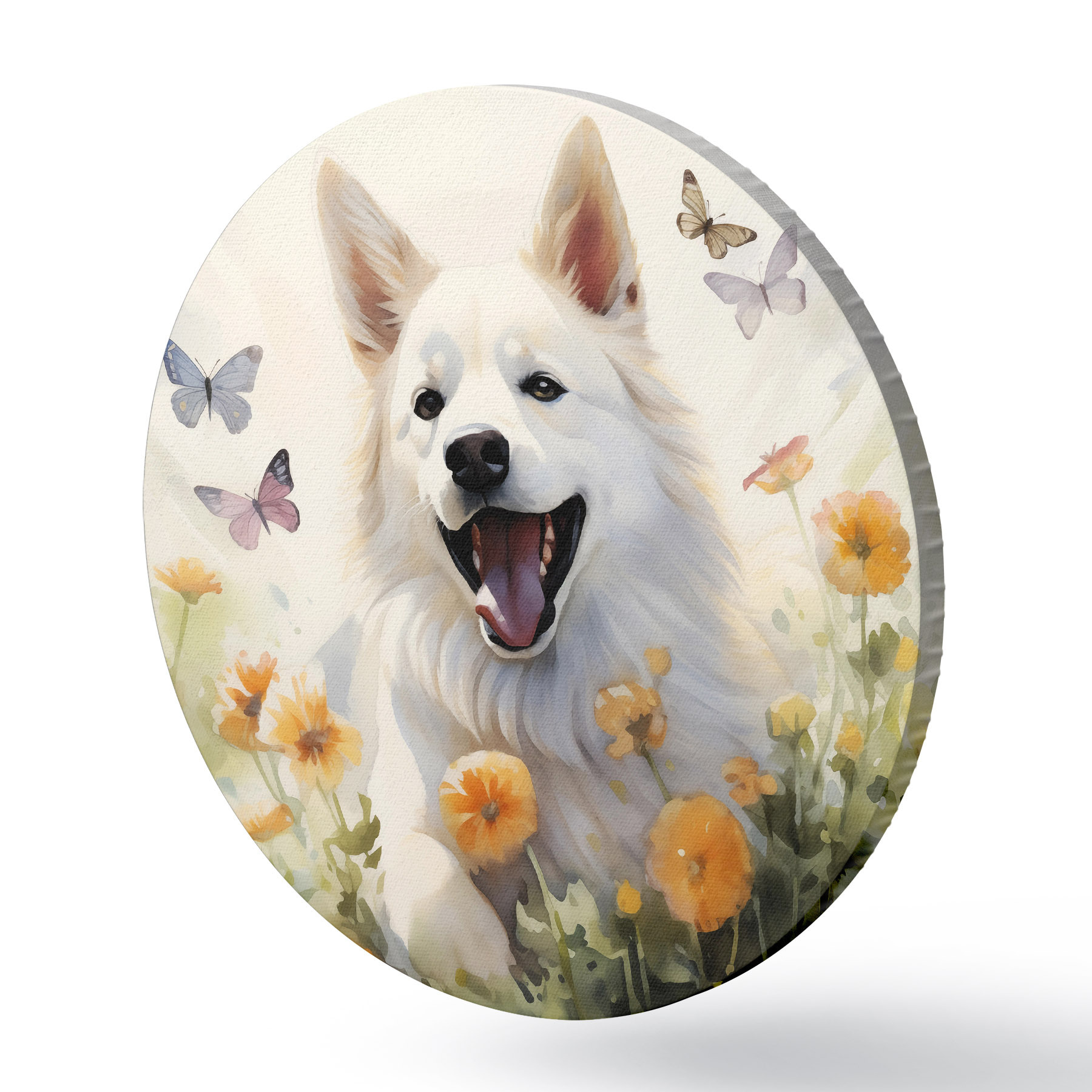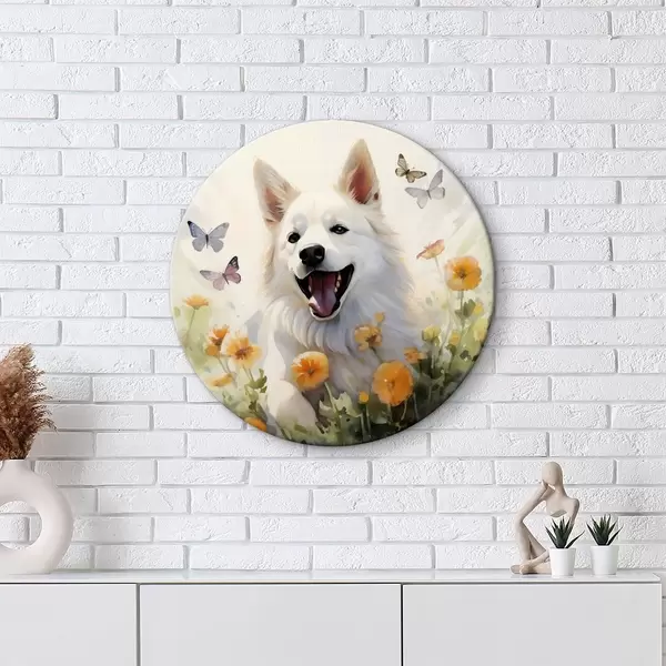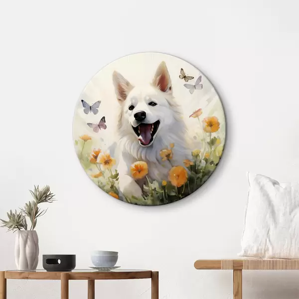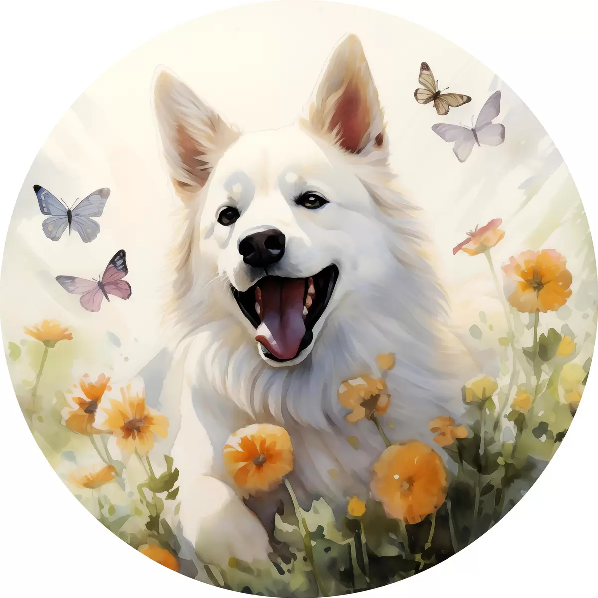 Nuotrauka Baltas šuo sėdi gėlėse, drugeliai skraido akvarele Nr r39936