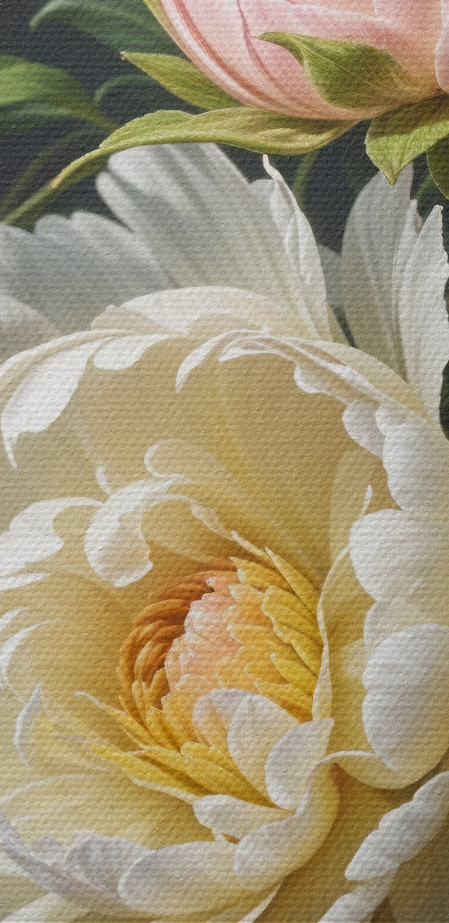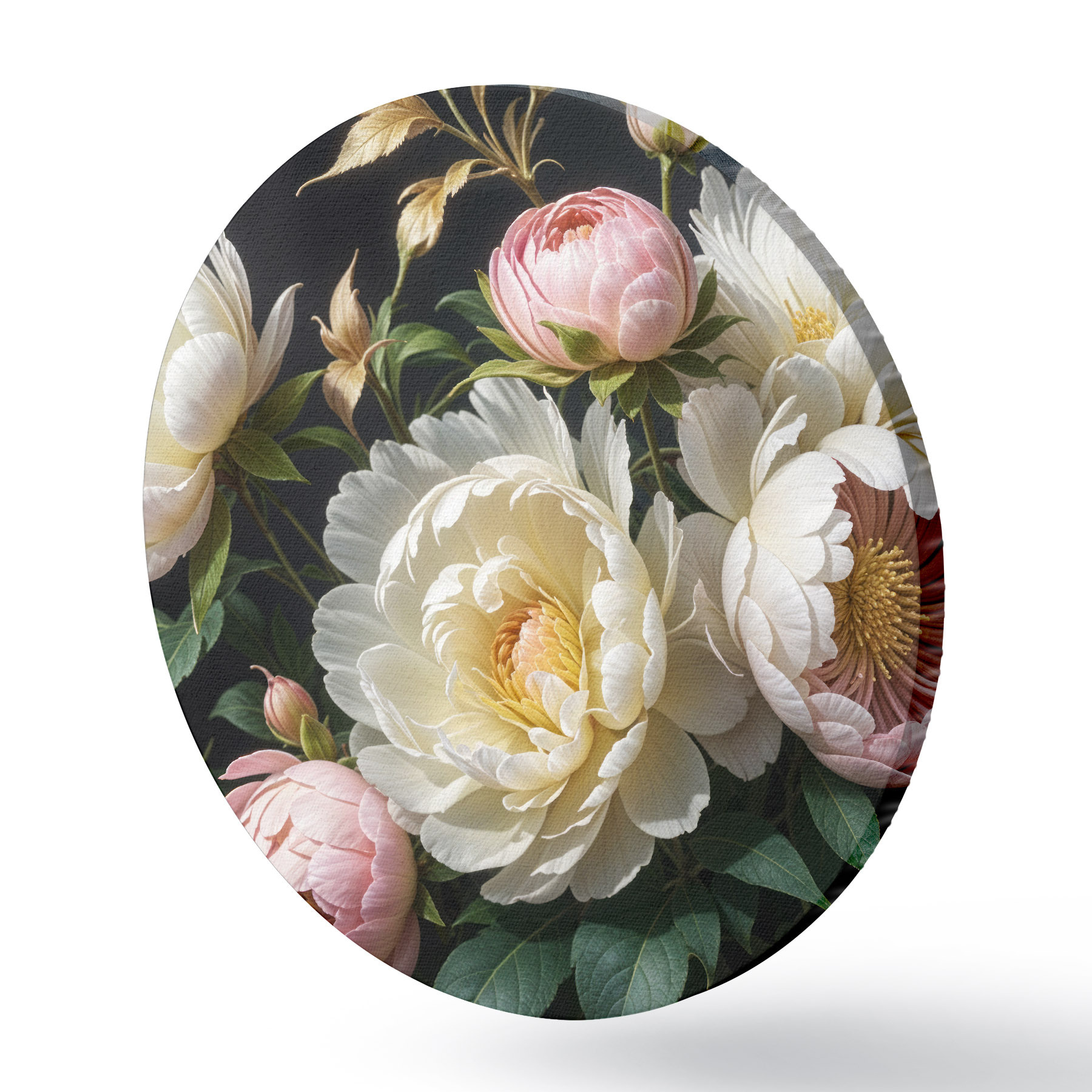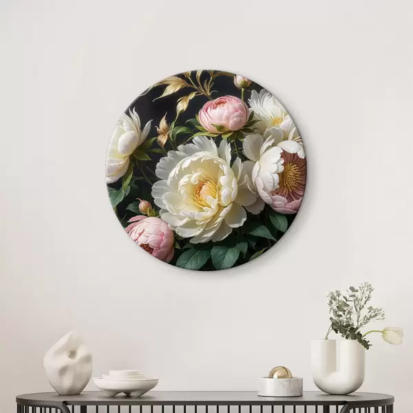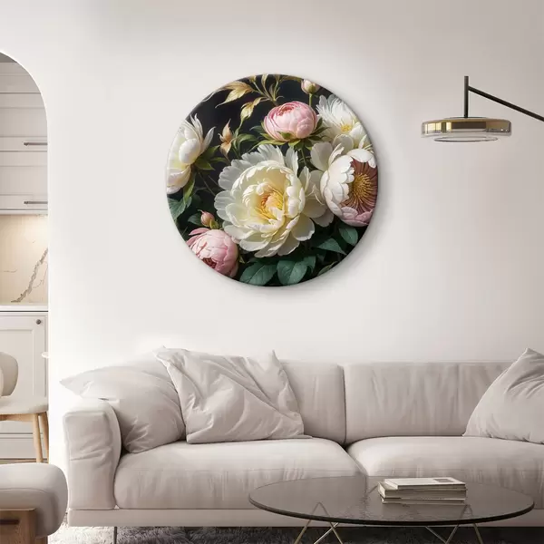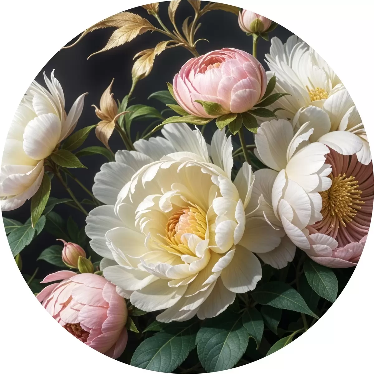 Nuotrauka Didelių, sodrių baltų ir rausvų bijūnų žiedų puokštė žaliais lapais tamsiame fone Nr r40014