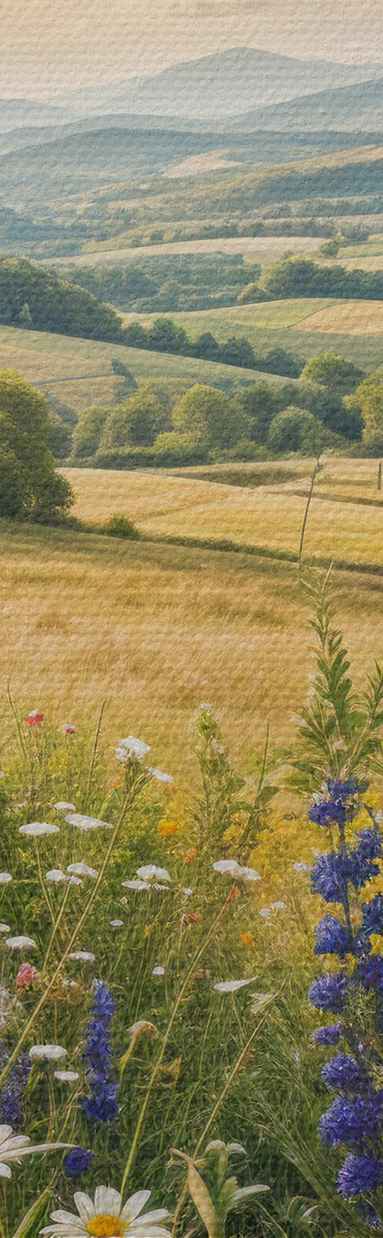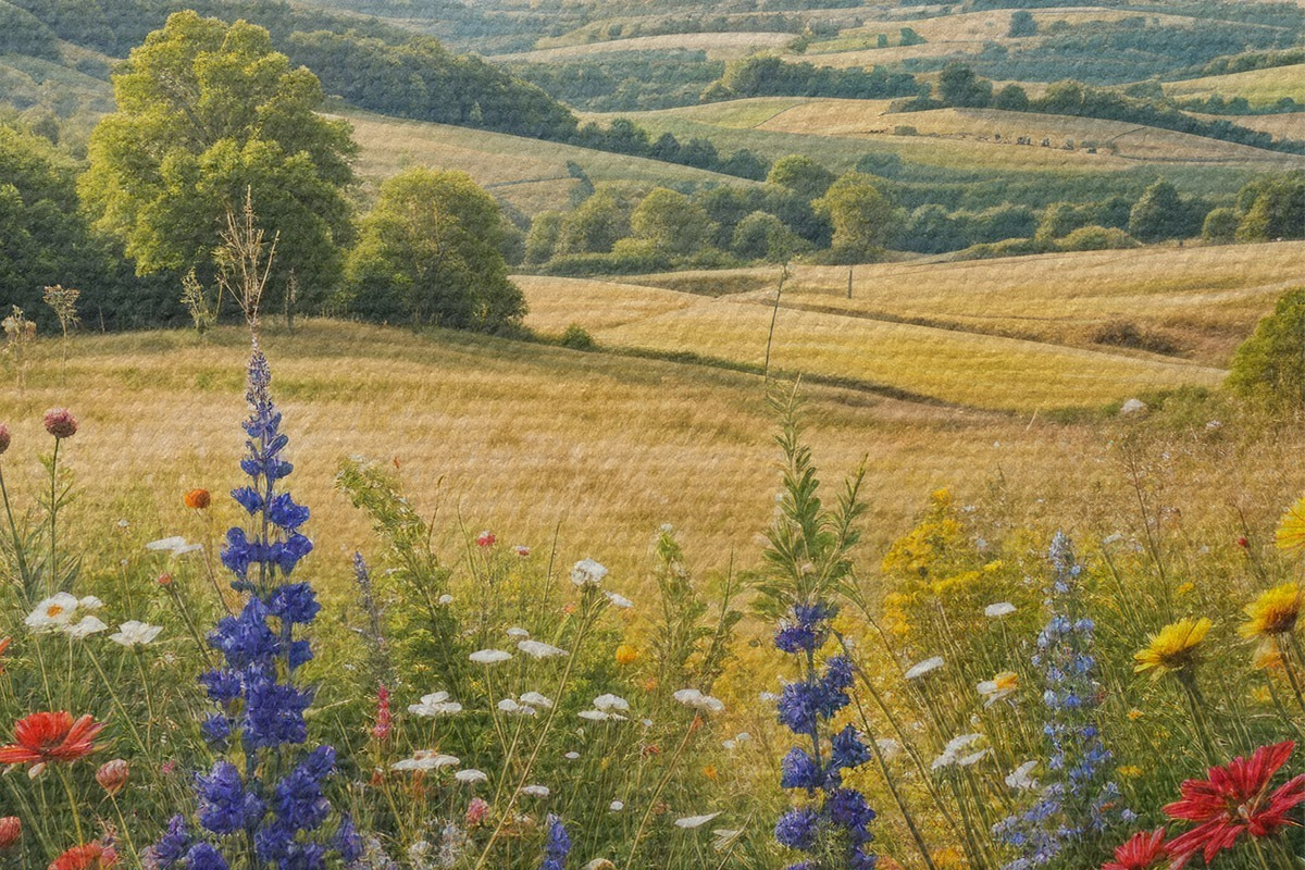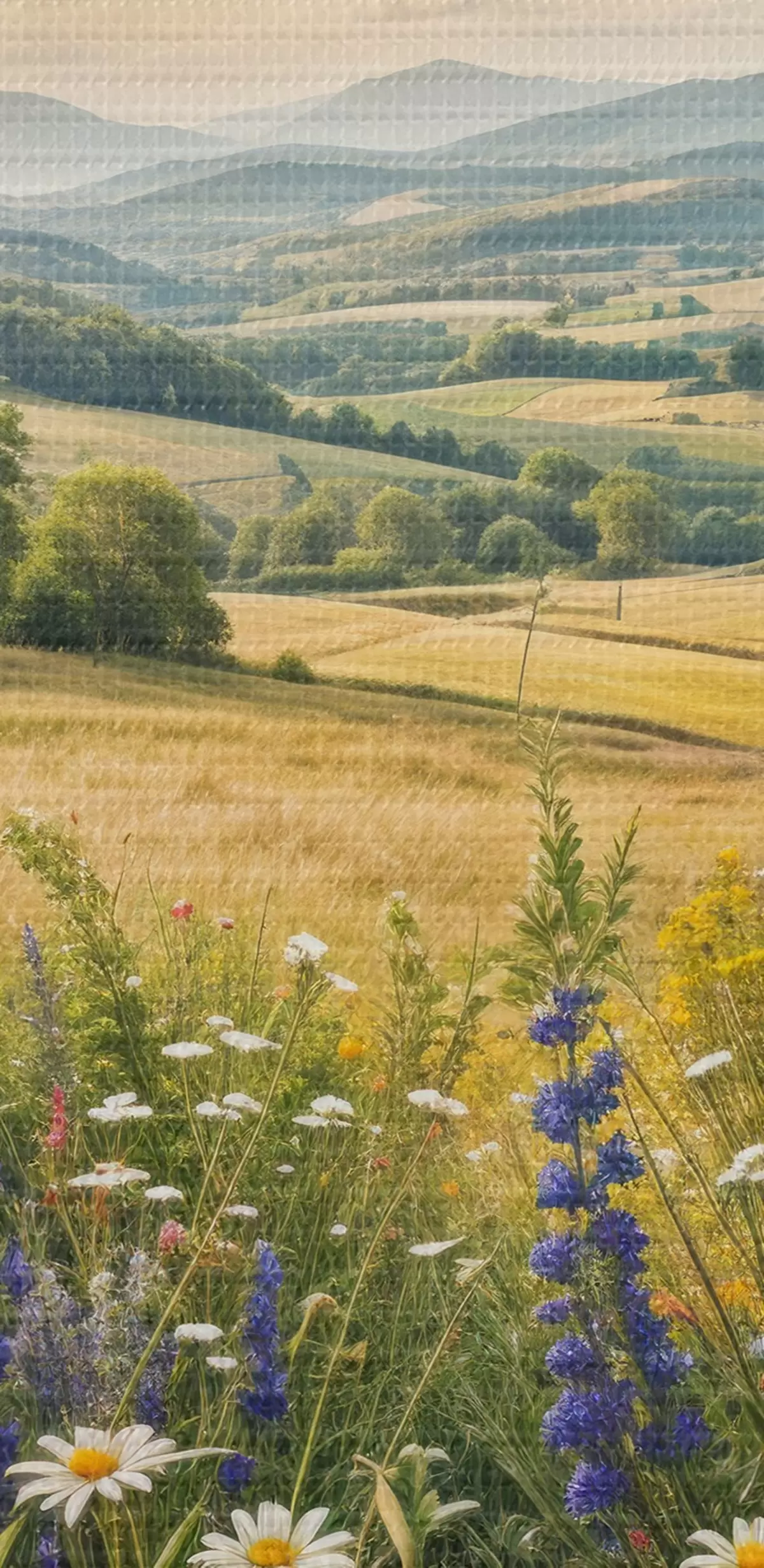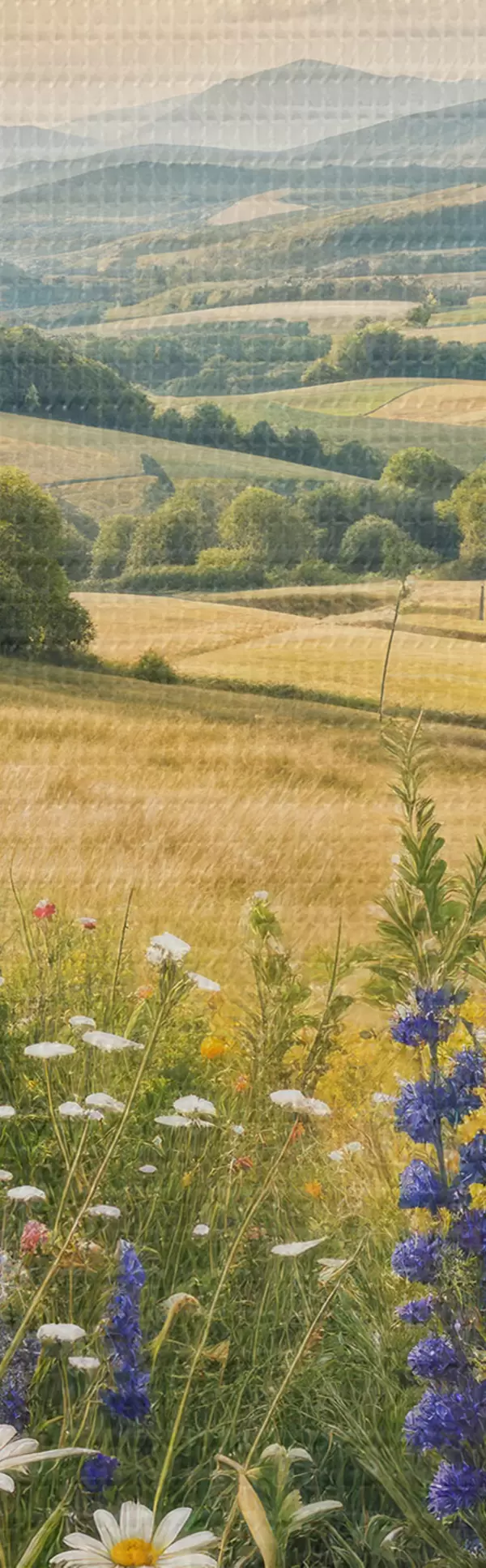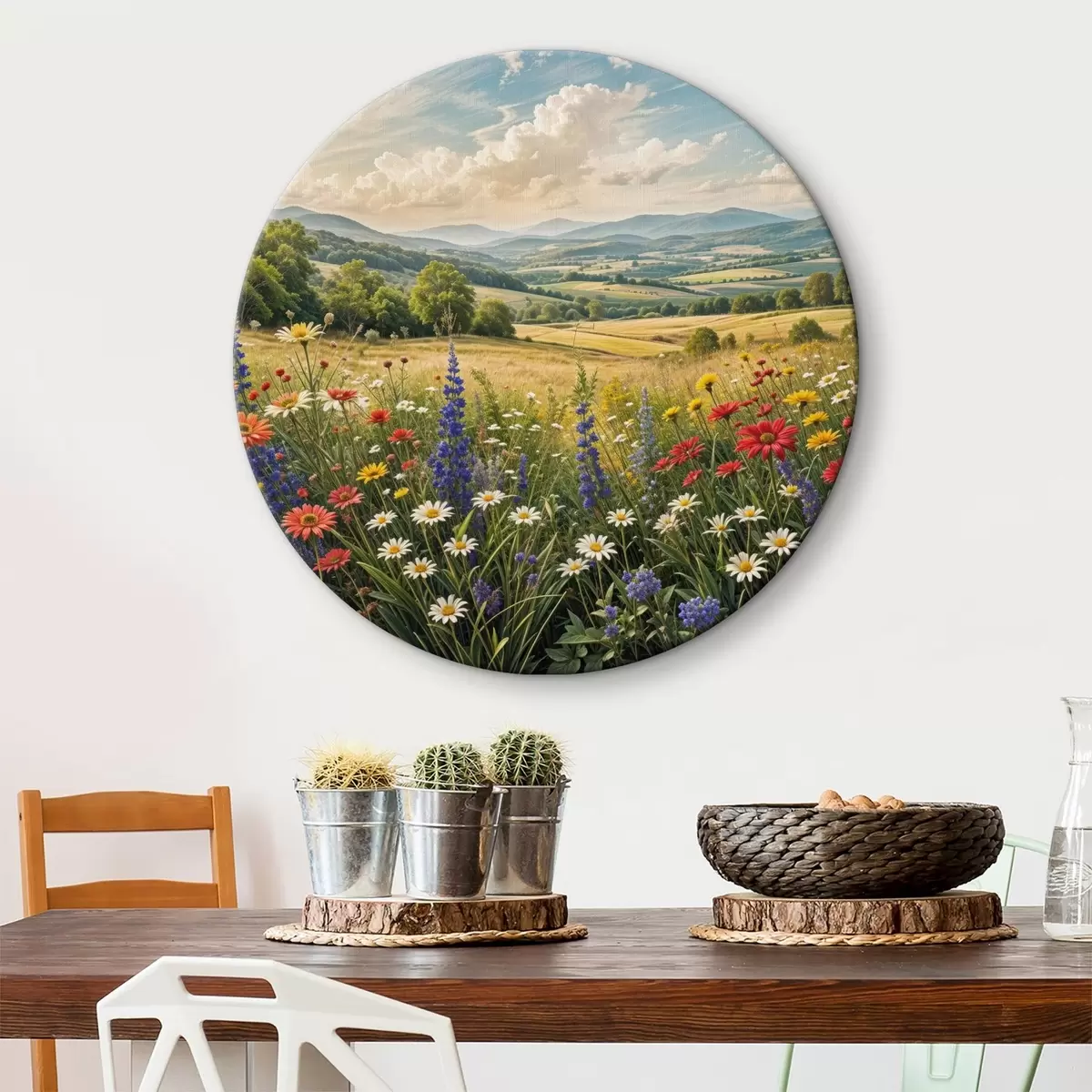 Nuotrauka Vešlus kaimo kraštovaizdis su gyvybinga lauko gėlių pieva, užpildyta spalvingomis gėlėmis po debesuotu dangumi Nr r40018