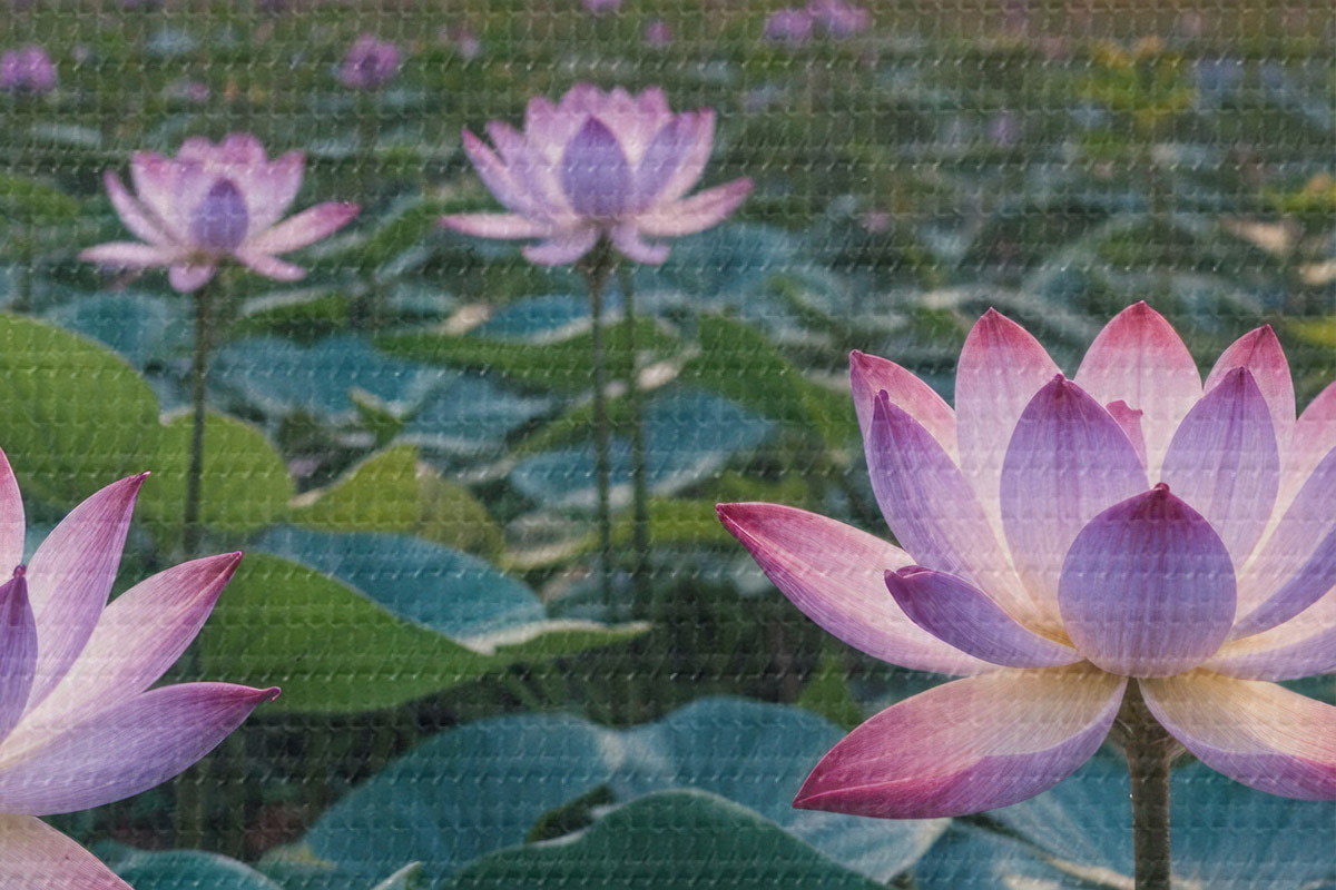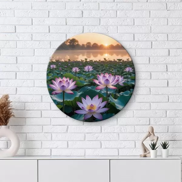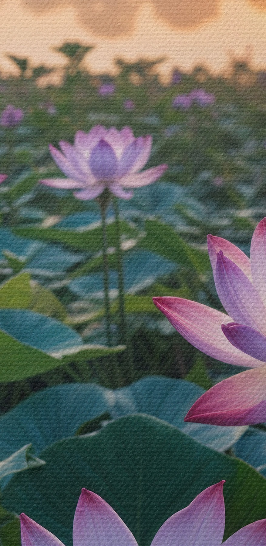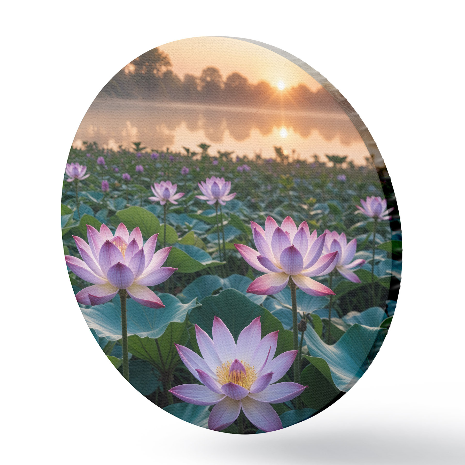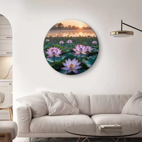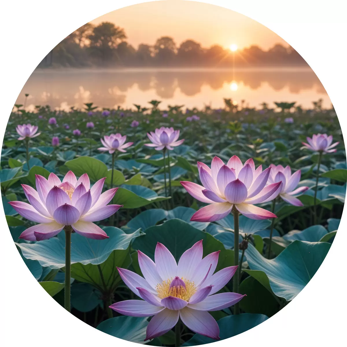 Nuotrauka Rožinių lotosų žiedų laukas, žydintis ant migloto ežero saulėlydžio metu, o fone – palmių siluetas Nr r40020