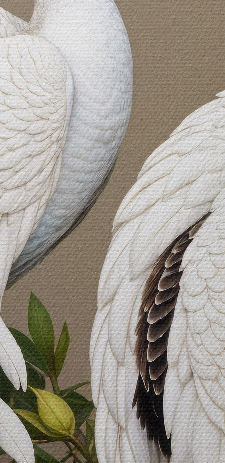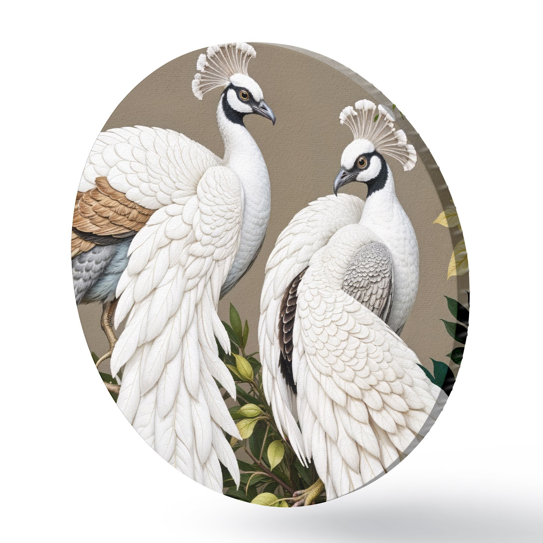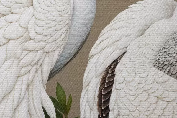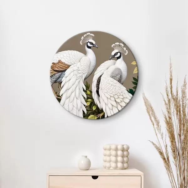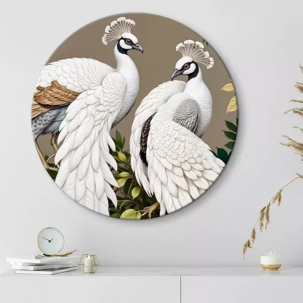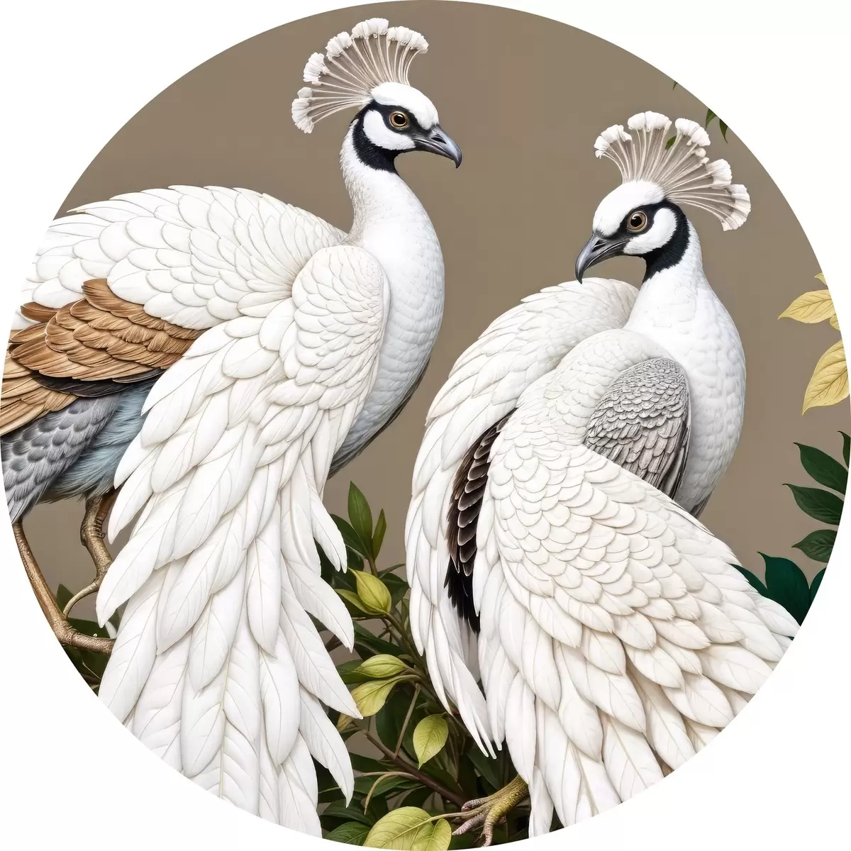 Nuotrauka Du balti povai puošniomis plunksnomis tupi ant šakos su gėlėmis Nr r40022