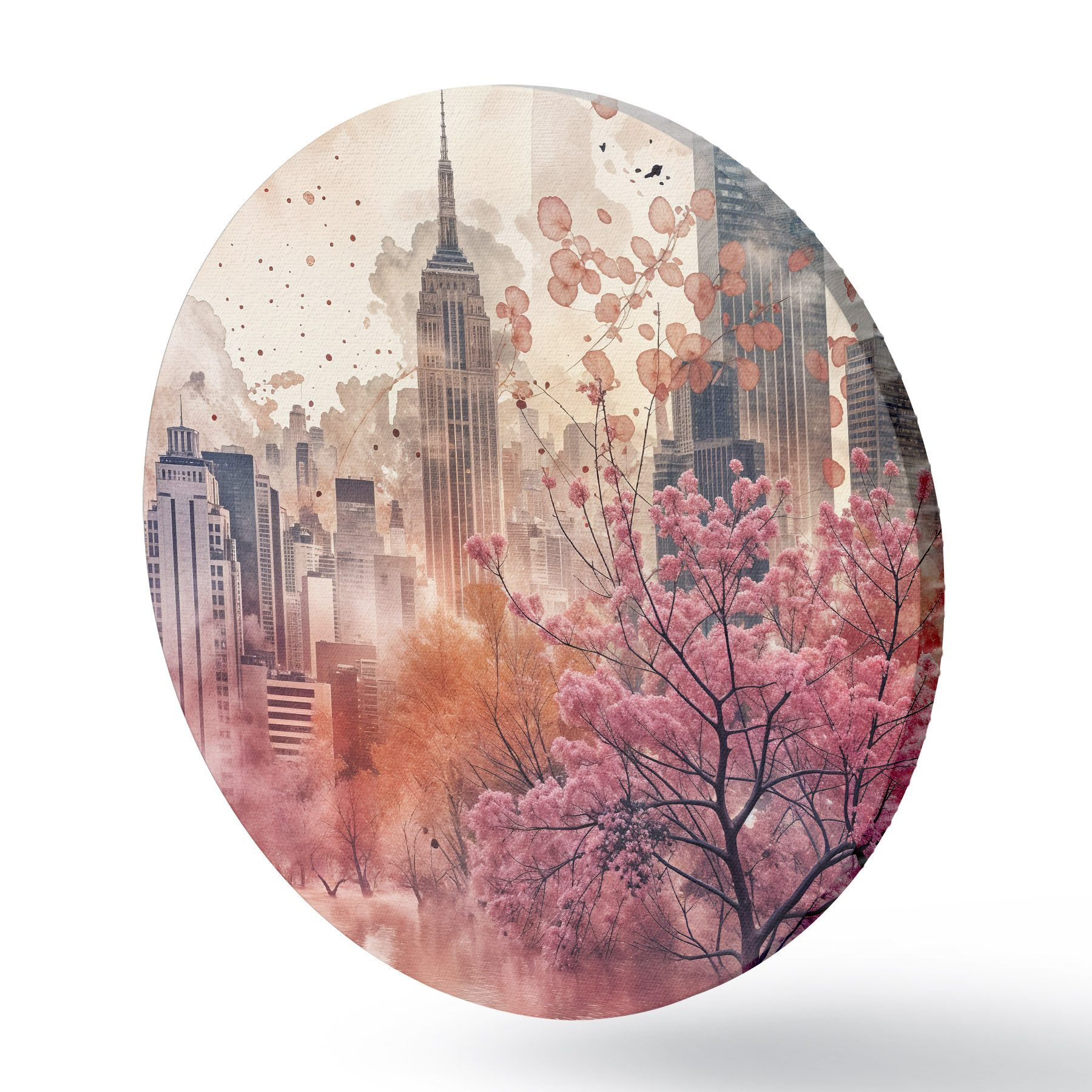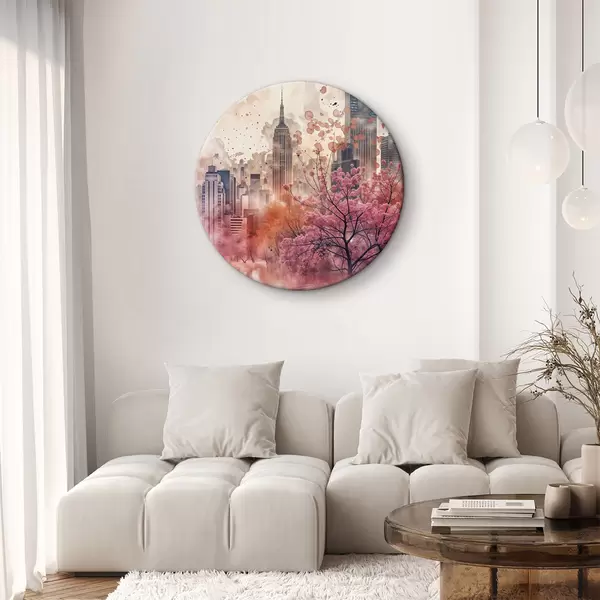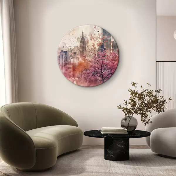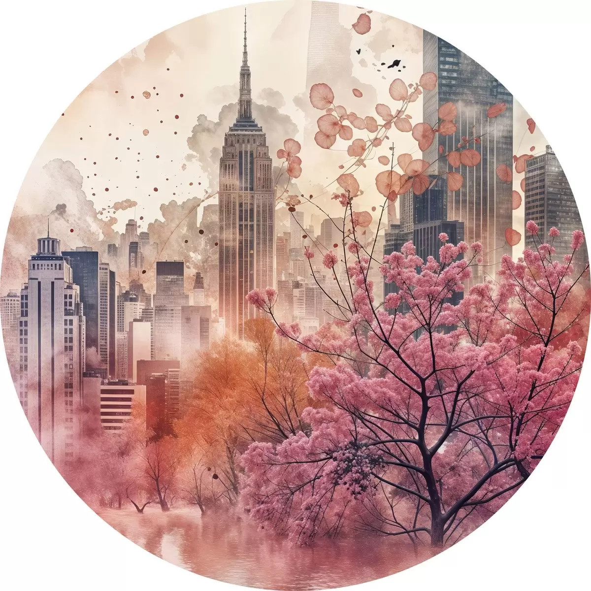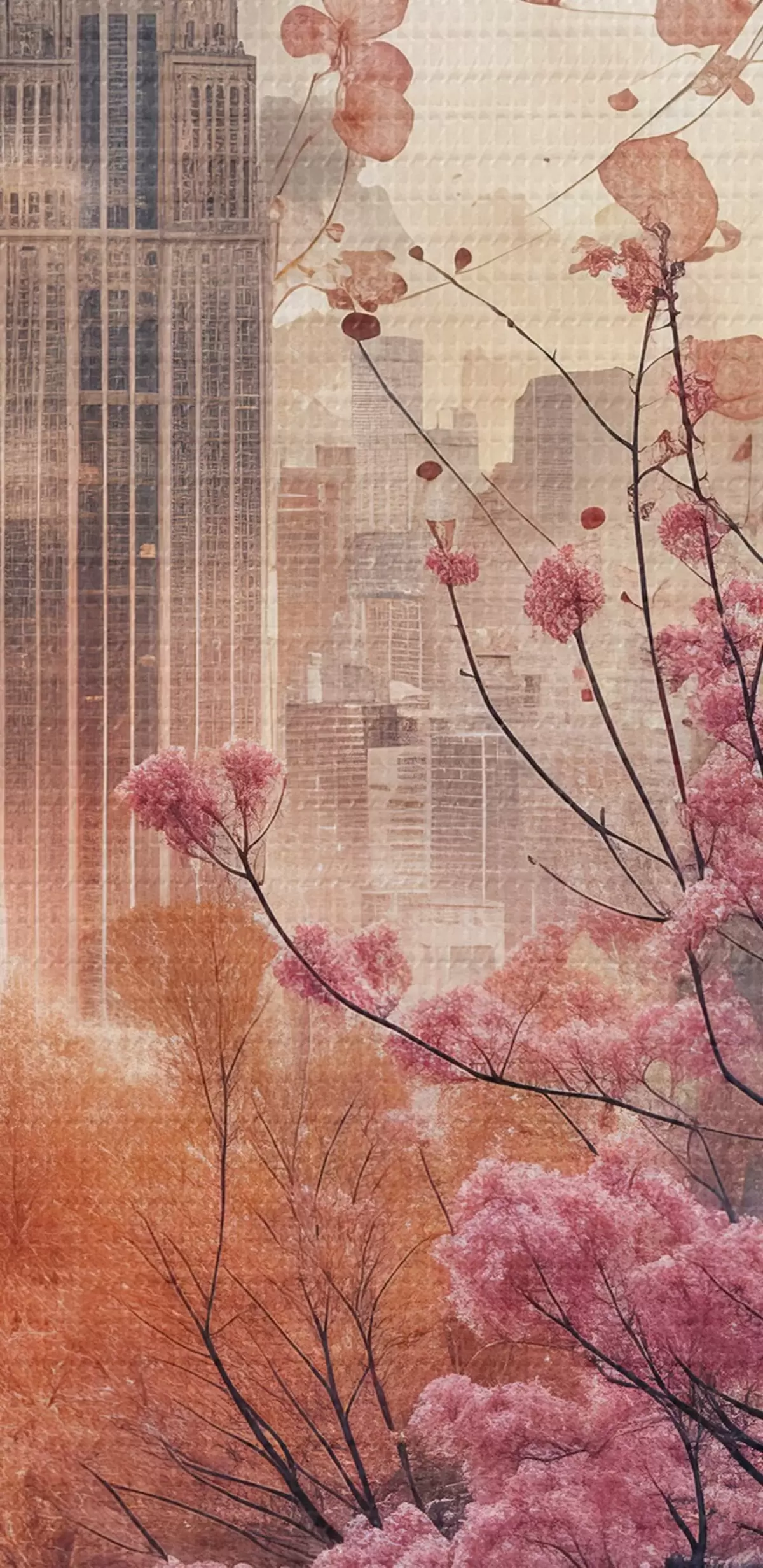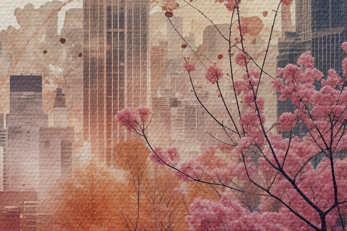 Nuotrauka Gyvybingas miesto peizažas, apsuptas žydinčių vyšnių žiedų ir primena akvarelę Nr r40026