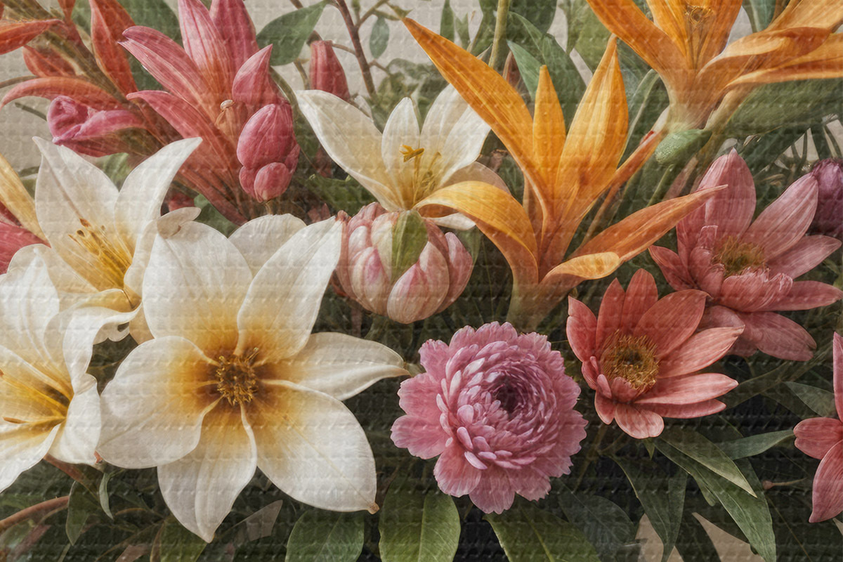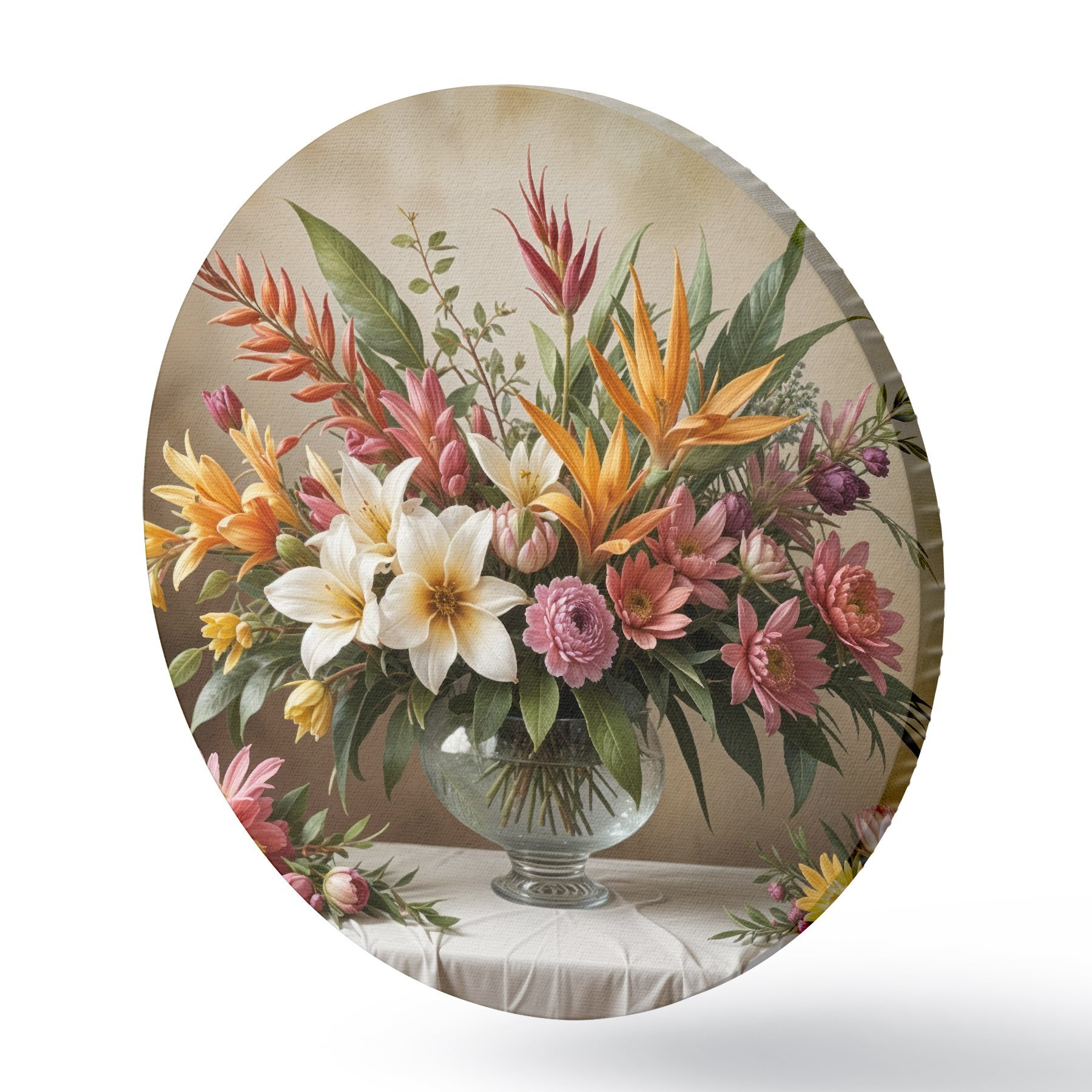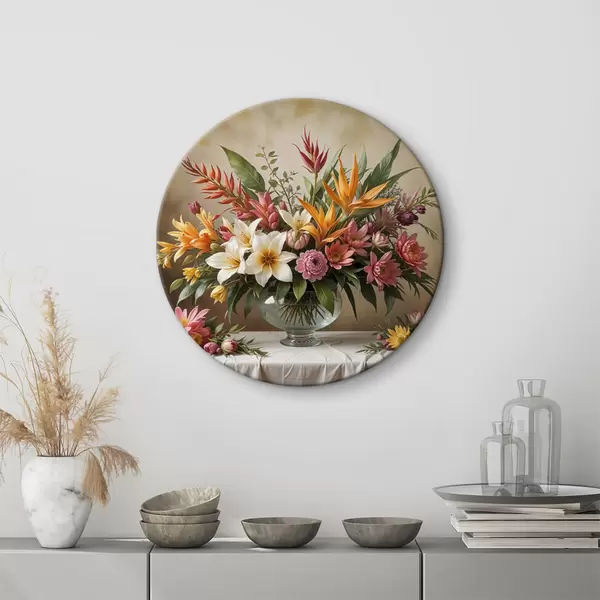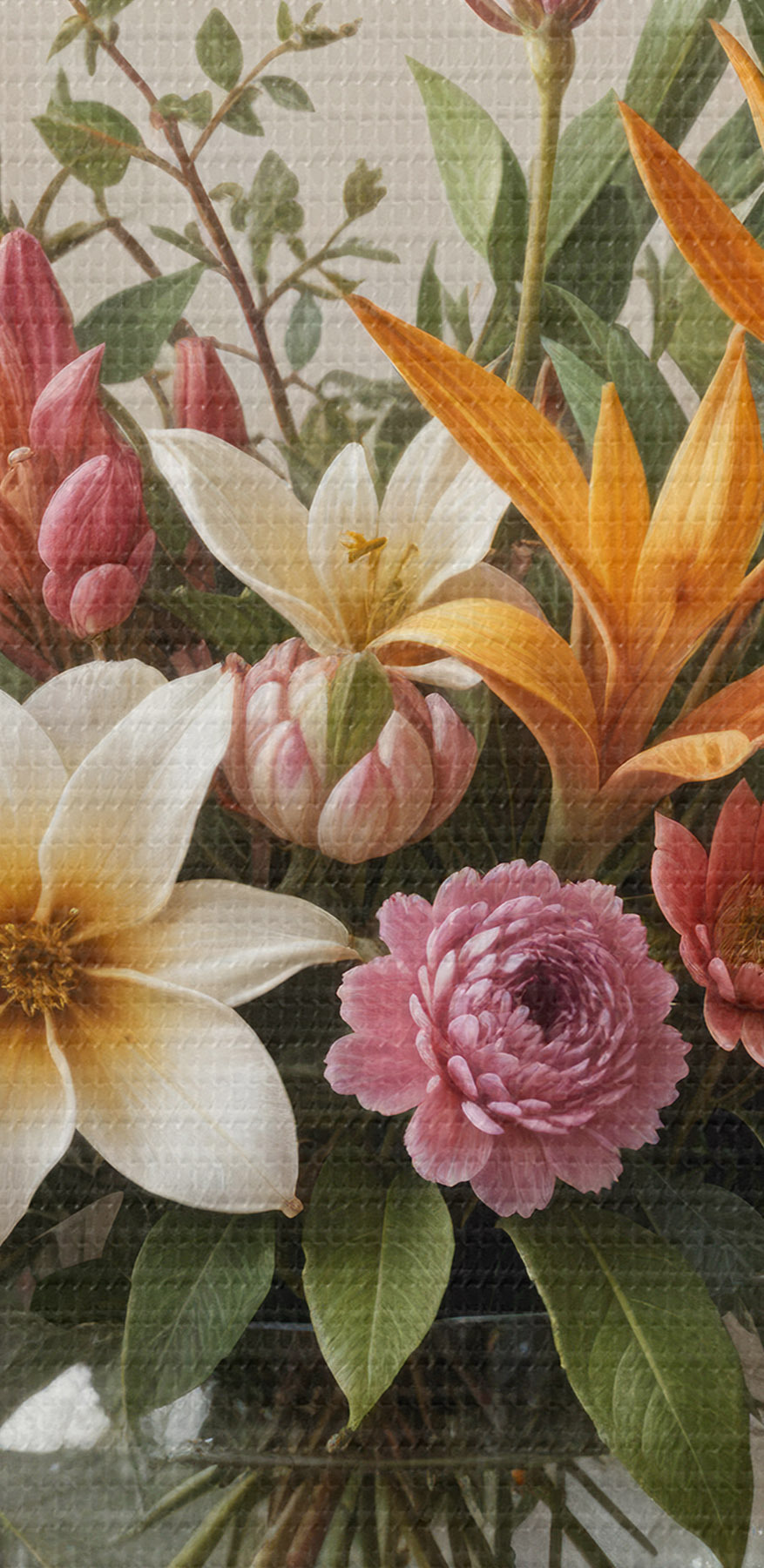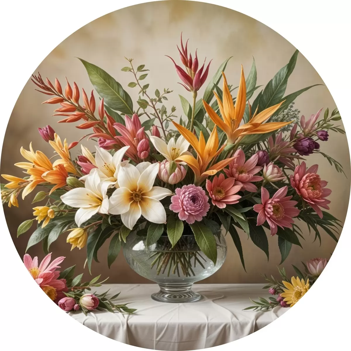 Nuotrauka Stiklinėje vazoje ant baltos staltiesės išdėliotos tropinės gėlės ir įvairūs žalumynai Nr r40028