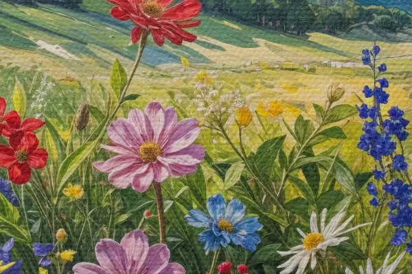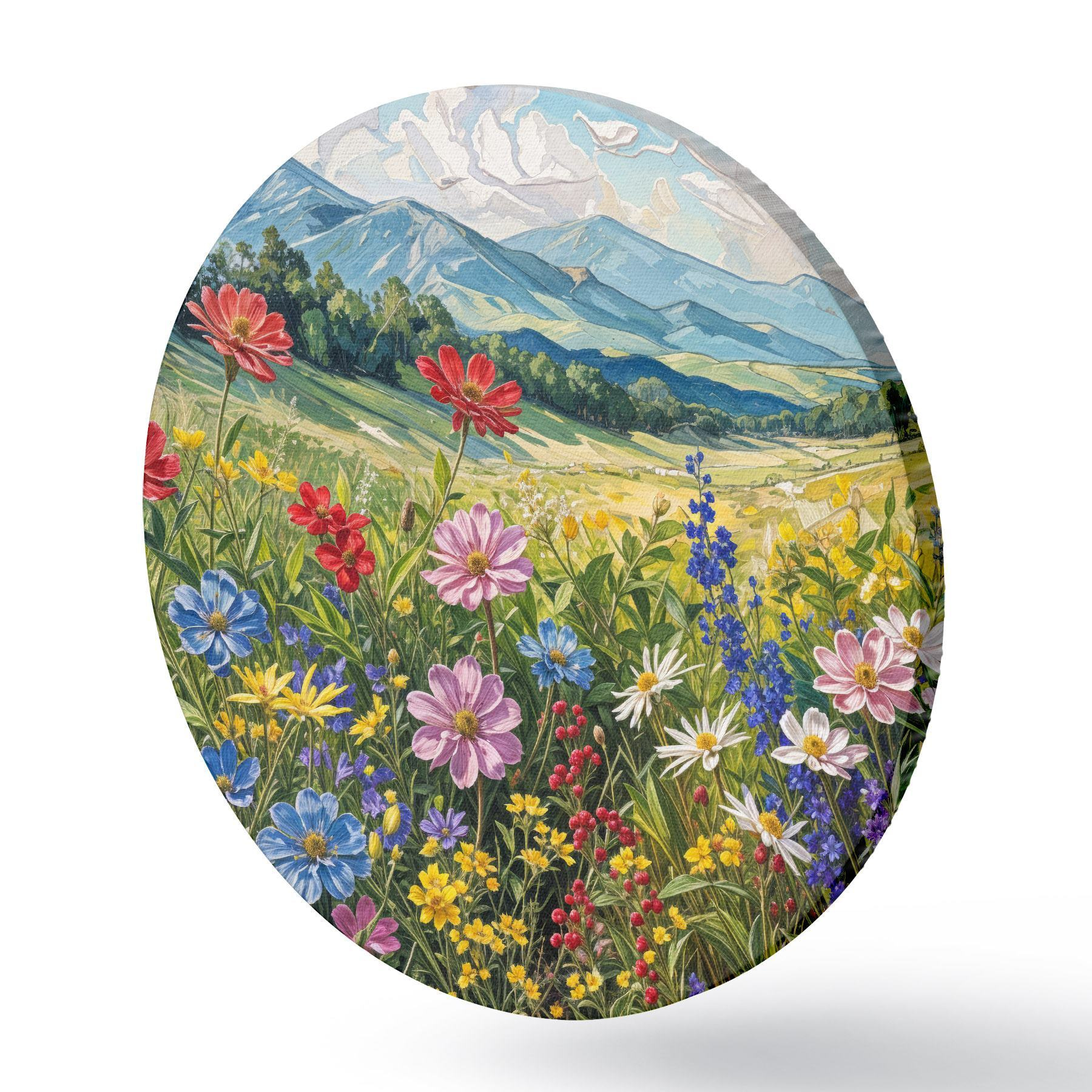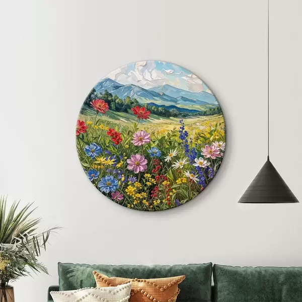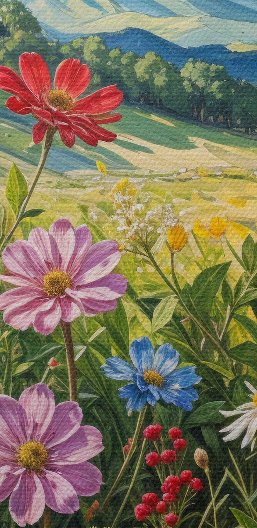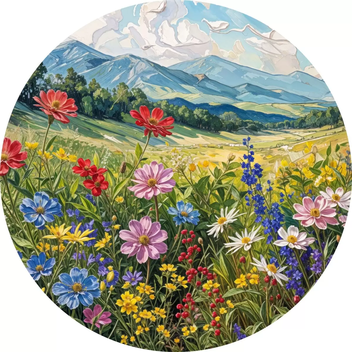 Nuotrauka Gyvybingas spalvingų lauko gėlių laukas, žydintis prieš kalnus ir kalnus po debesuotu dangumi Nr r40029