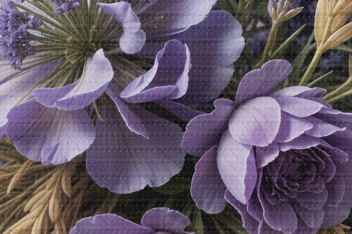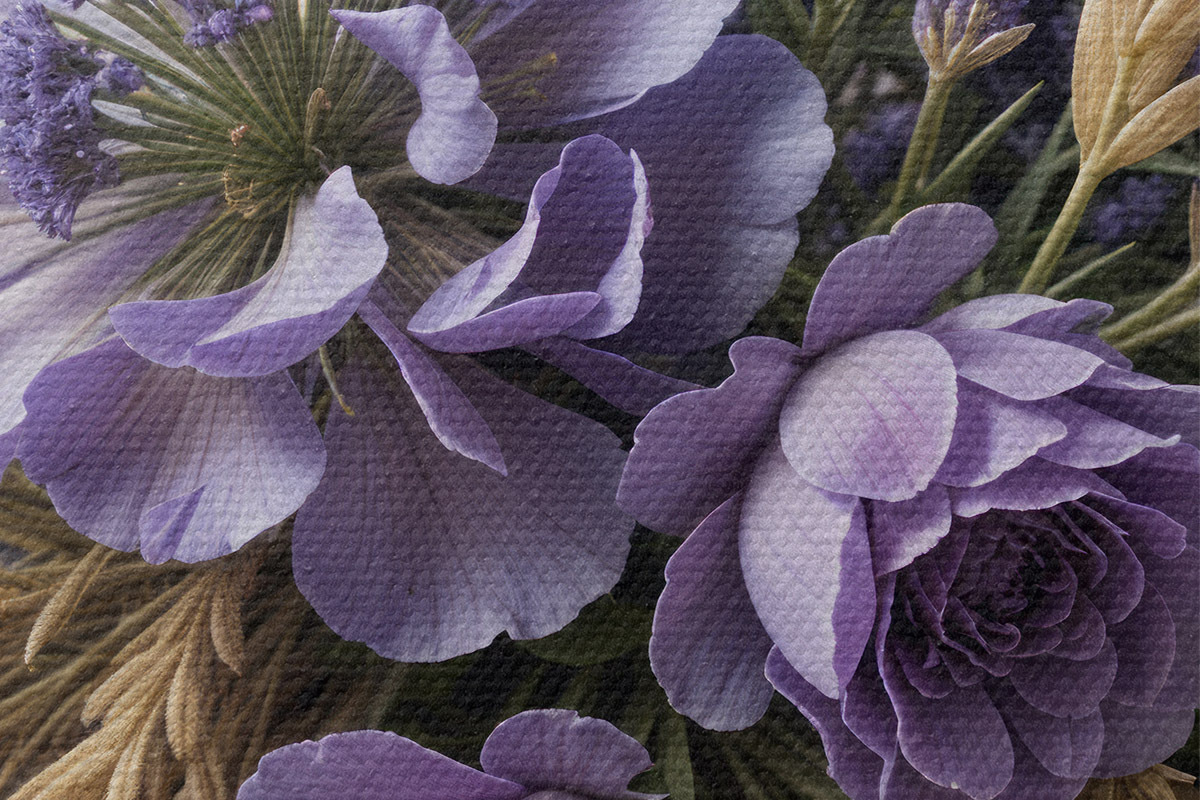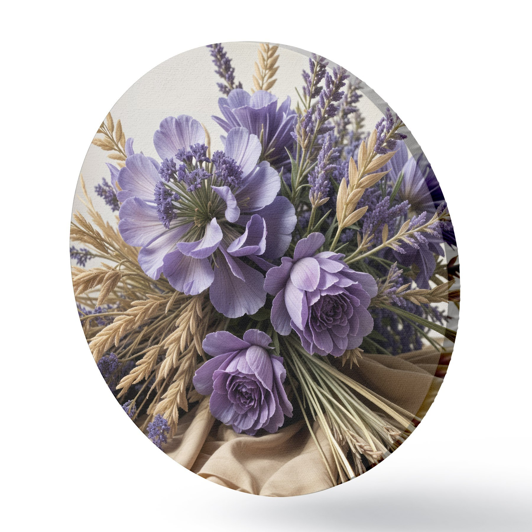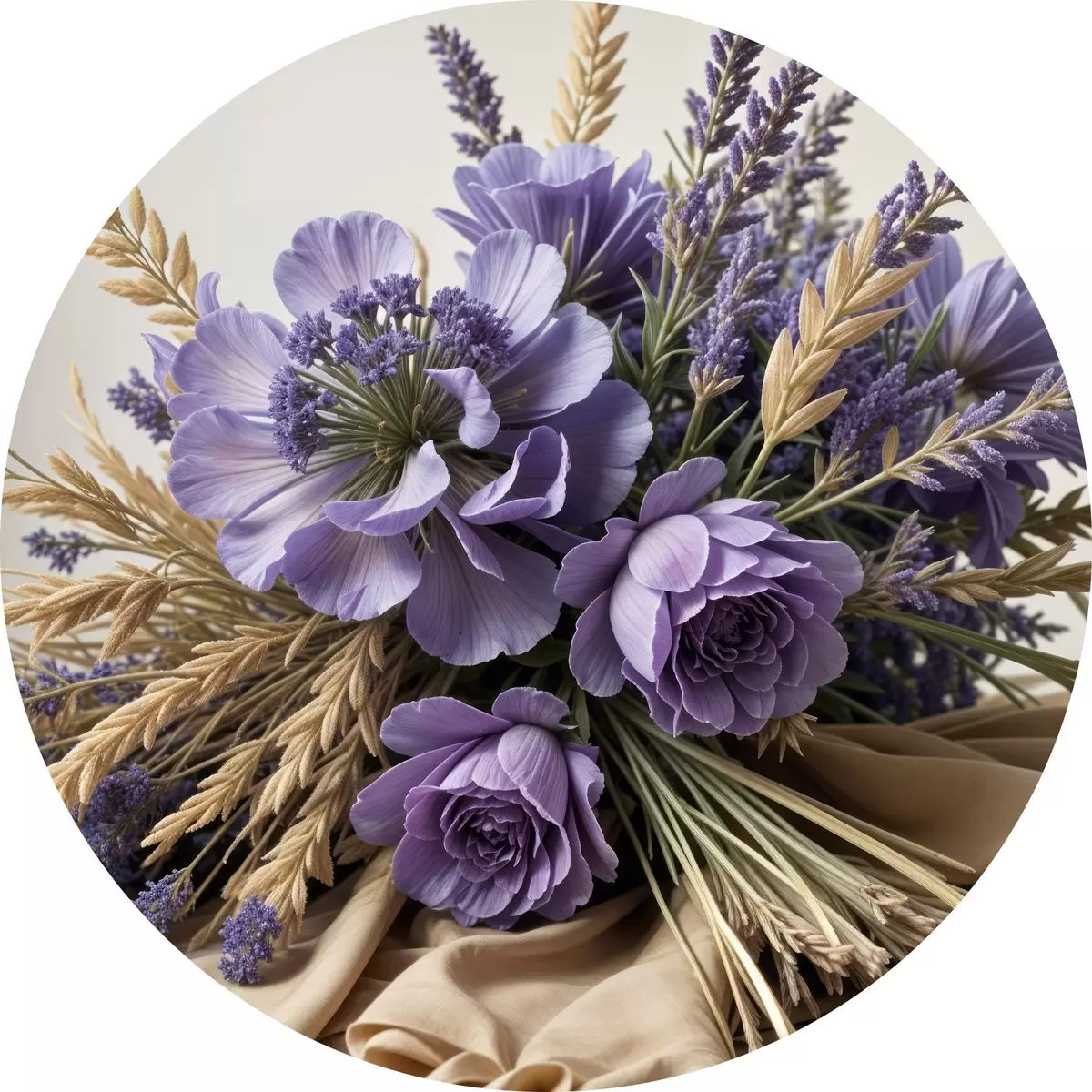 Nuotrauka Violetinių gėlių puokštė, įskaitant bijūnus ir levandas, su kviečių stiebais šviesiame fone Nr r40030