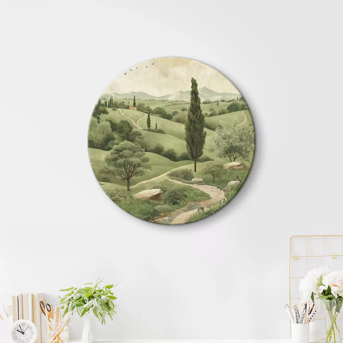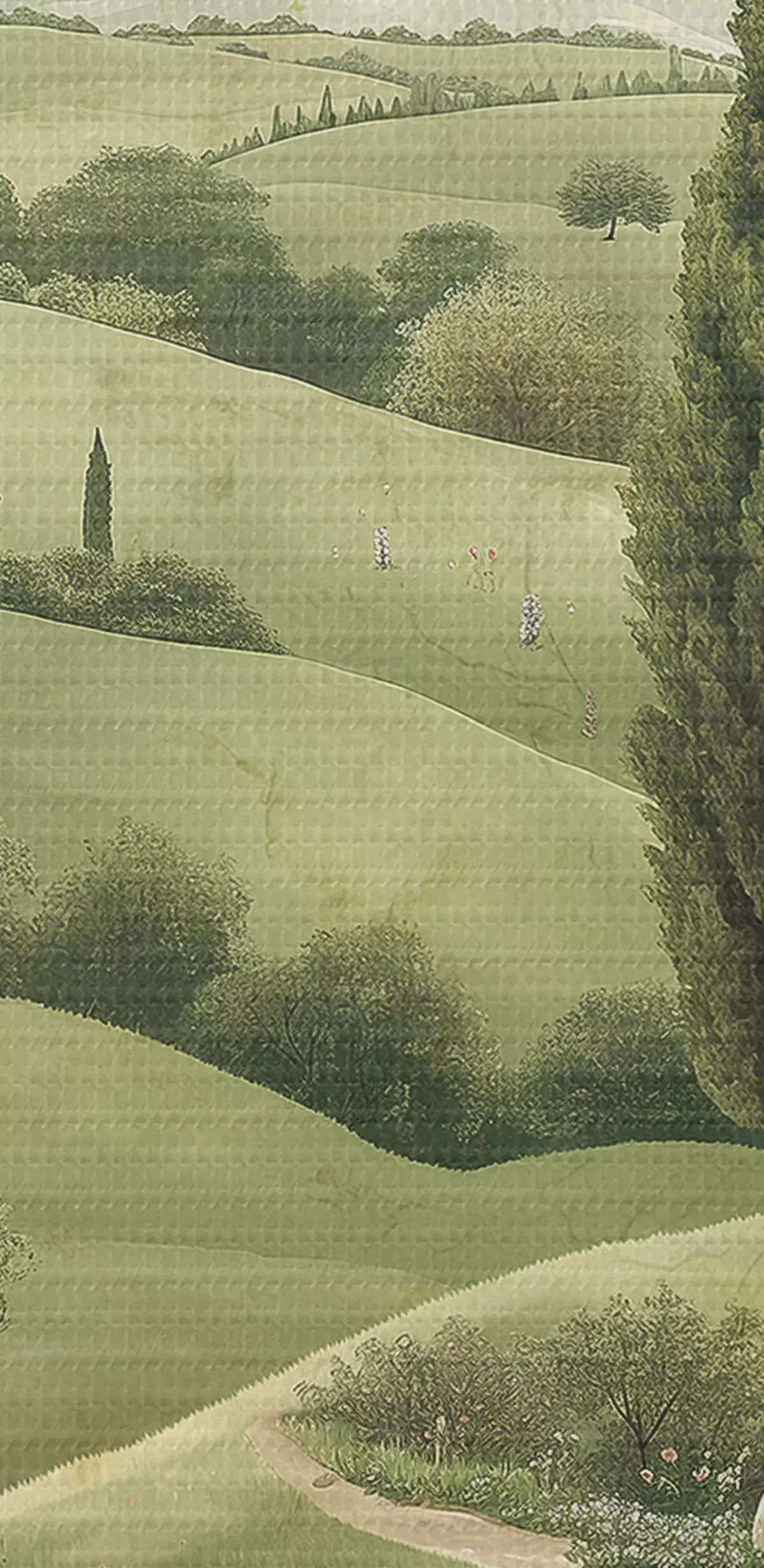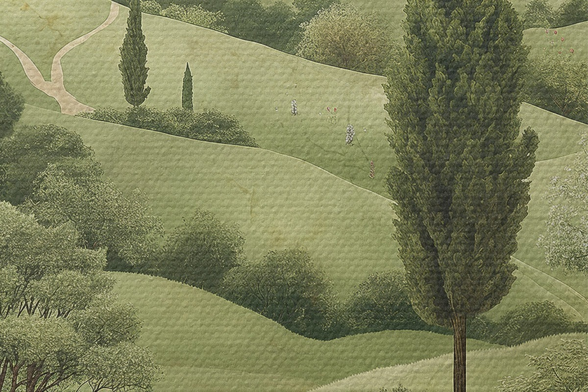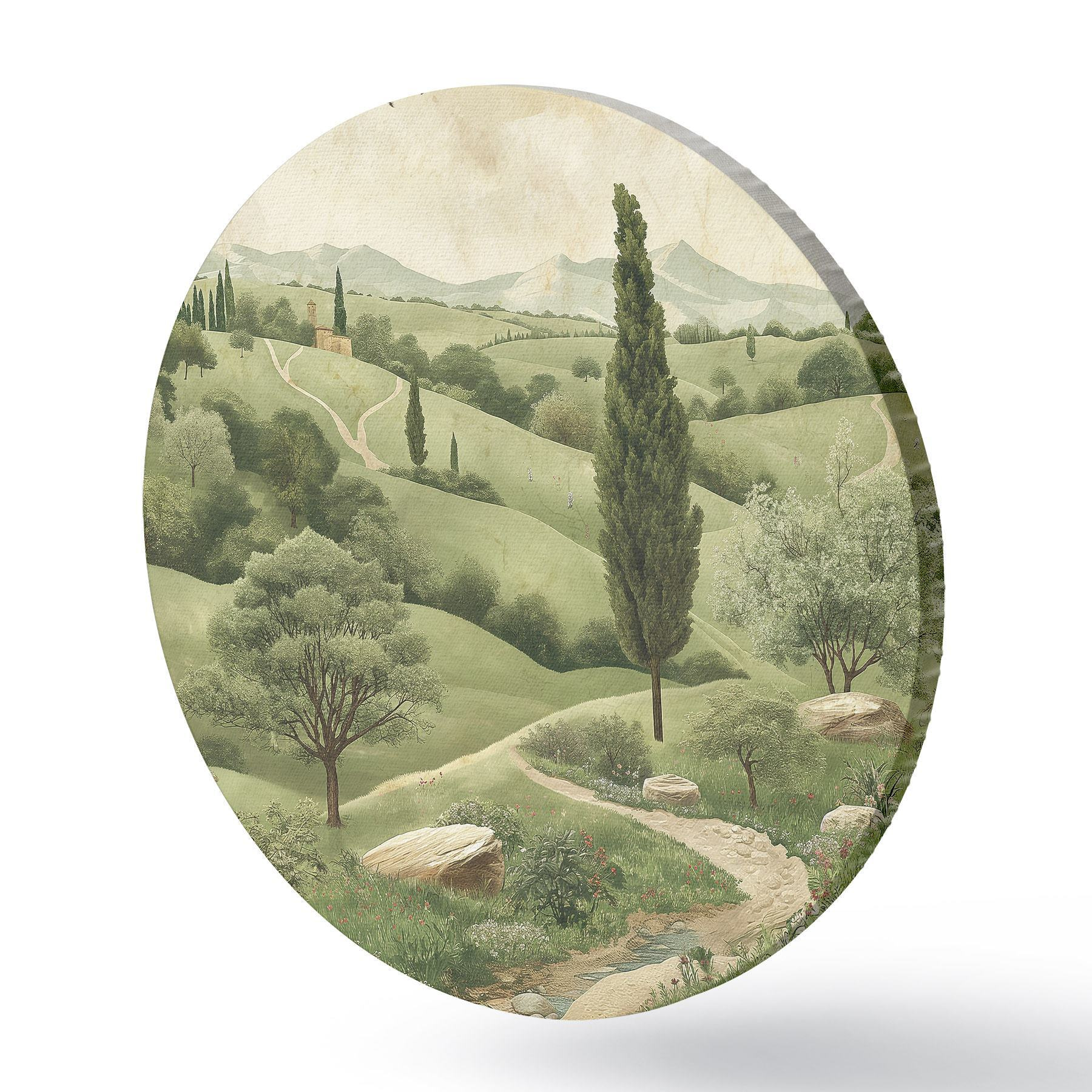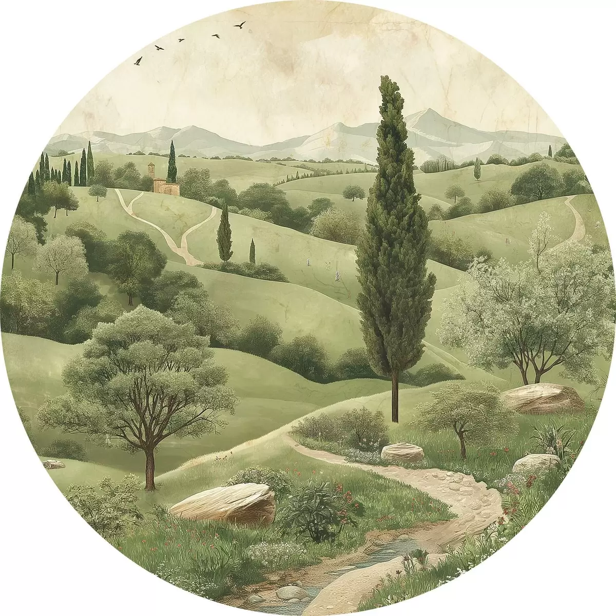 Nuotrauka Toskanos kraštovaizdis, vintažinis stilius, pastelinės žalios spalvos, kalvos ir medžiai Nr r40075