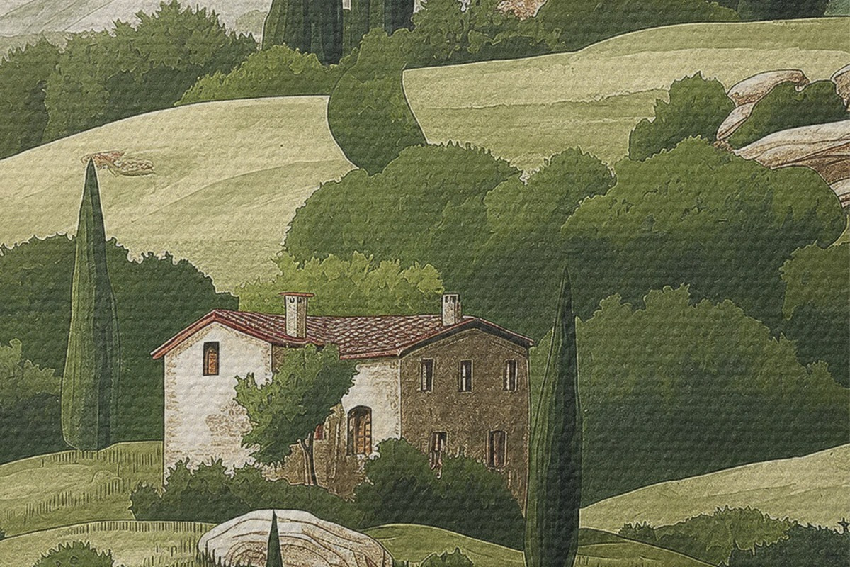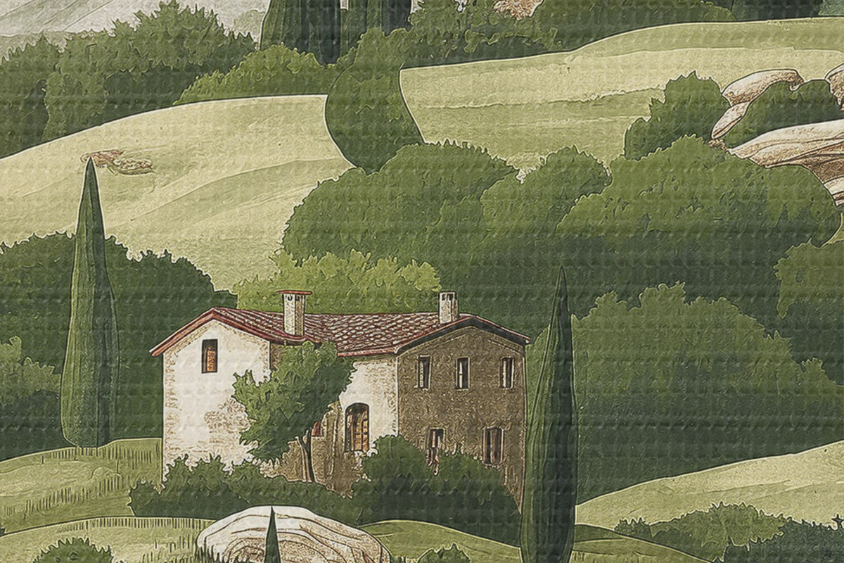 Nuotrauka Peizažas su vintažiniais namais, pastelinės žalios spalvos, akrilo piešinys, kaimiškas Nr r40080