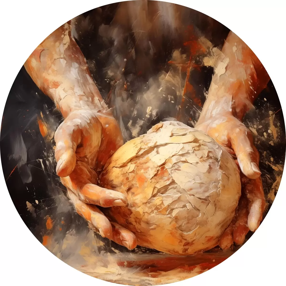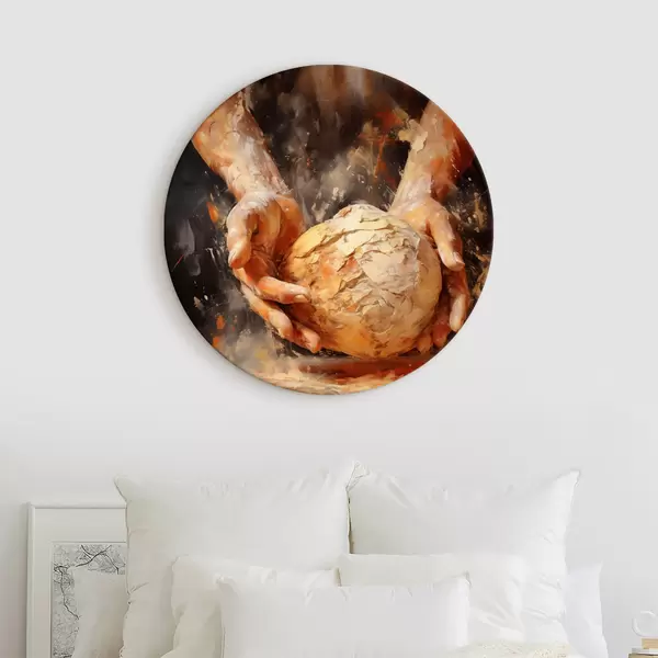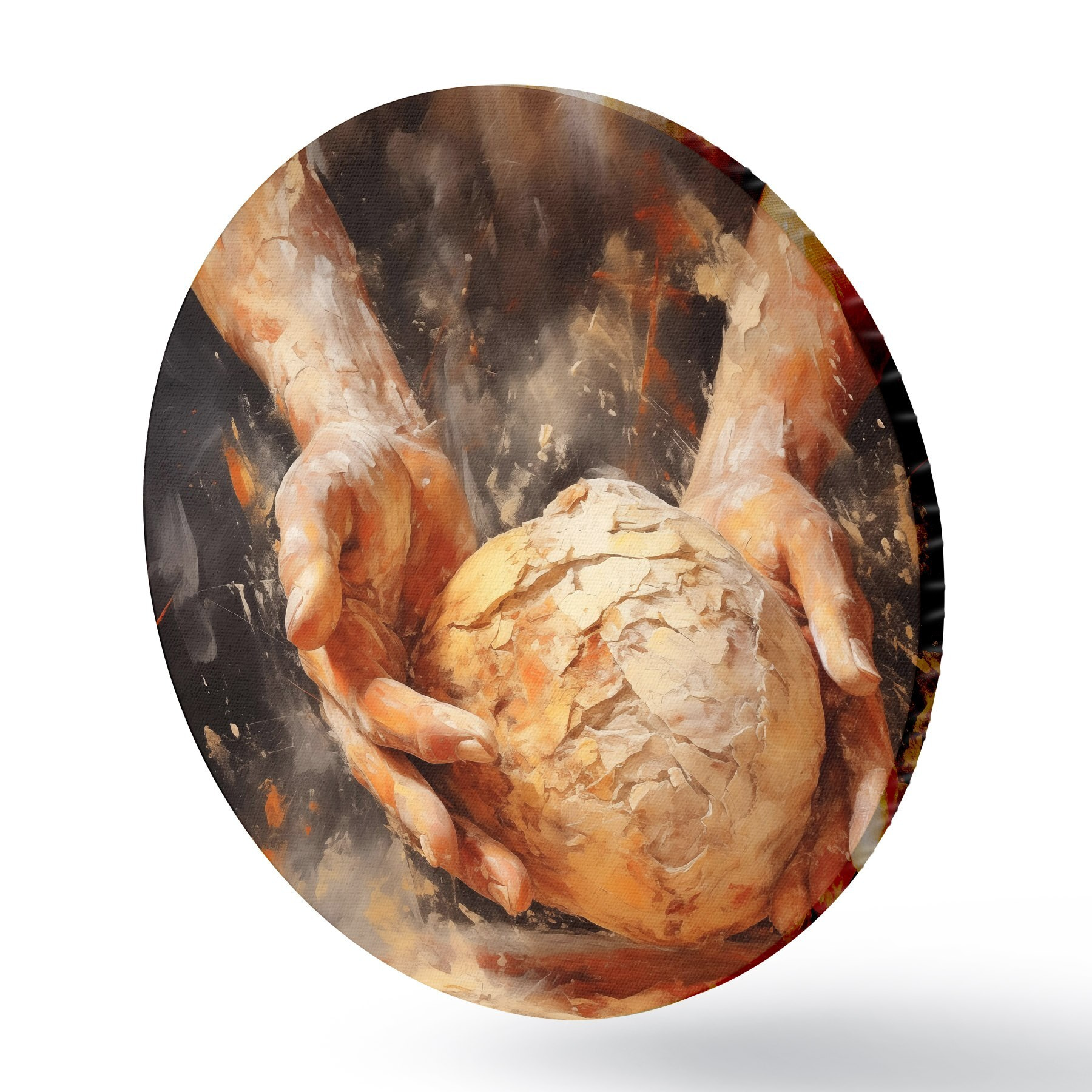 Nuotrauka Kepėjo rankos laiko tešlą imituojantį aliejinį paveikslą Nr r40095