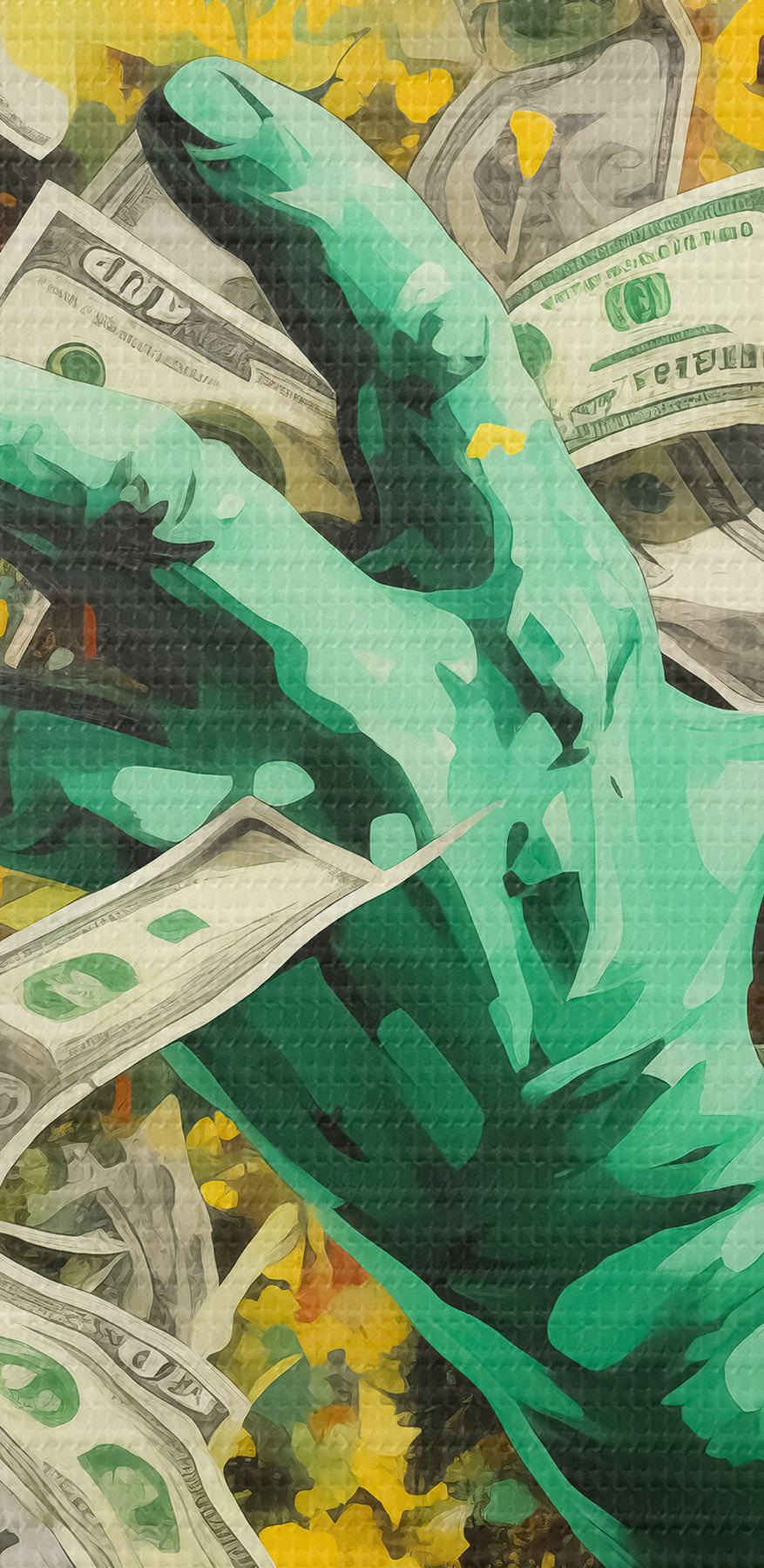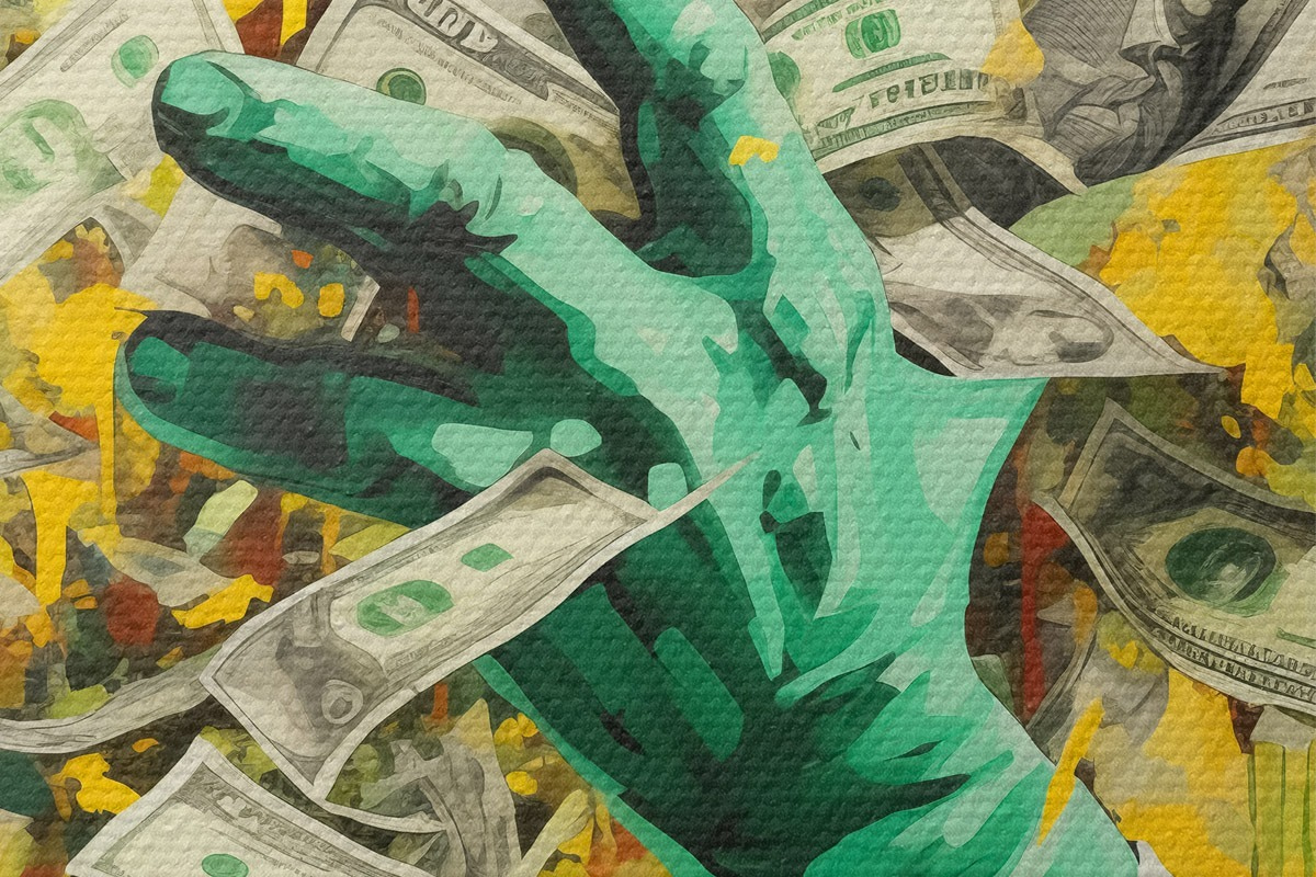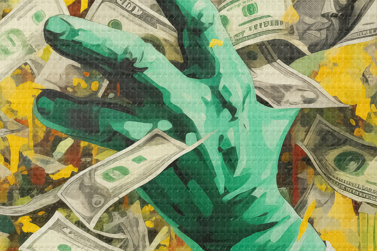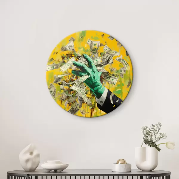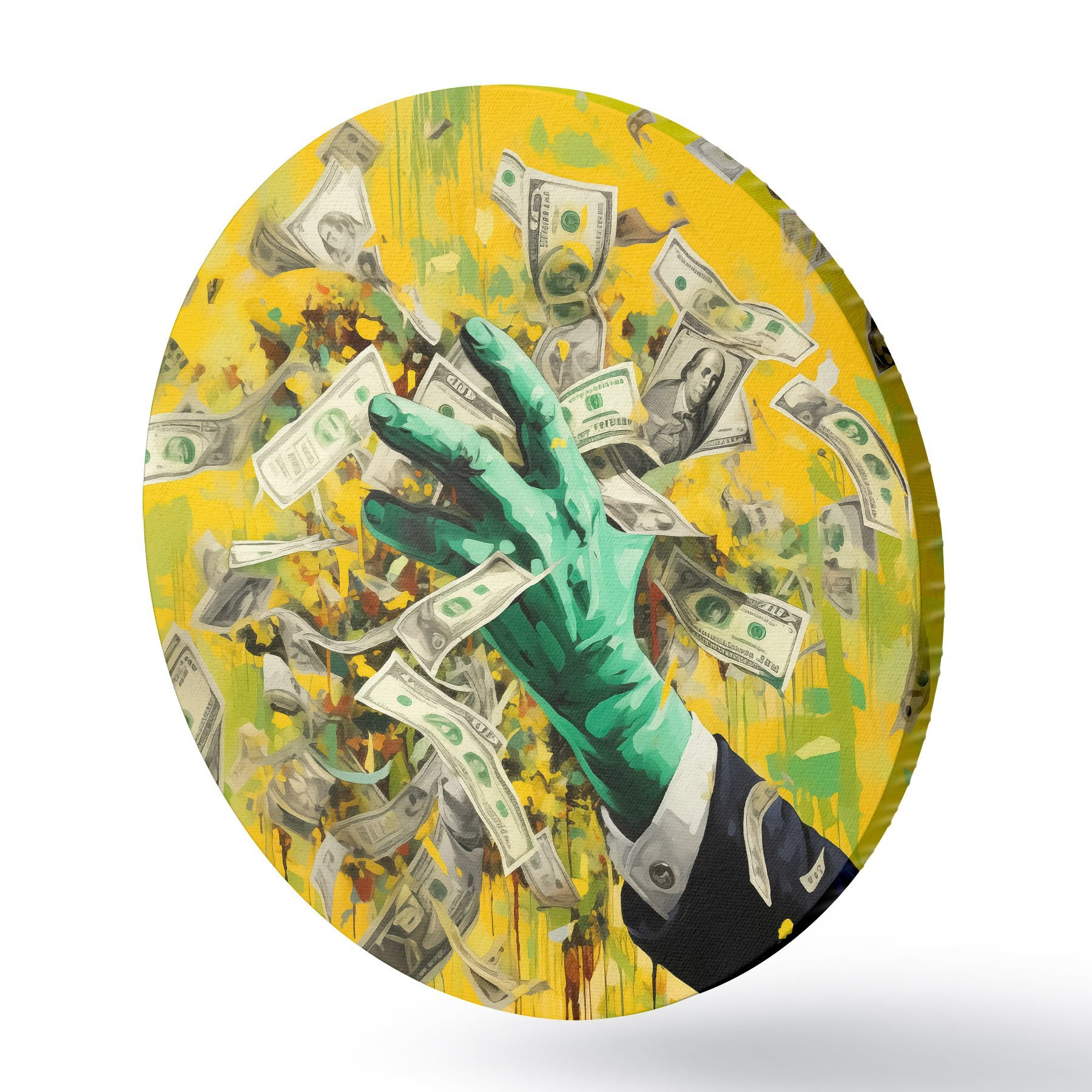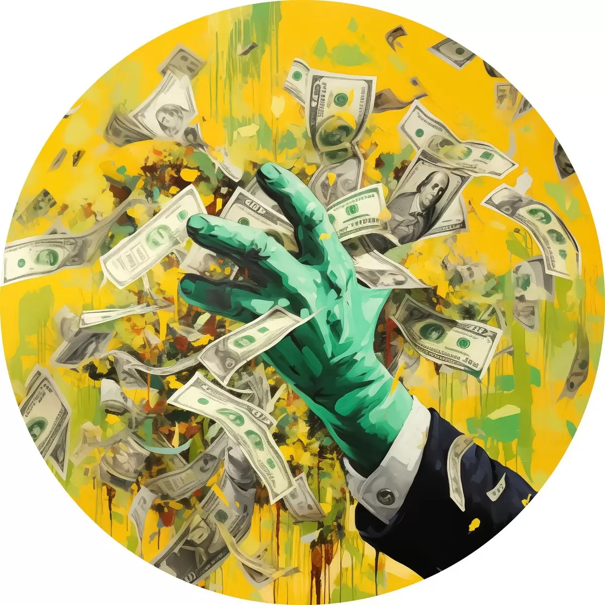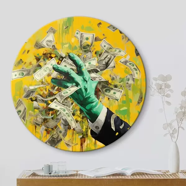 Nuotrauka Žalia ranka švarke griebia popierines kupiūras, pinigus, geltoną foną, aliejinės tapybos imitaciją Nr r40097
