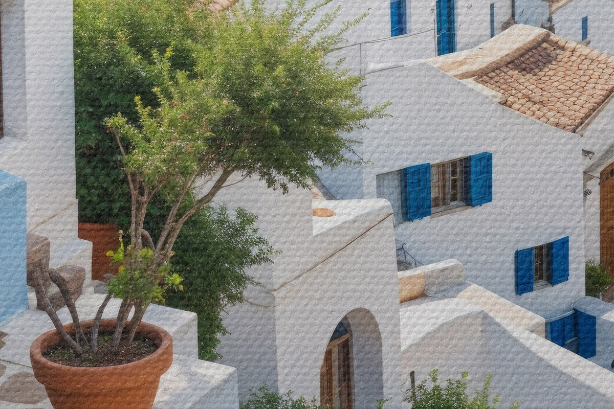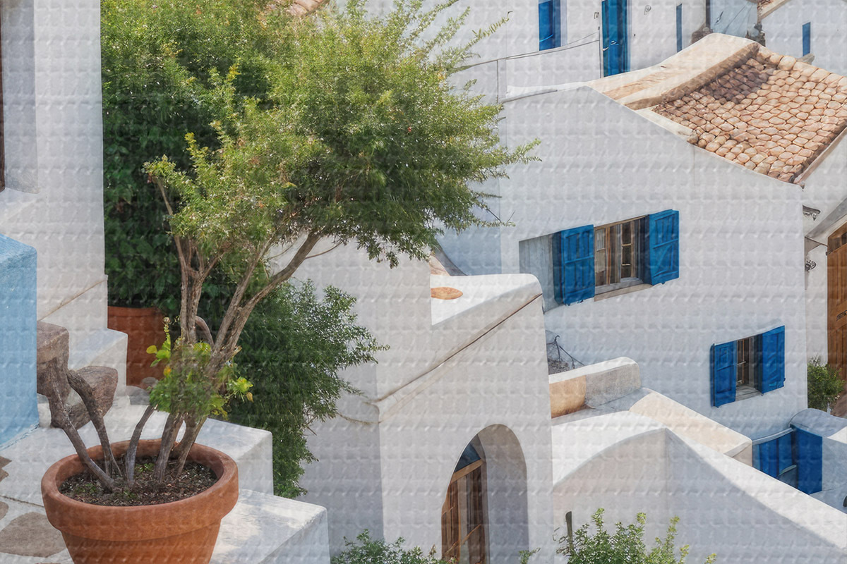 Nuotrauka Vaizdingas pakrantės miestelis su baltais pastatais, mėlynais langais ir siauromis gatvelėmis išklotais vazoniniais augalais Nr r40148
