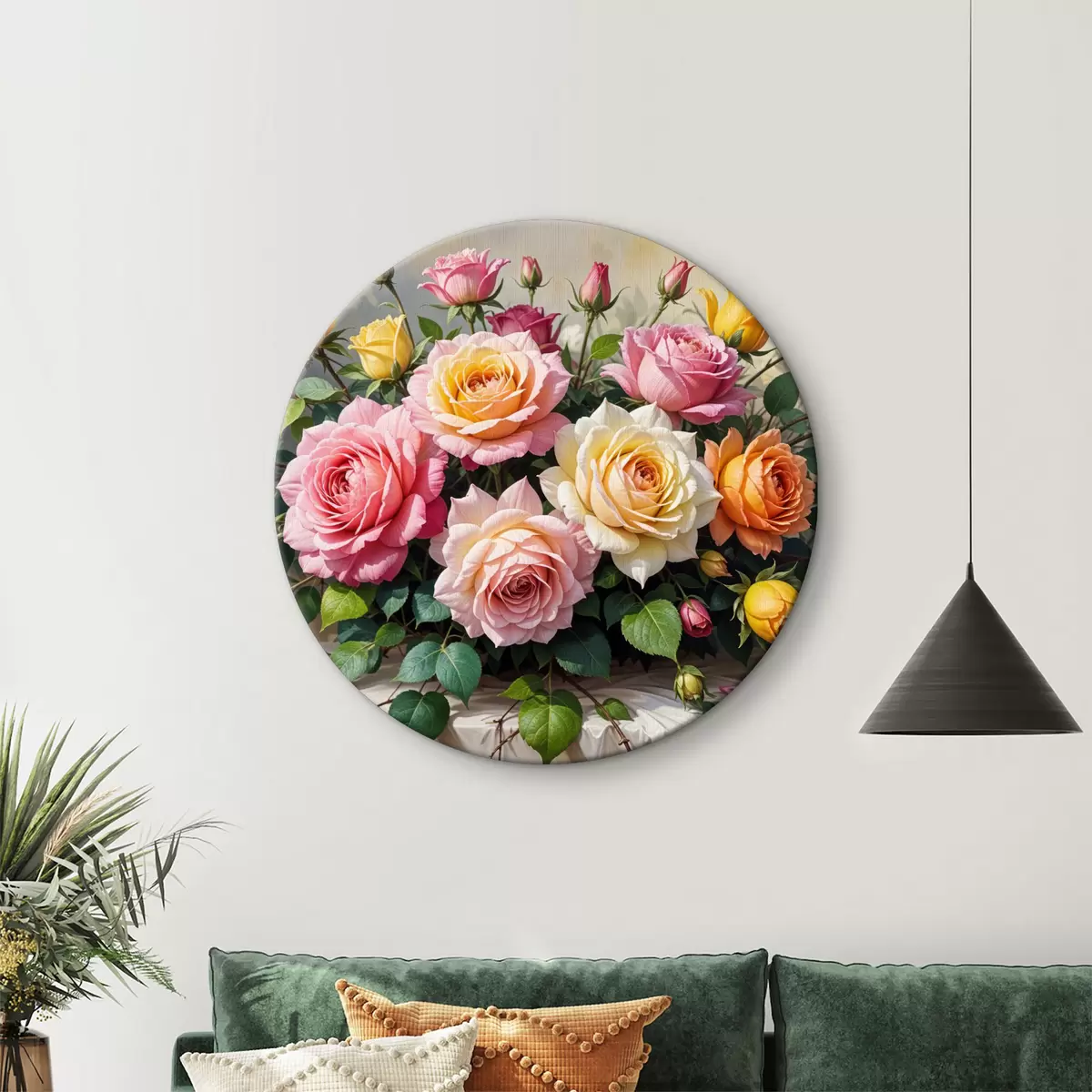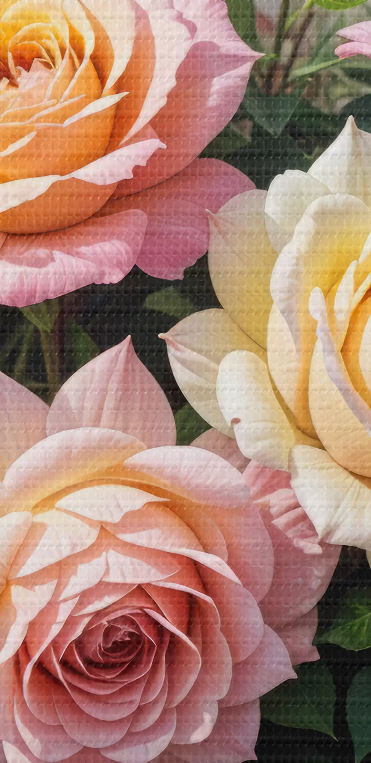 Nuotrauka Įvairių rožinių, geltonų ir oranžinių atspalvių spalvingų rožių puokštė su žaliais lapeliais Nr r40149