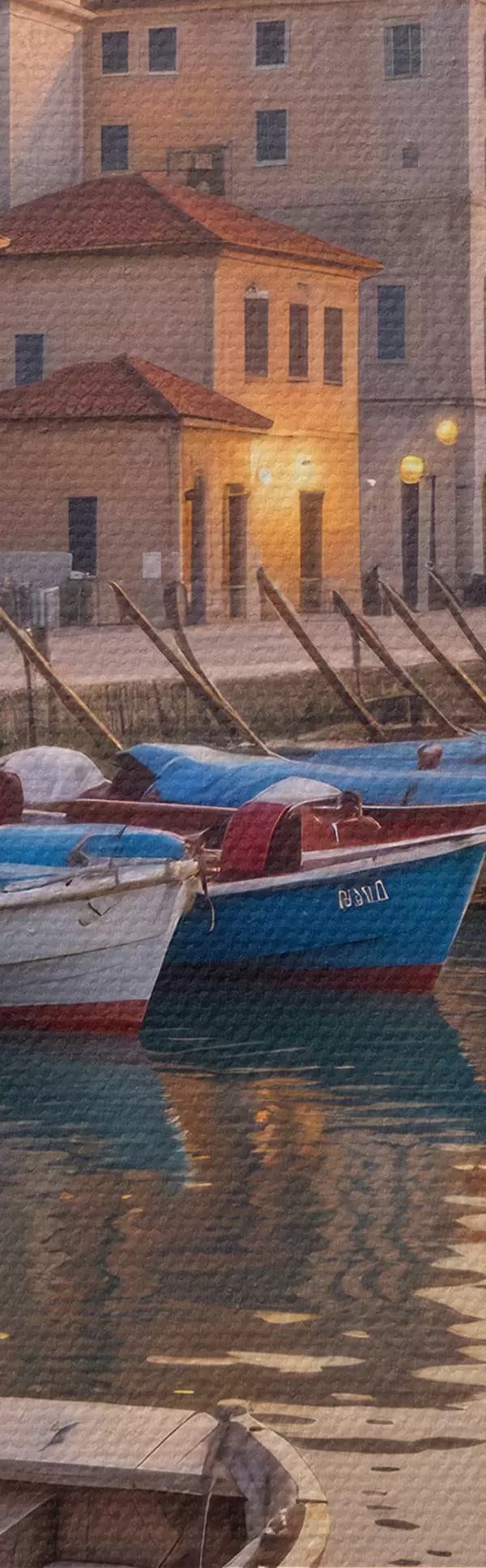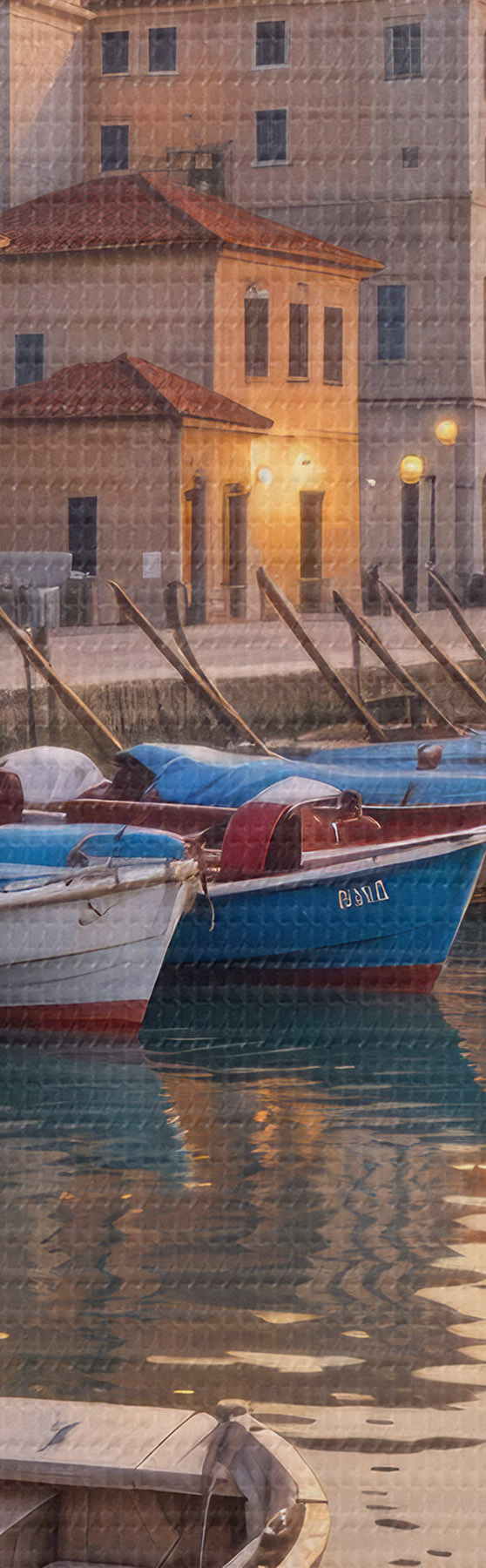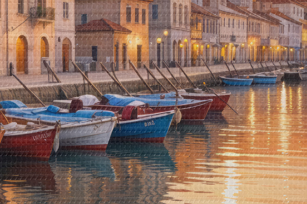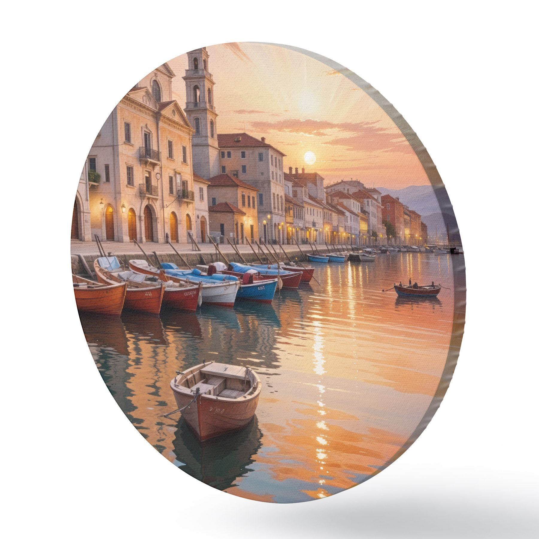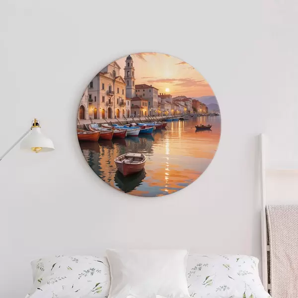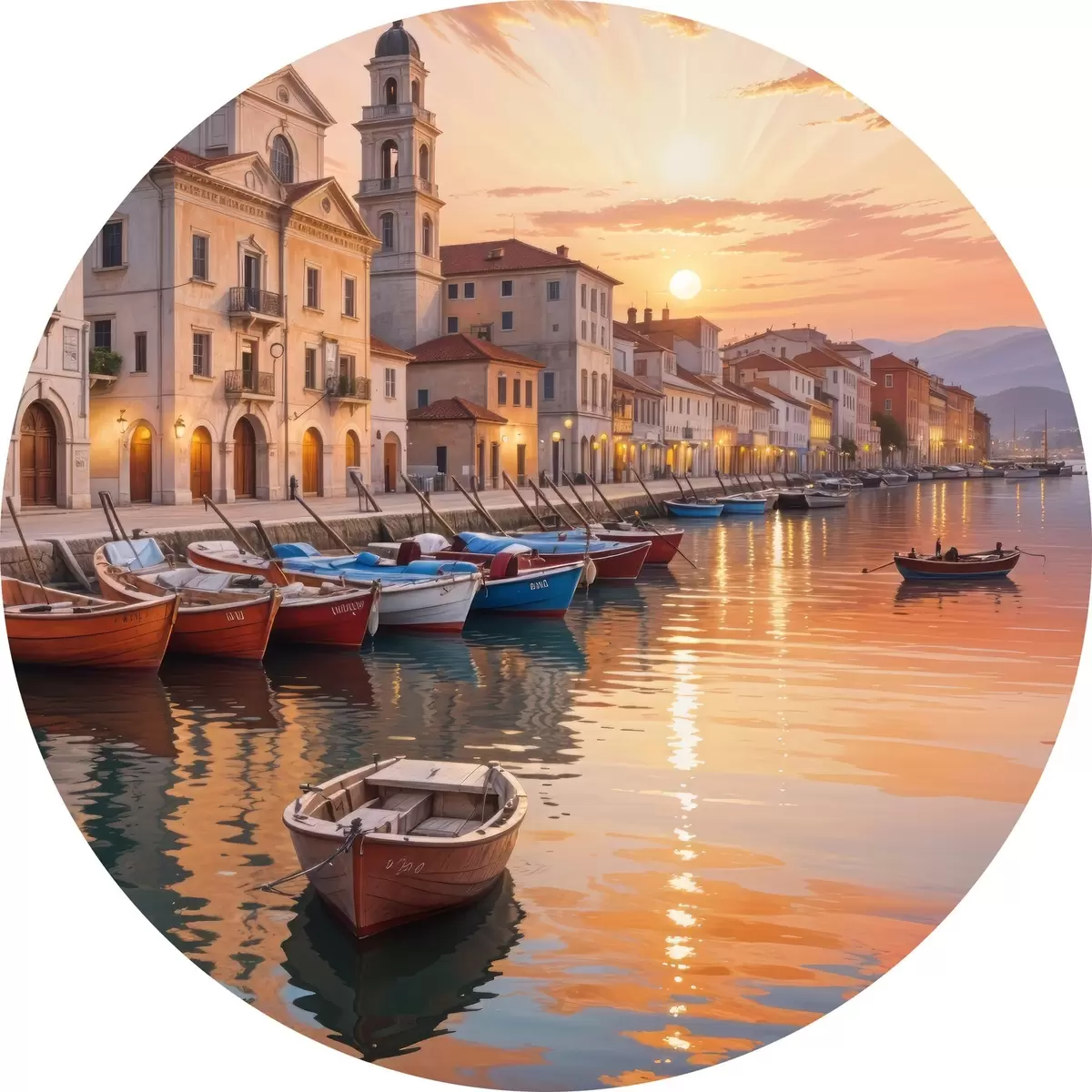 Nuotrauka Italijos pakrantės miestelis saulėlydžio metu su spalvingais pastatais, išsidėsčiusiais pakrantėje ir valtimis plaukiojančiais ramiuose vandenyse Nr r40150