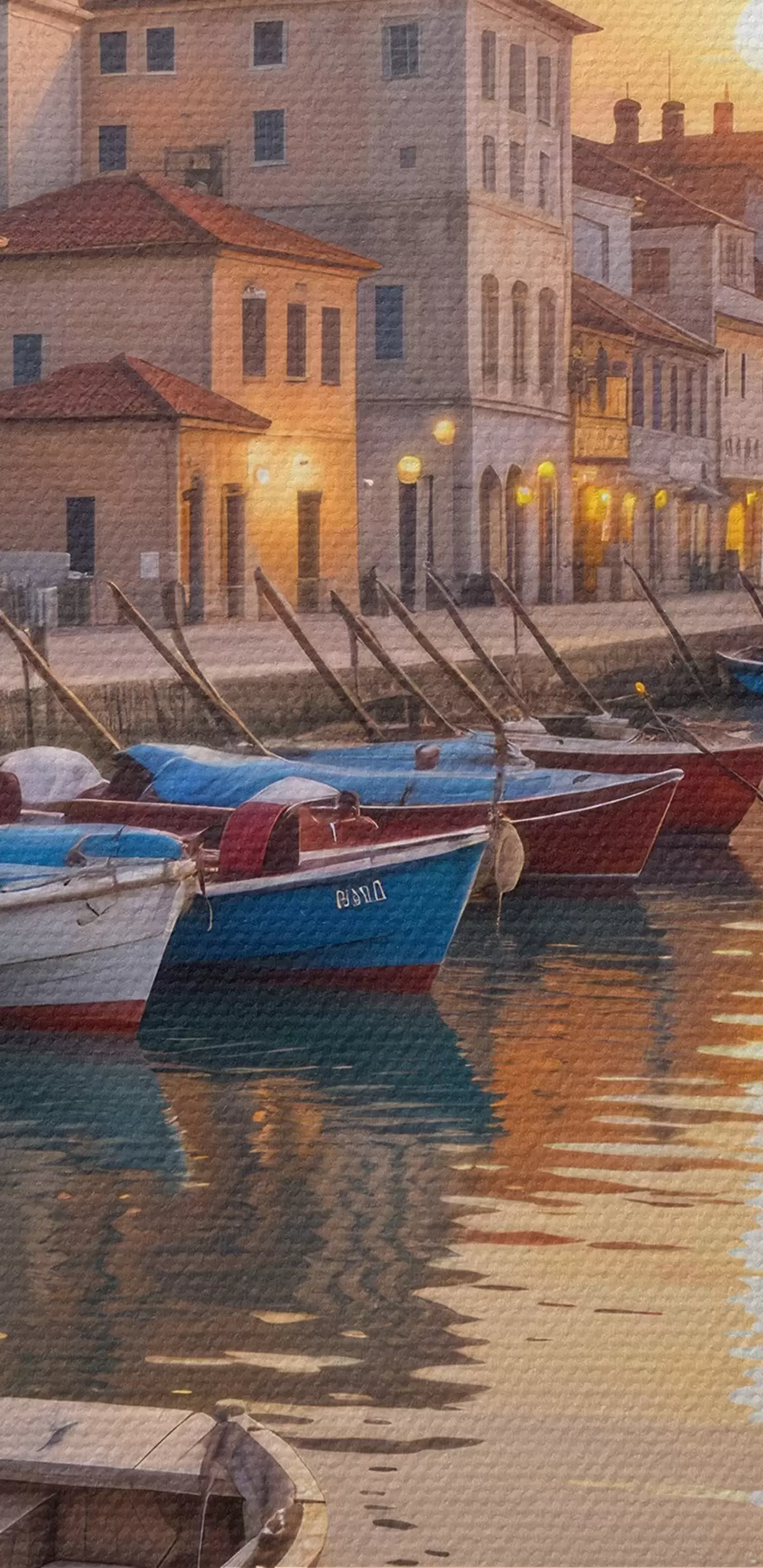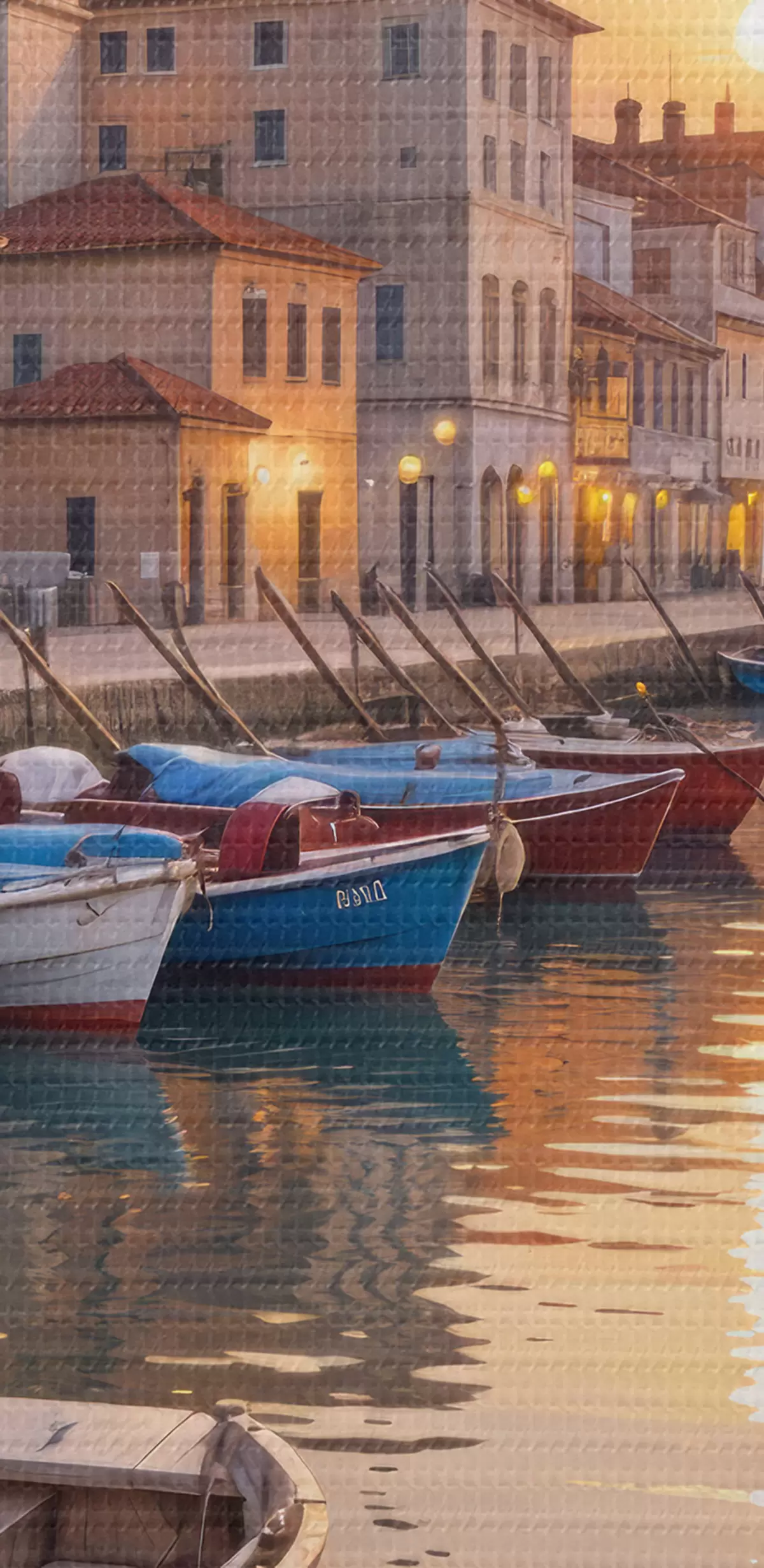 Nuotrauka Italijos pakrantės miestelis saulėlydžio metu su spalvingais pastatais, išsidėsčiusiais pakrantėje ir valtimis plaukiojančiais ramiuose vandenyse Nr r40150