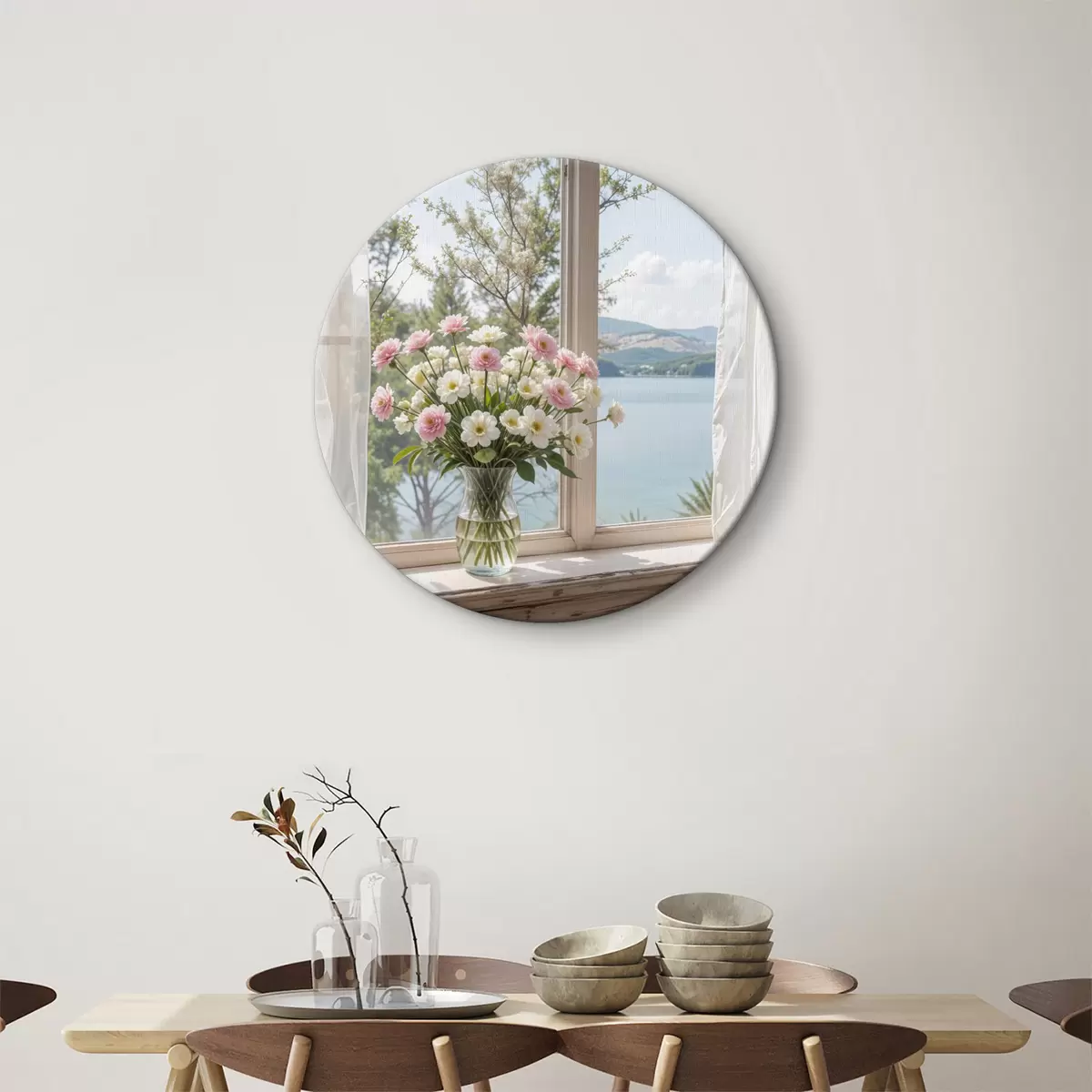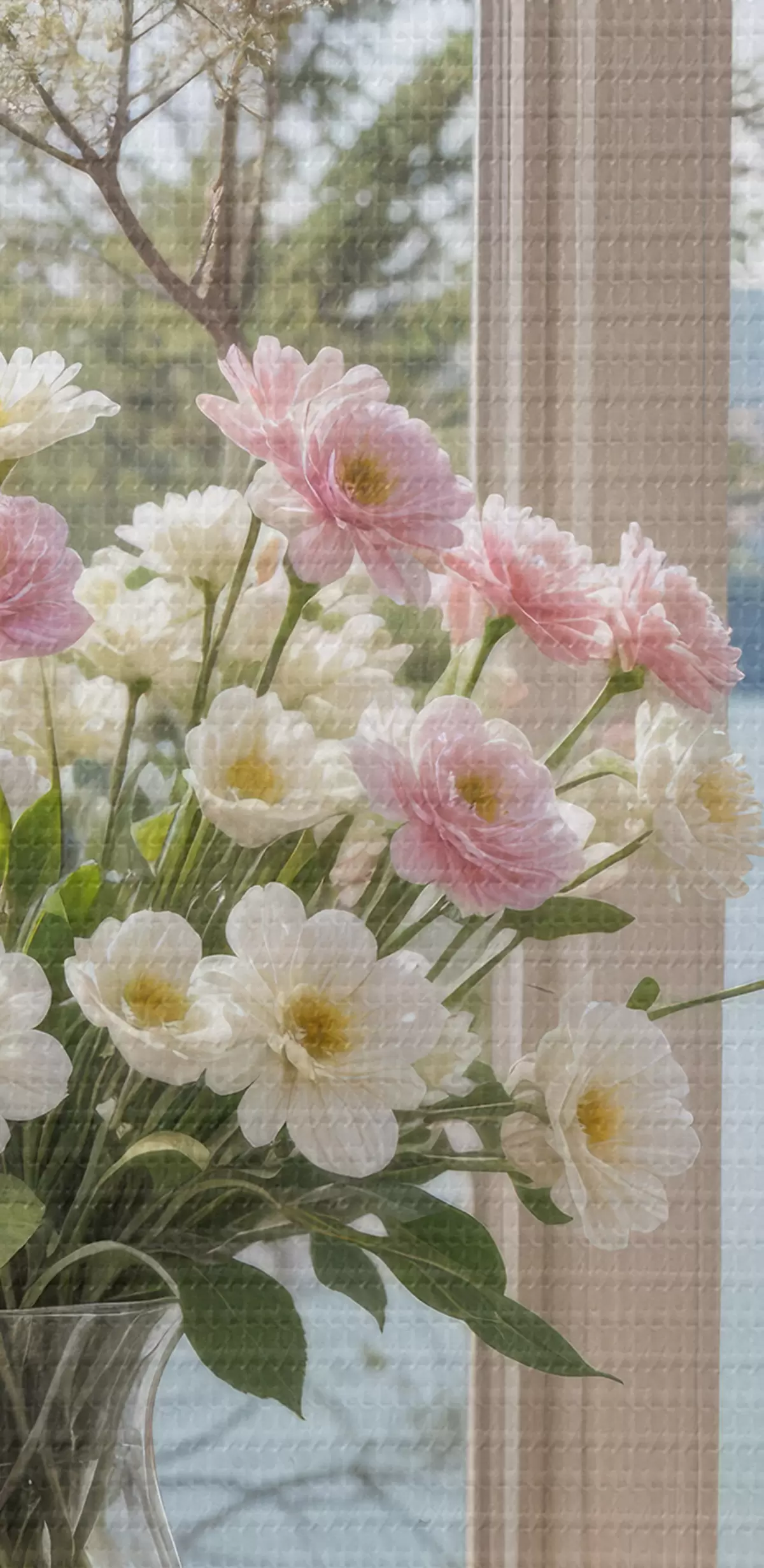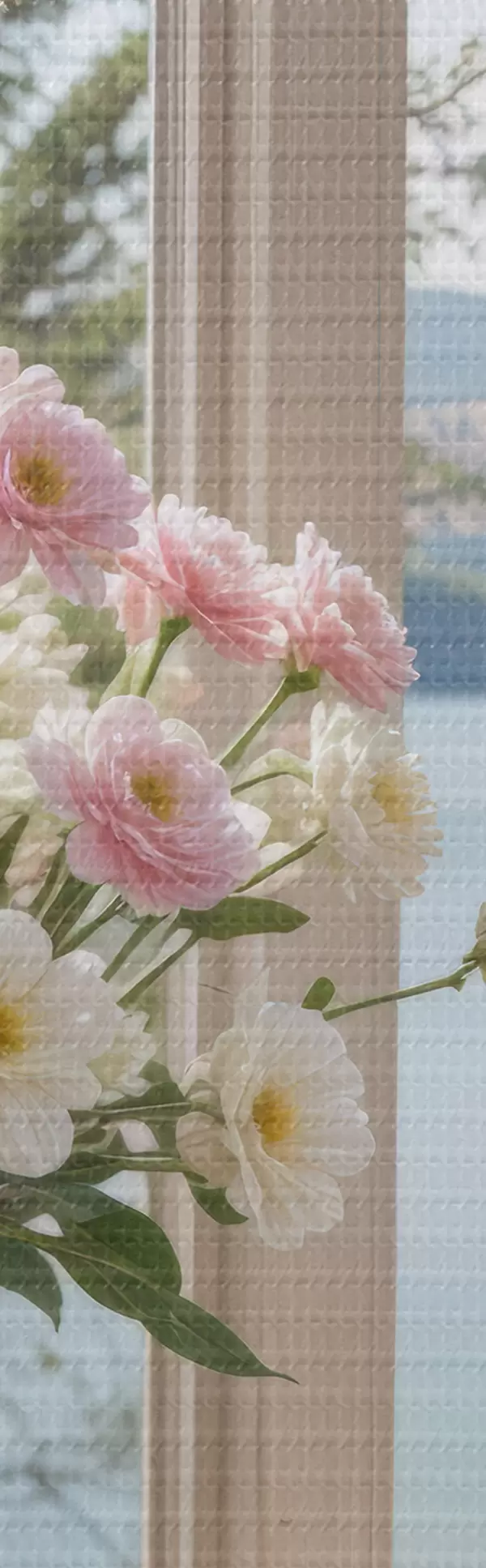 Nuotrauka Rožinių ir baltų gėlių puokštė stiklinėje vazoje ant palangės su vaizdingu ežeru ir kalnais Nr r40151