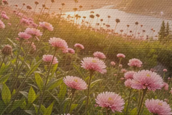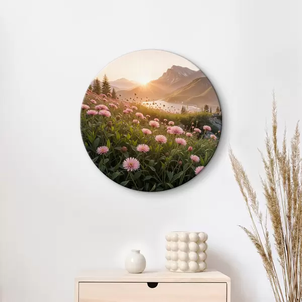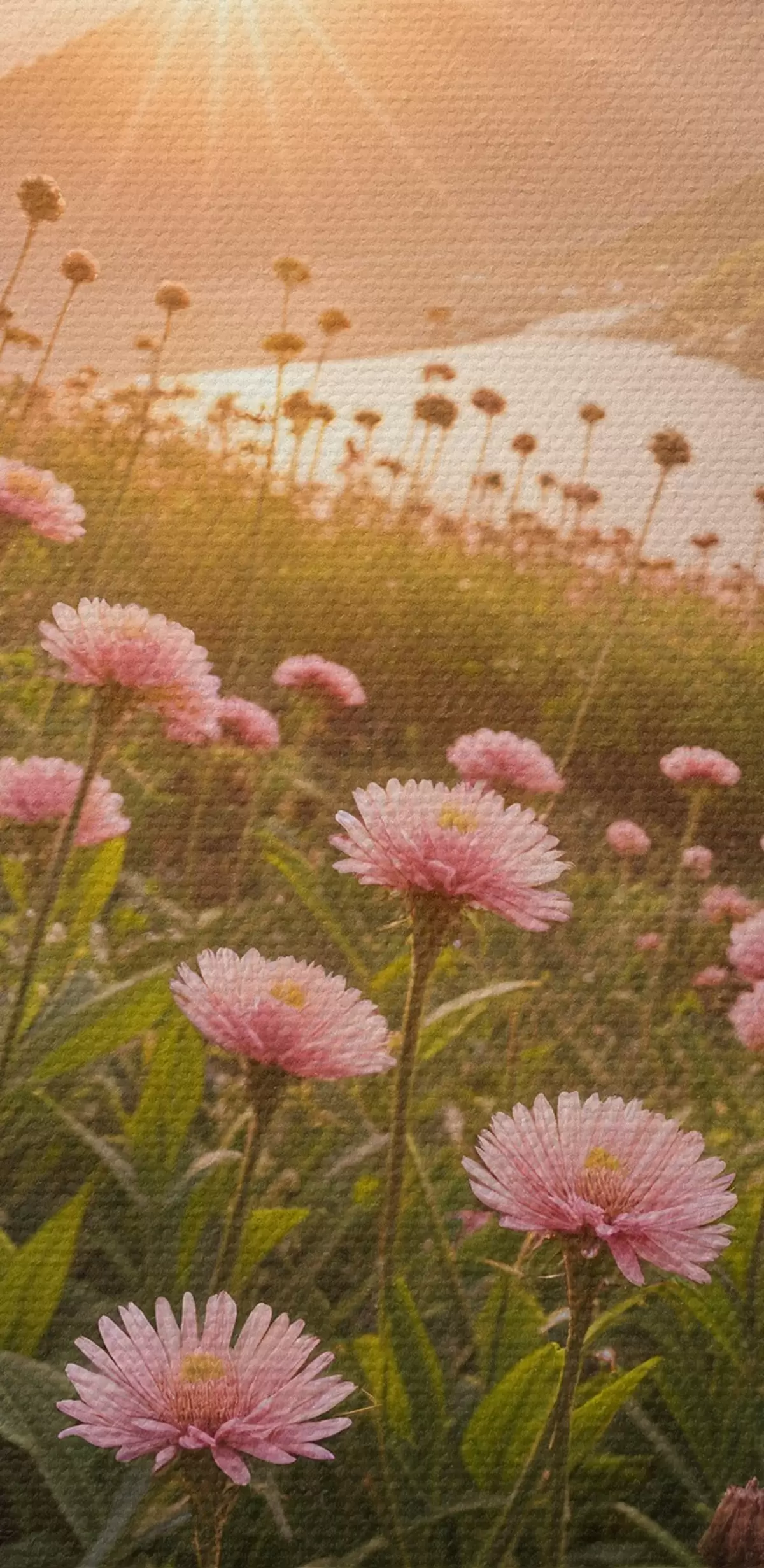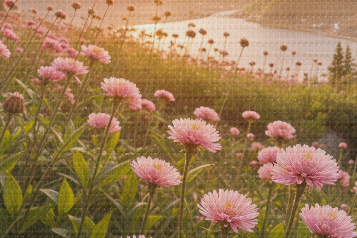 Nuotrauka Priekyje rožinių ramunę primenančių gėlių laukas, o fone – didelė kalnų grandinė Nr r40154