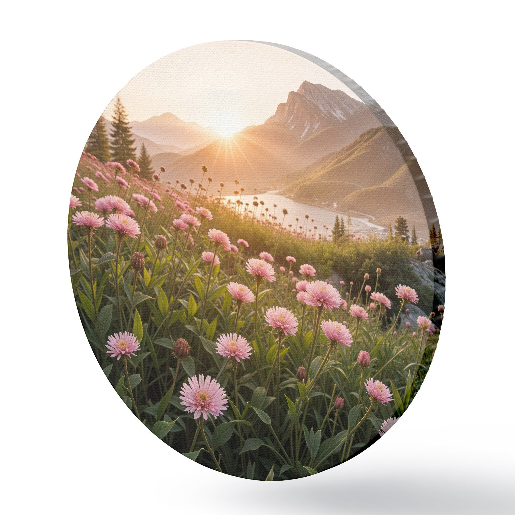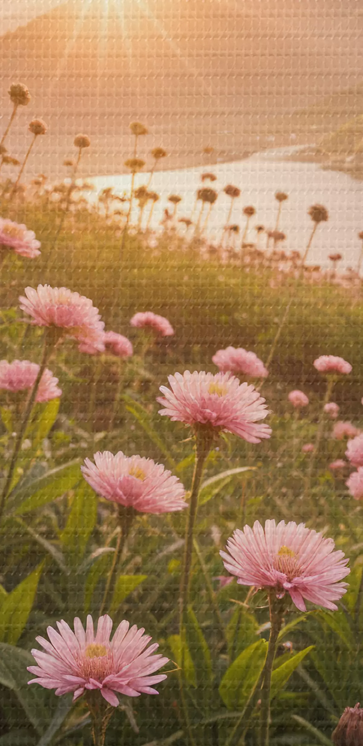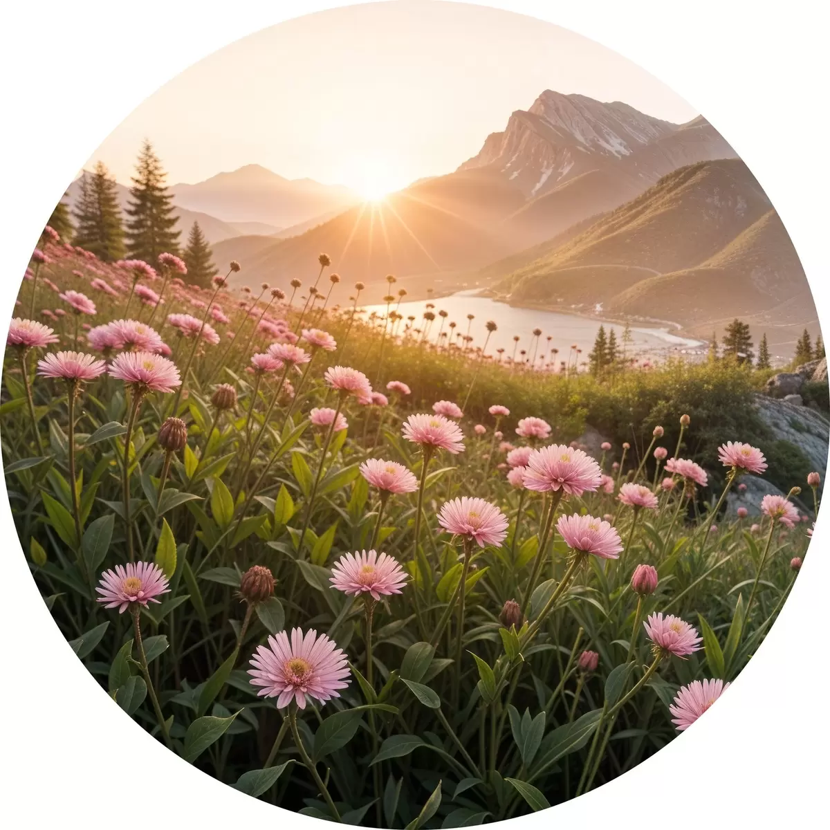 Nuotrauka Priekyje rožinių ramunę primenančių gėlių laukas, o fone – didelė kalnų grandinė Nr r40154