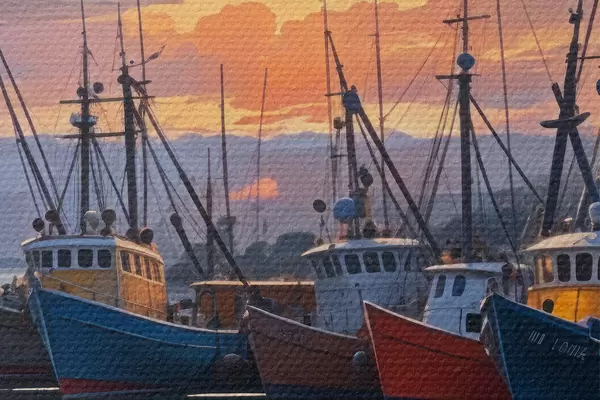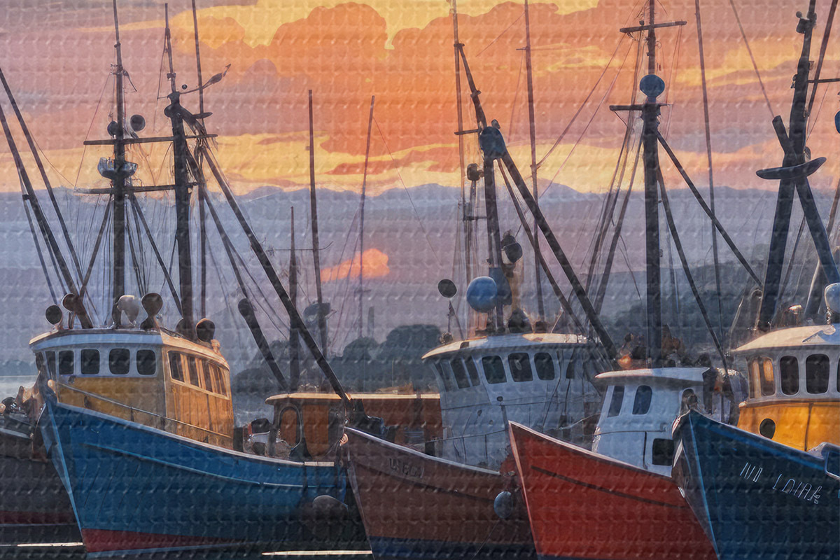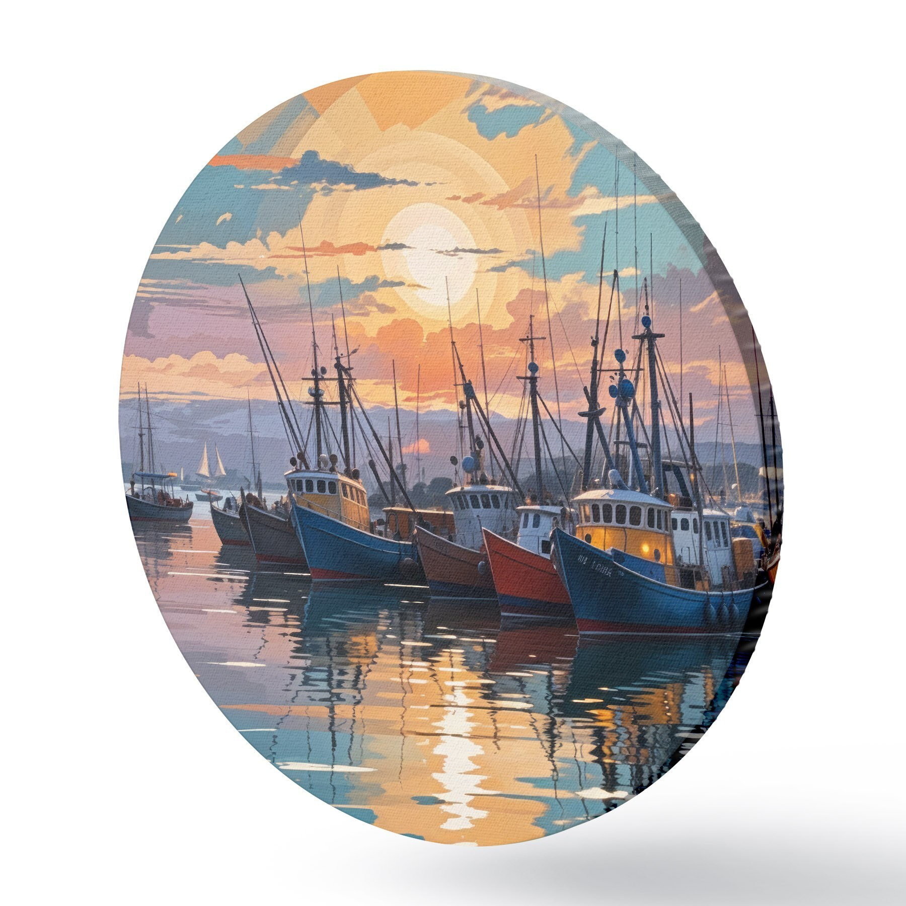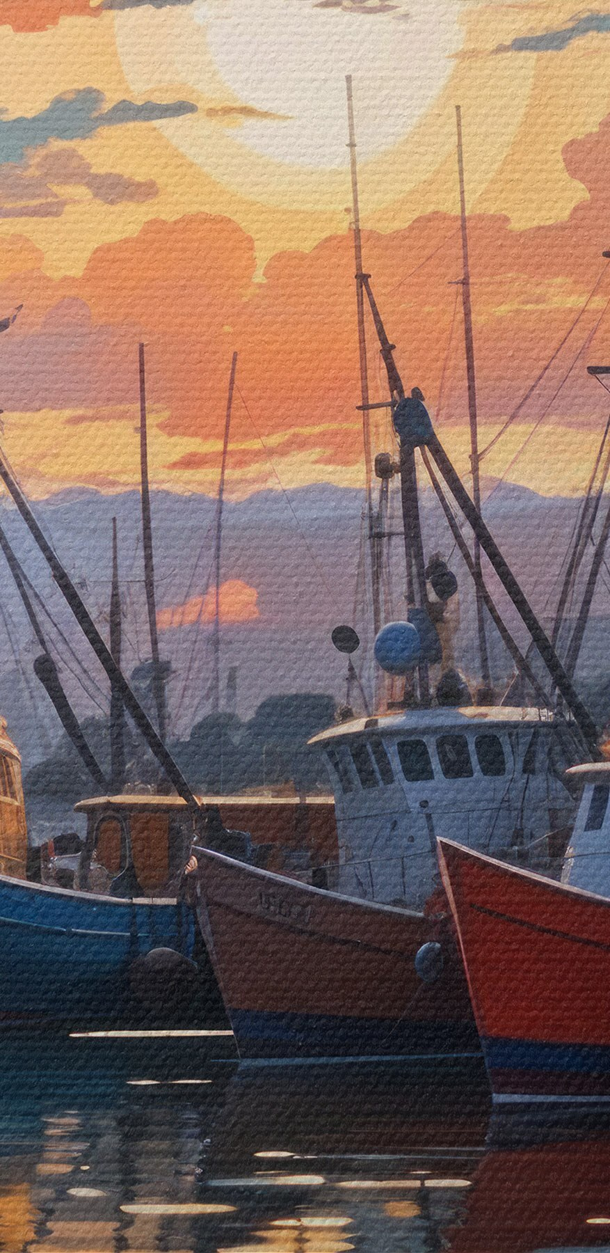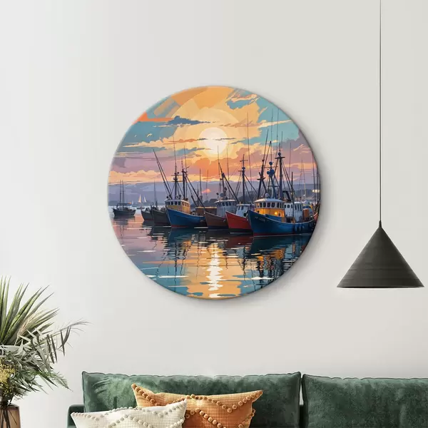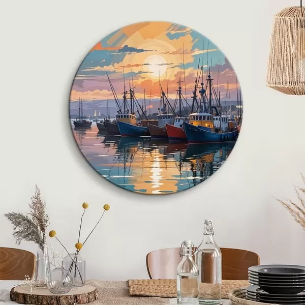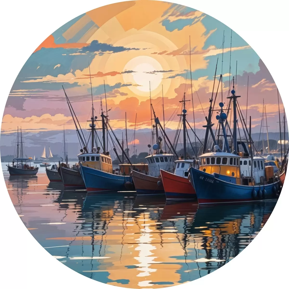 Nuotrauka Spalvingas saulėlydis virš uosto, kuriame gausu žvejų laivų ir laivų, sukuriančių ramią ir vaizdingą sceną Nr r40158