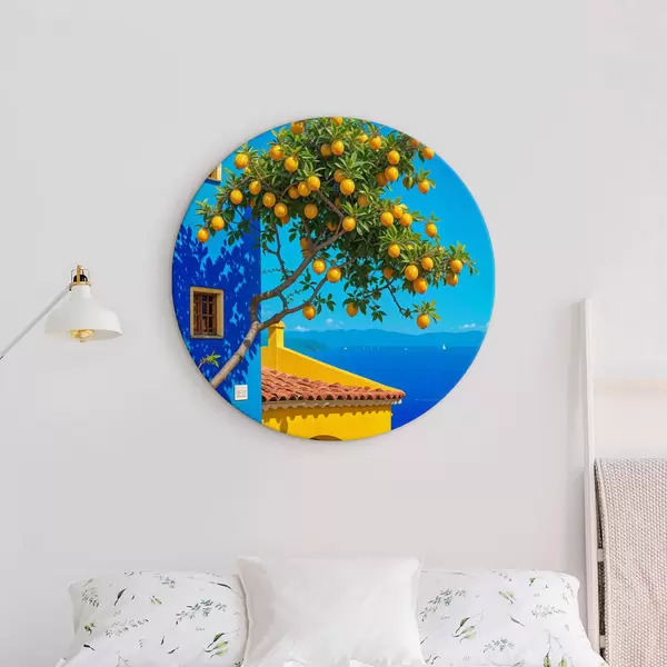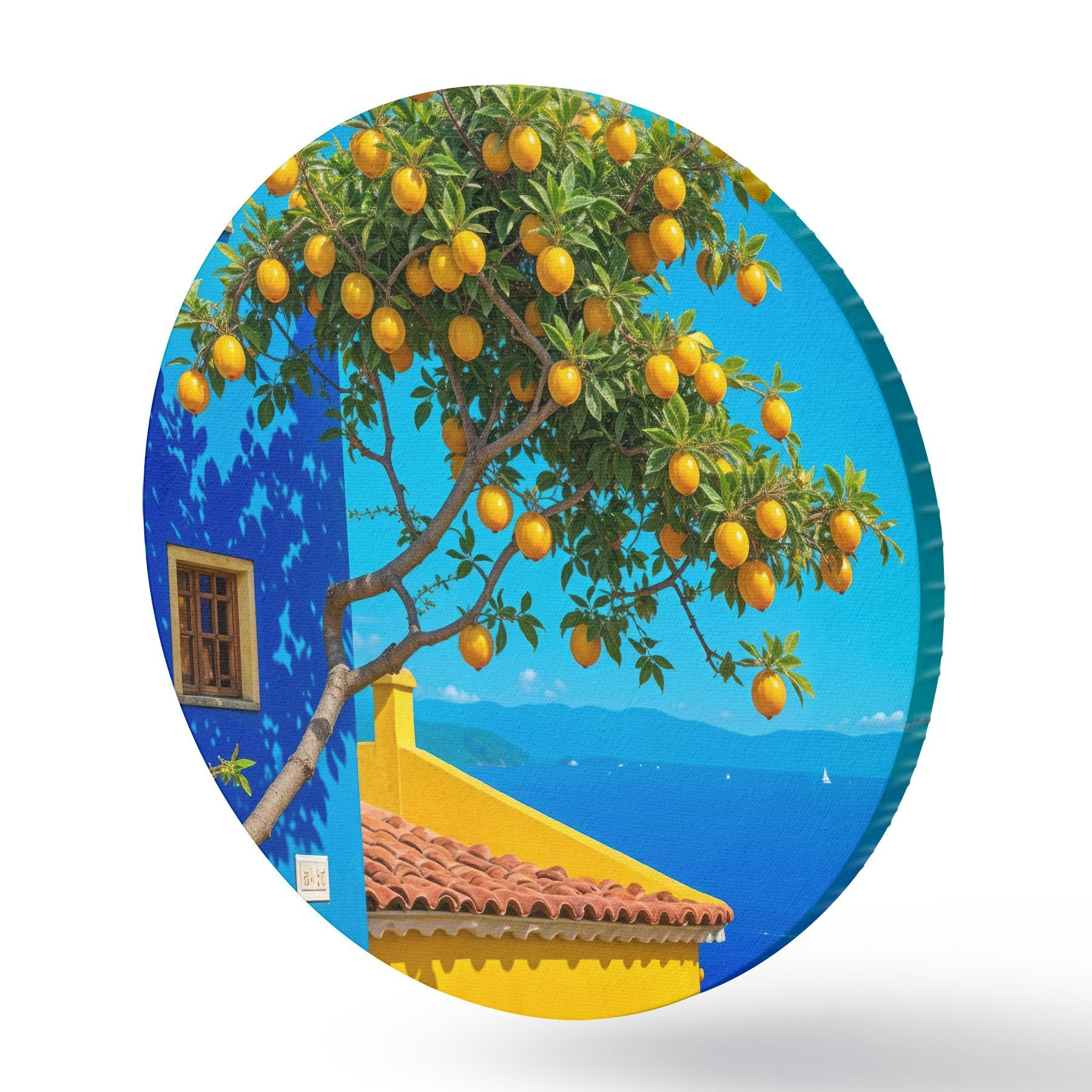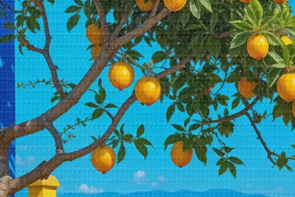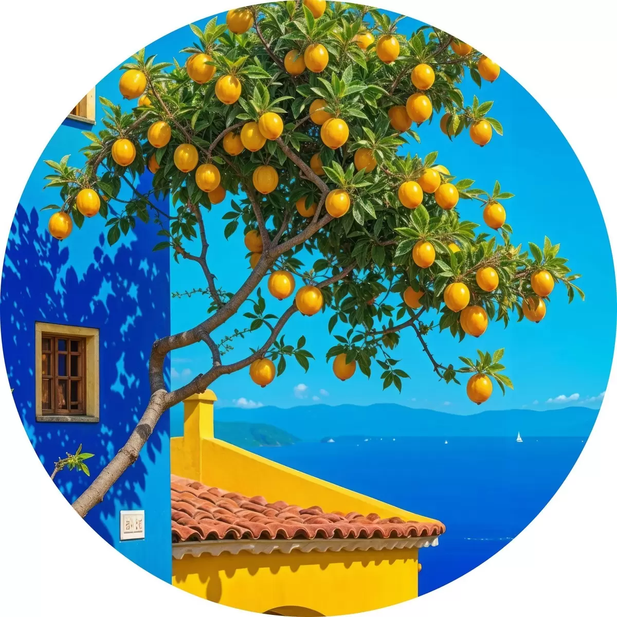 Nuotrauka Apelsinmedis su prinokusiais vaisiais auga ant pastato su mėlyna siena ir čerpiniu stogu su vaizdu į vandenyną Nr r40159