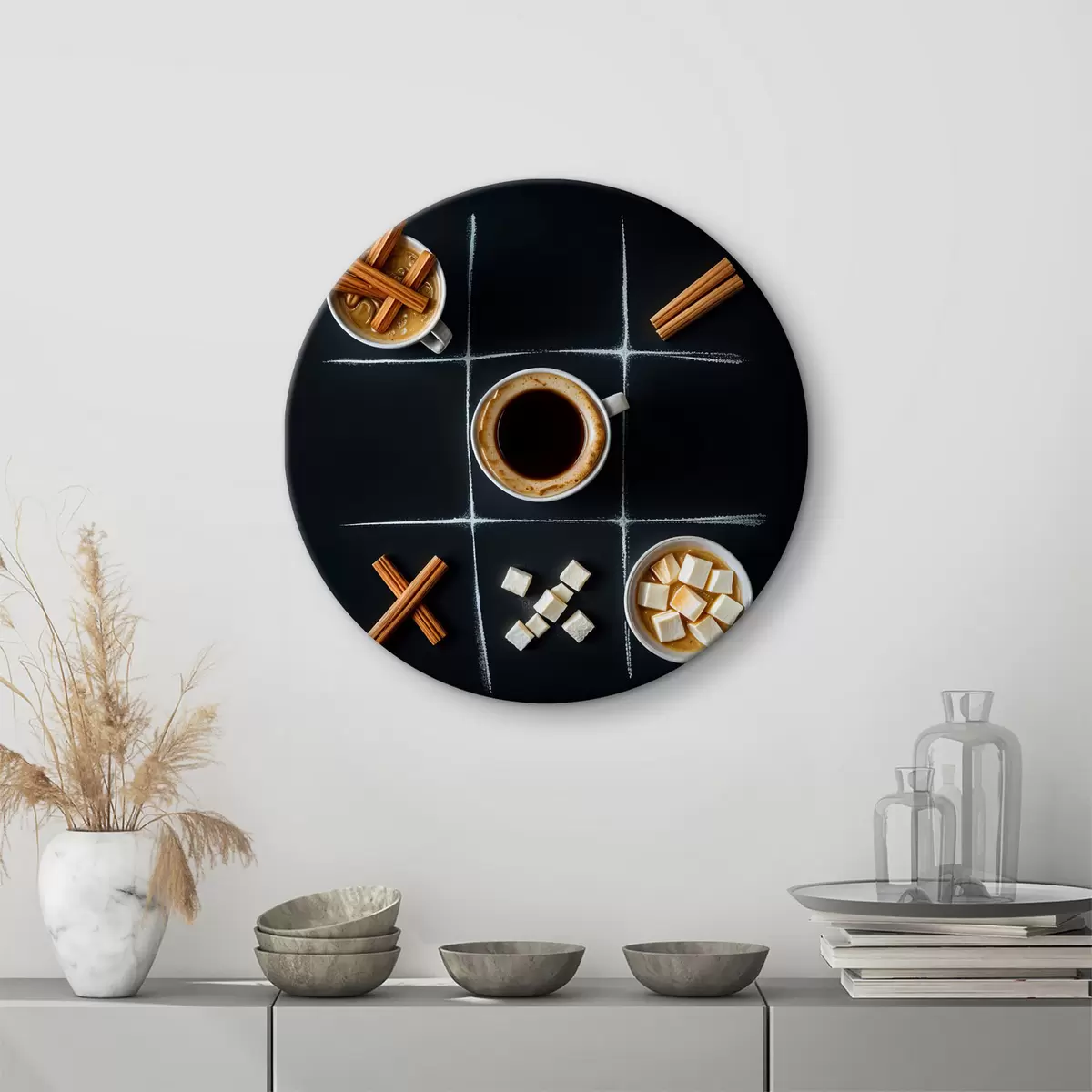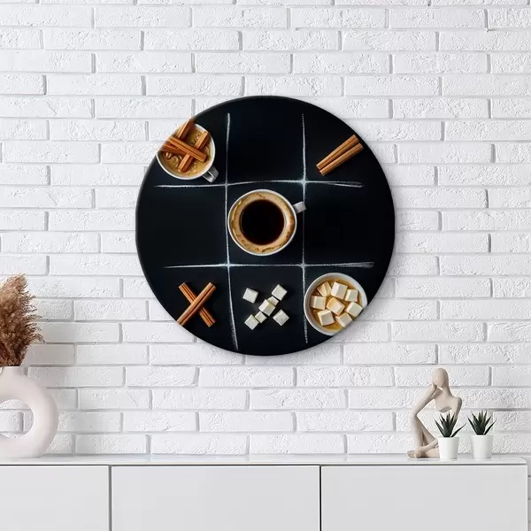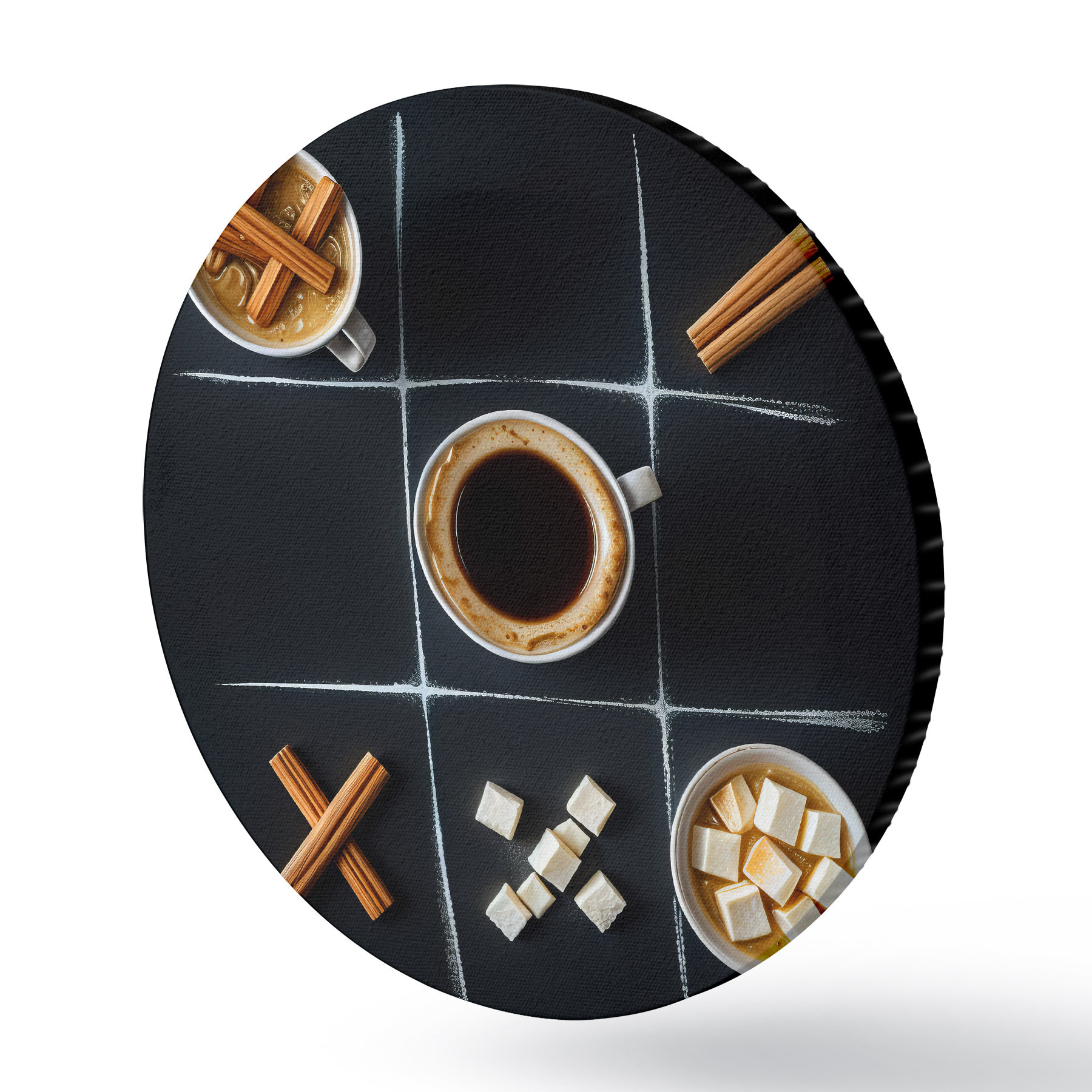Nuotrauka Puodelis kavos su cinamono lazdelėmis, cukraus kubeliais ir zefyrais, išdėstytais „tic-tac-toe“ tinklelyje Nr r40163