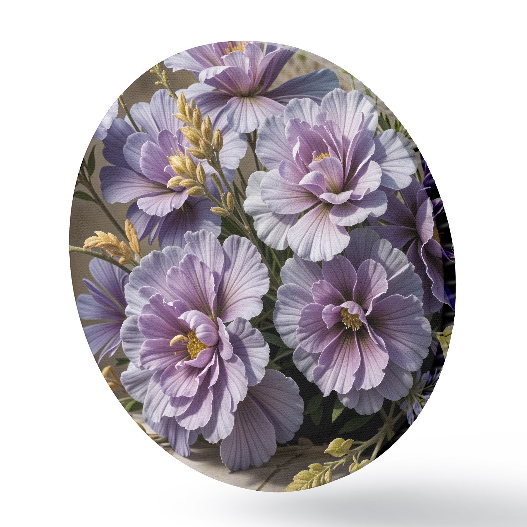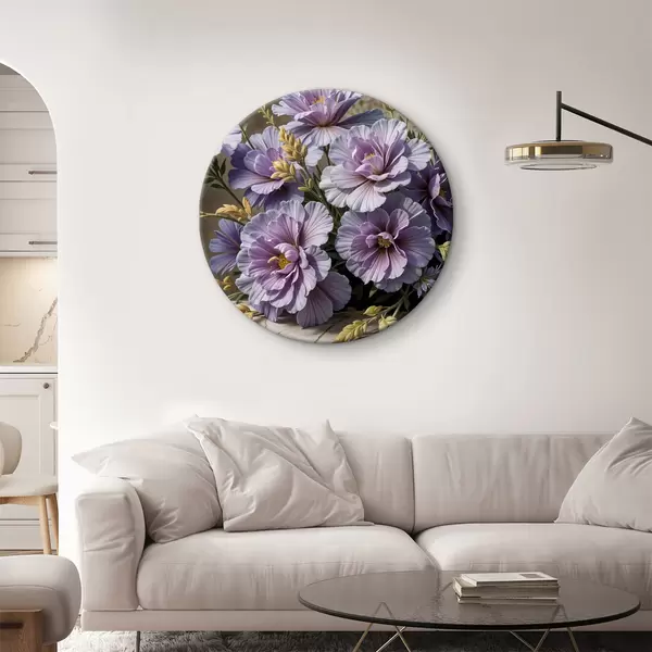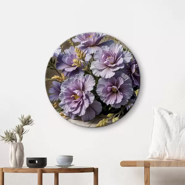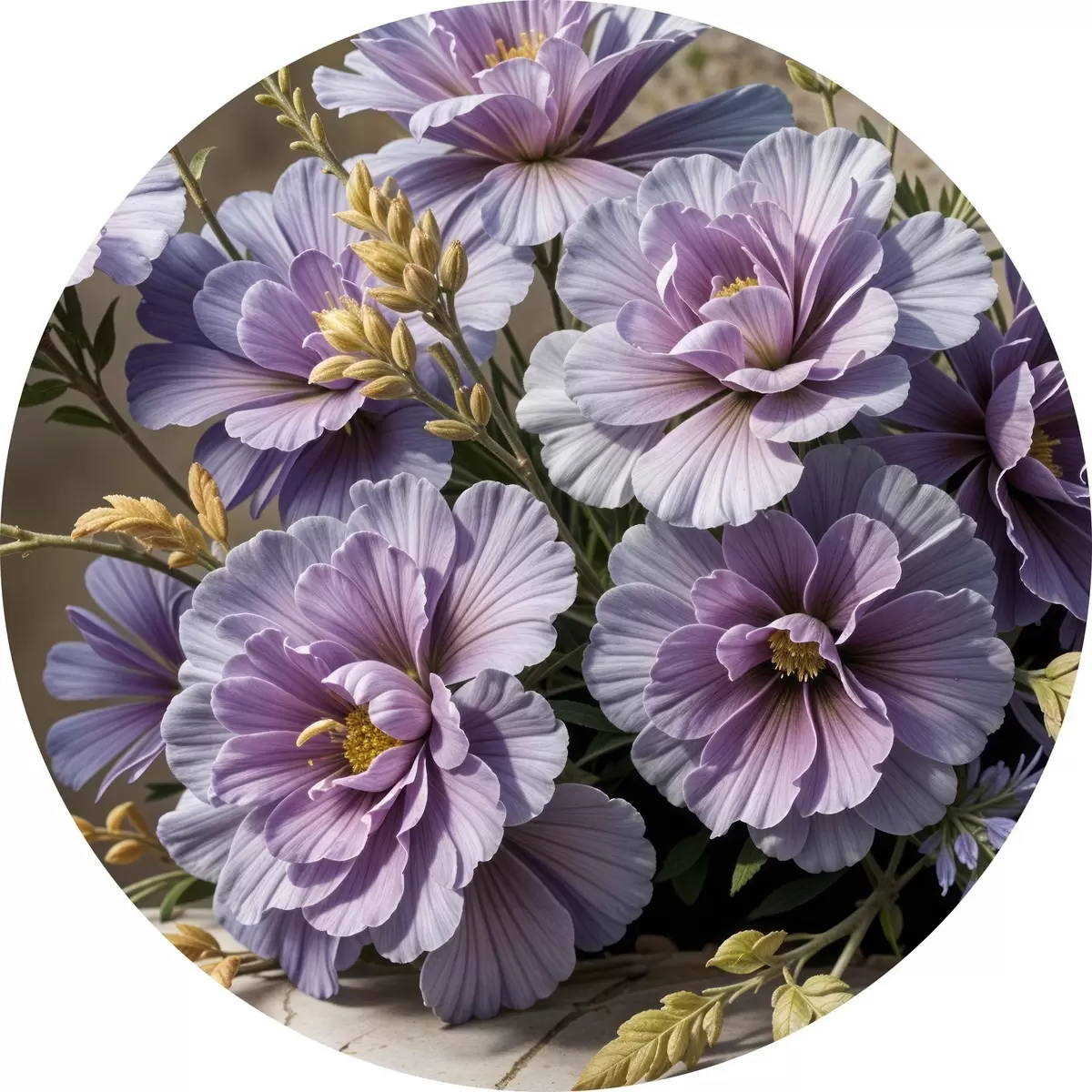 Nuotrauka Gražių violetinių ir baltų gėlių puokštė geltonais lapeliais, išdėstyta natūraliai ir meniškai Nr r40166