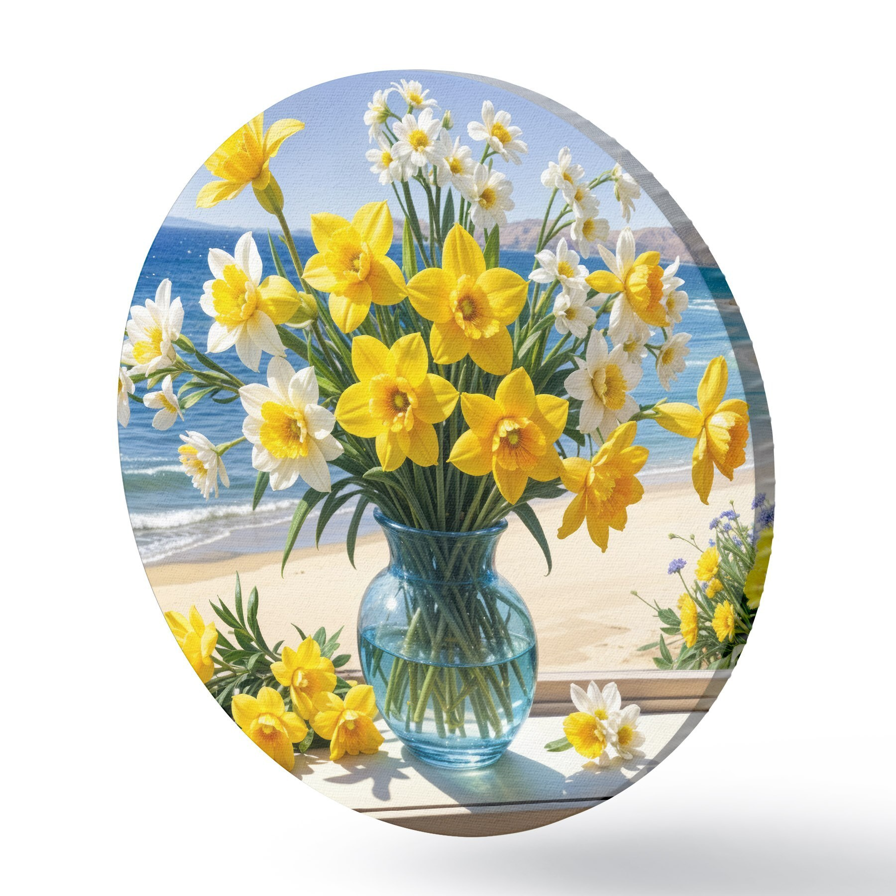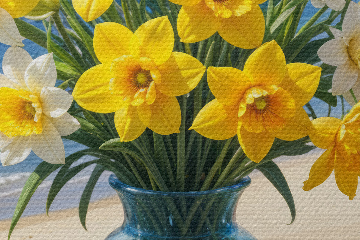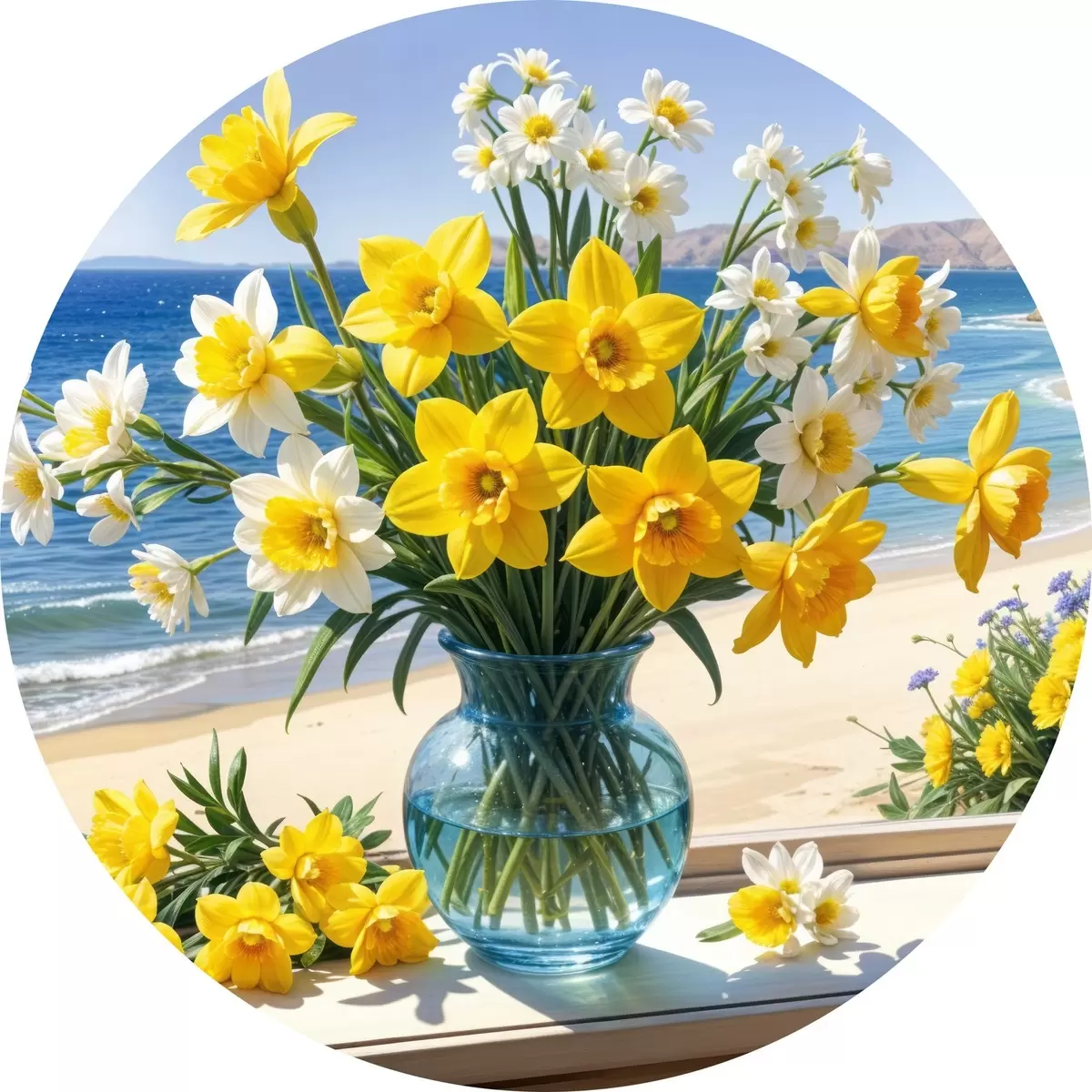 Nuotrauka Geltonų narcizų ir baltų ramunių puokštė stiklinėje vazoje ant palangės su vaizdu į paplūdimį ir vandenyną Nr r40171