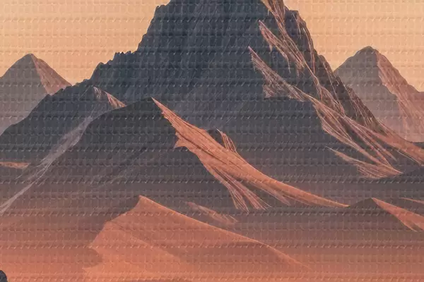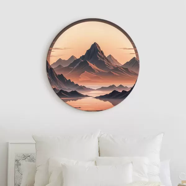 Nuotrauka Dramatiškas, futuristinis kraštovaizdis su dideliu, švytinčiu mėnuliu arba saule danguje, apsuptas kalnų Nr r40177