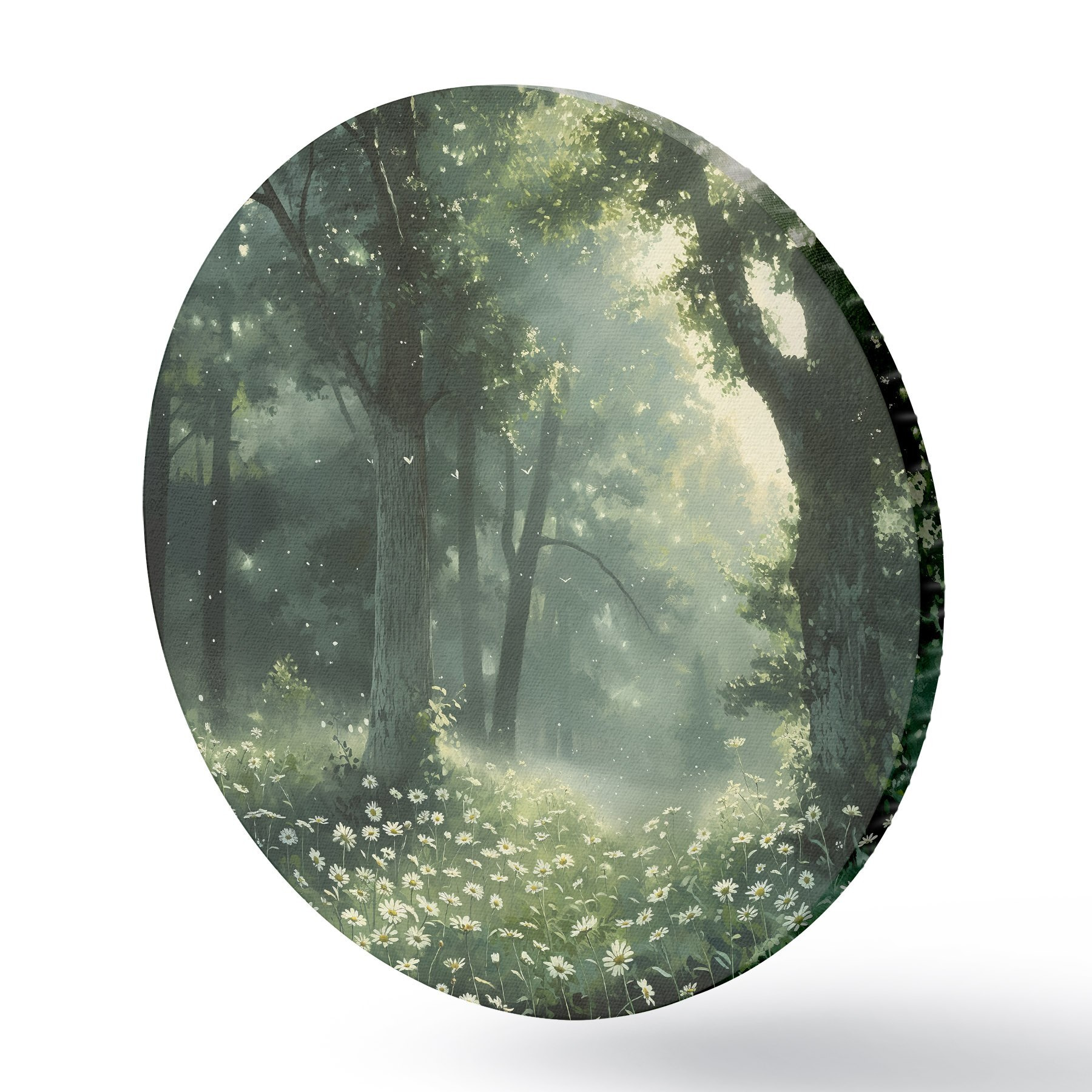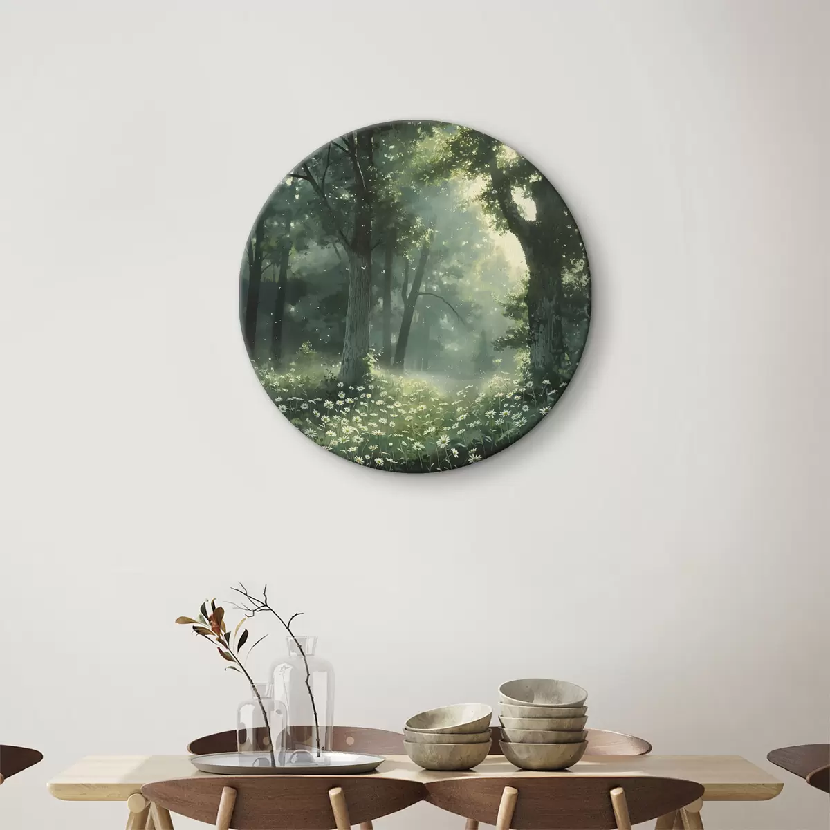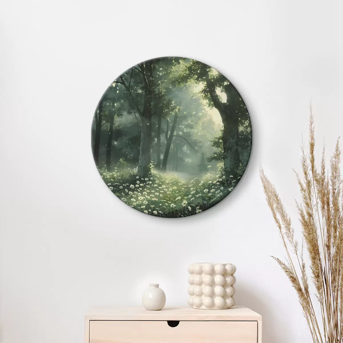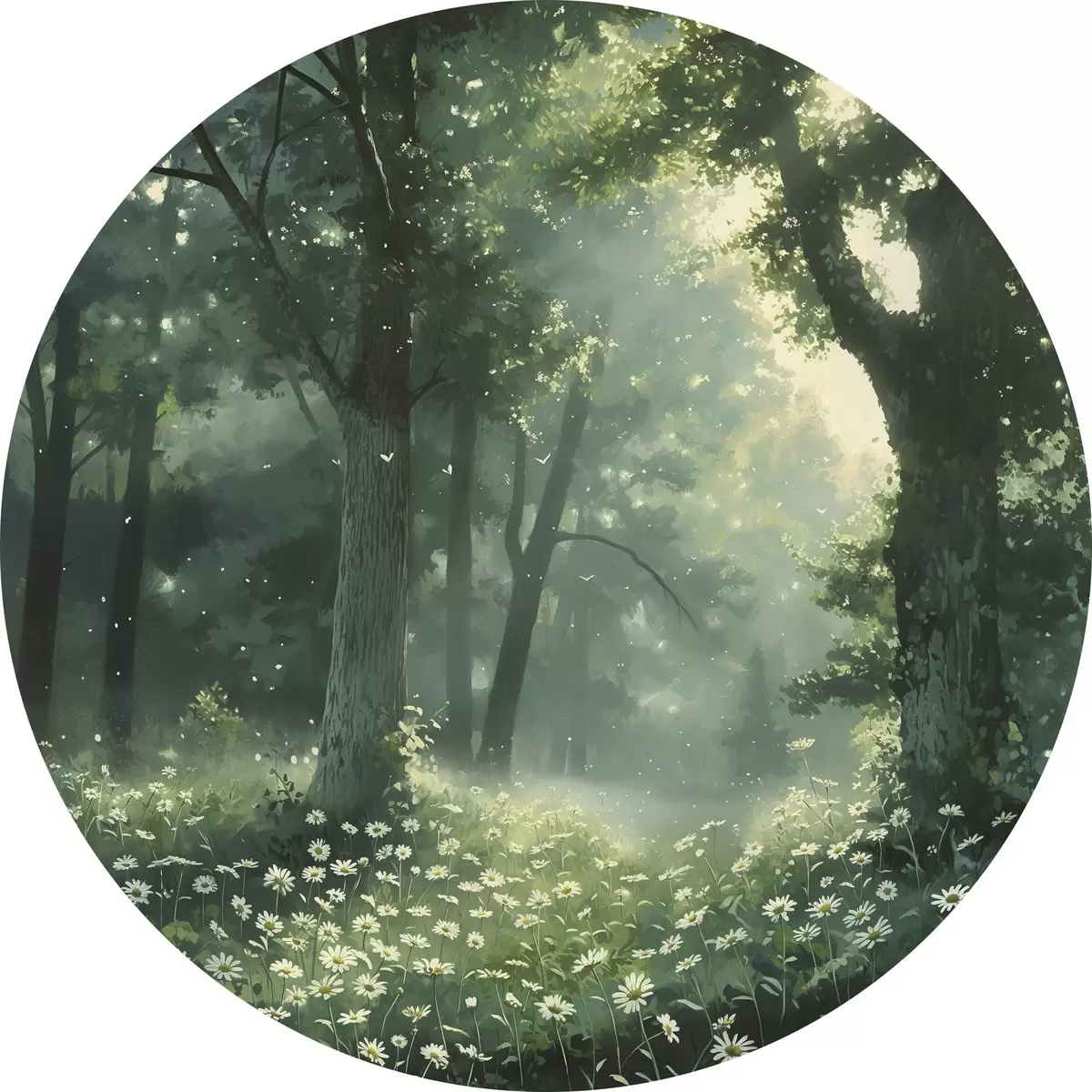 Nuotrauka Tankus miškas su saulės spinduliais medžiuose, ramunėlių žiedais, žalia žole, gamta Nr r40224