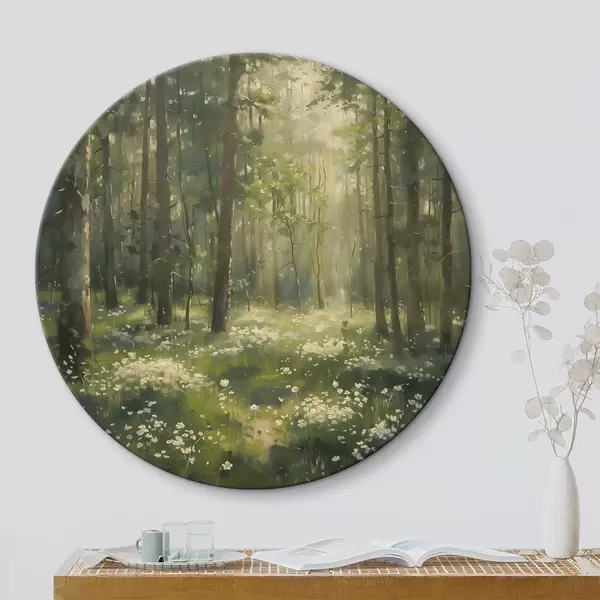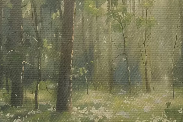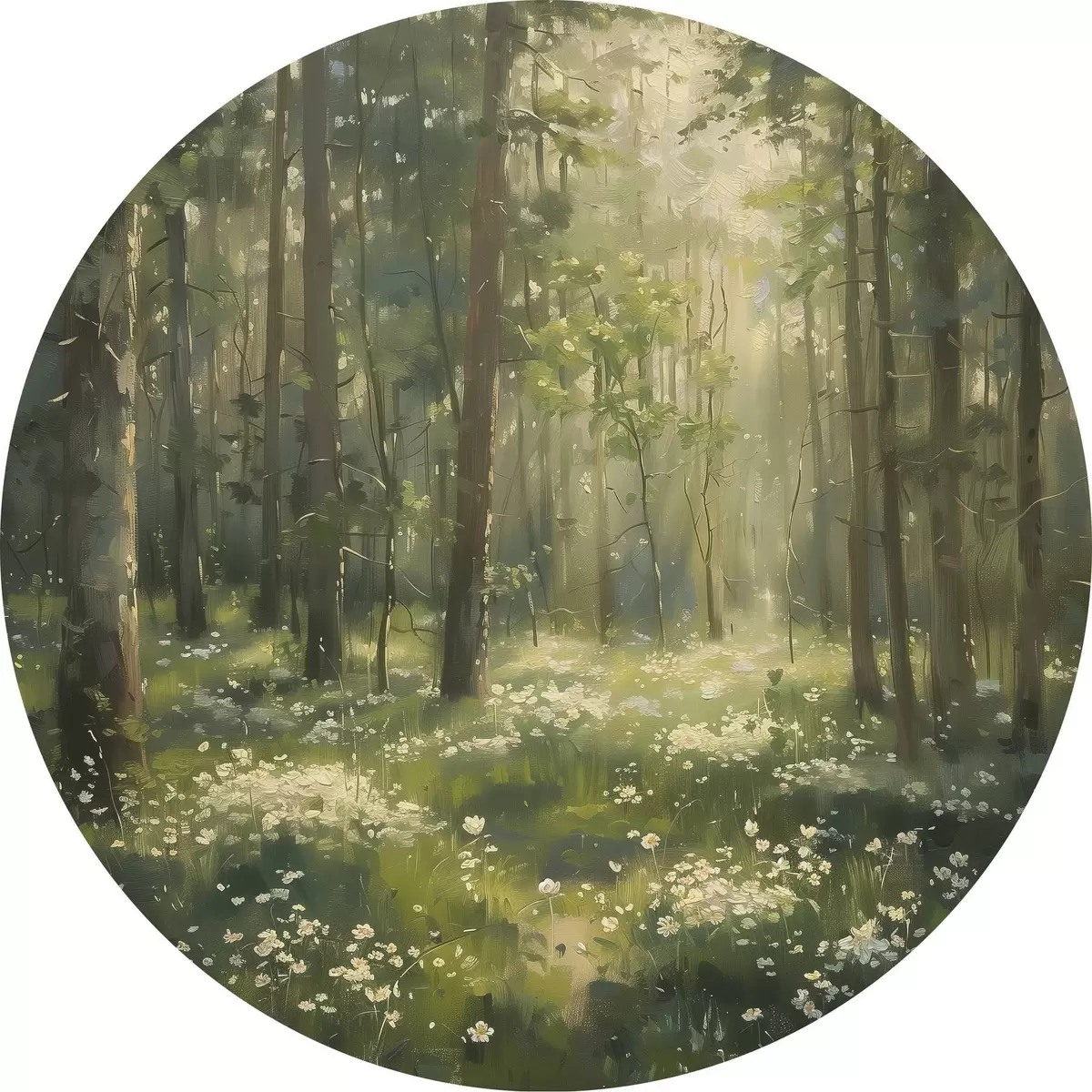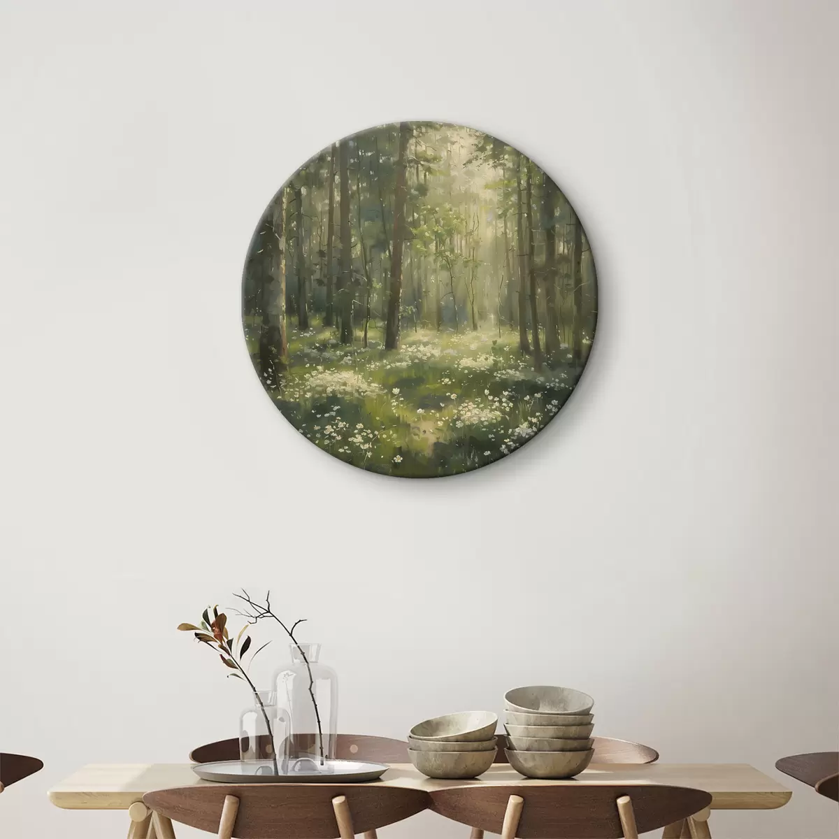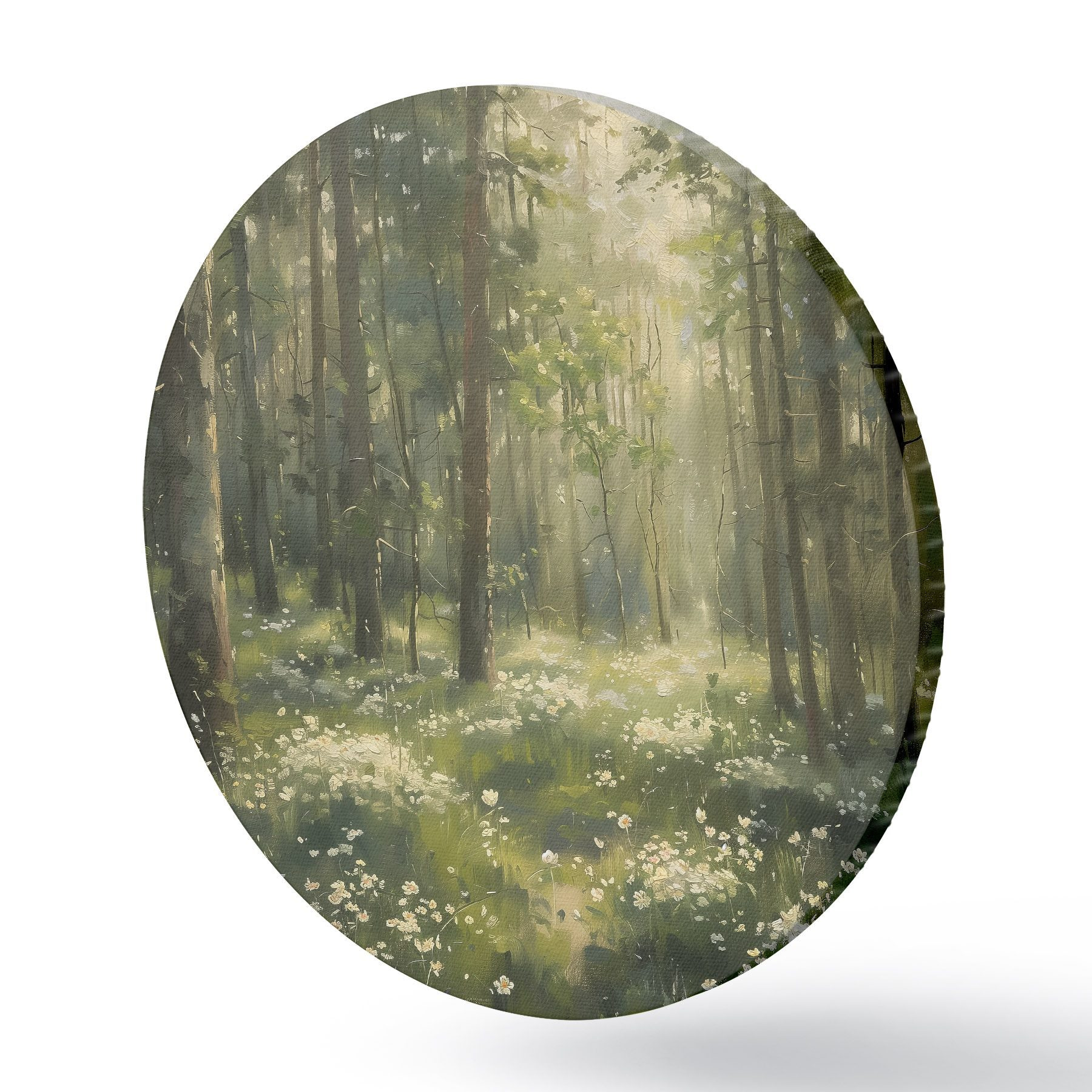Nuotrauka Miškas su saulės šviesa medžiuose, ramunėlių gėlėmis, žalia žolė, akrilo piešinys Nr r40226