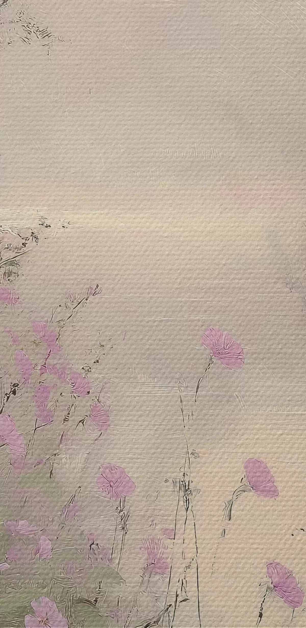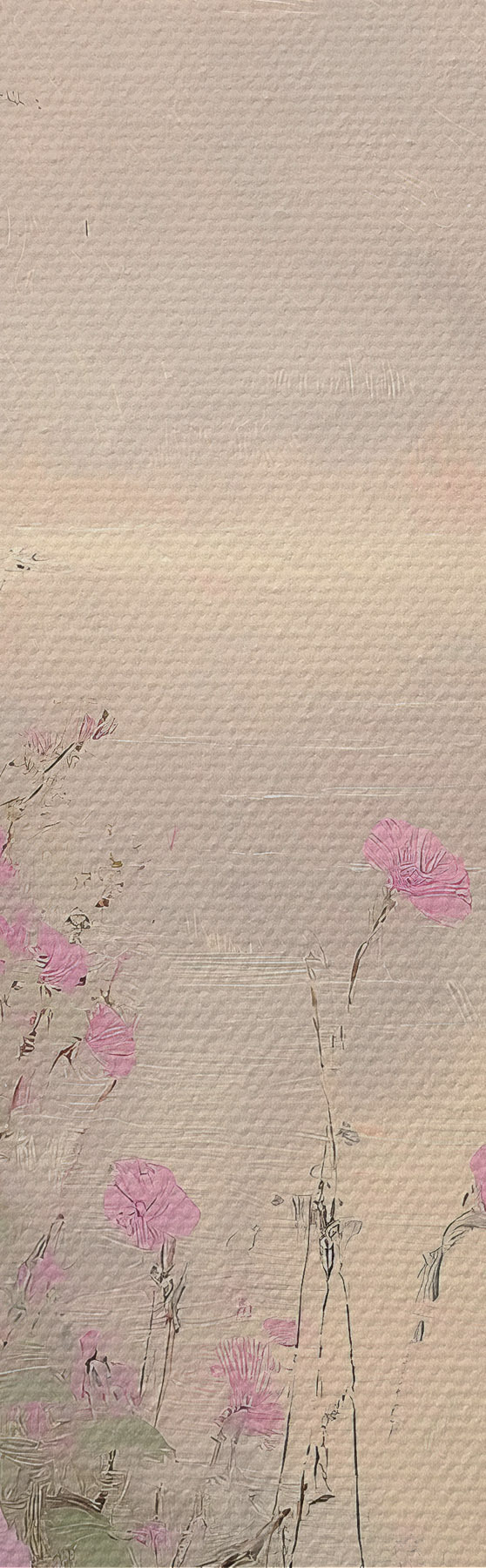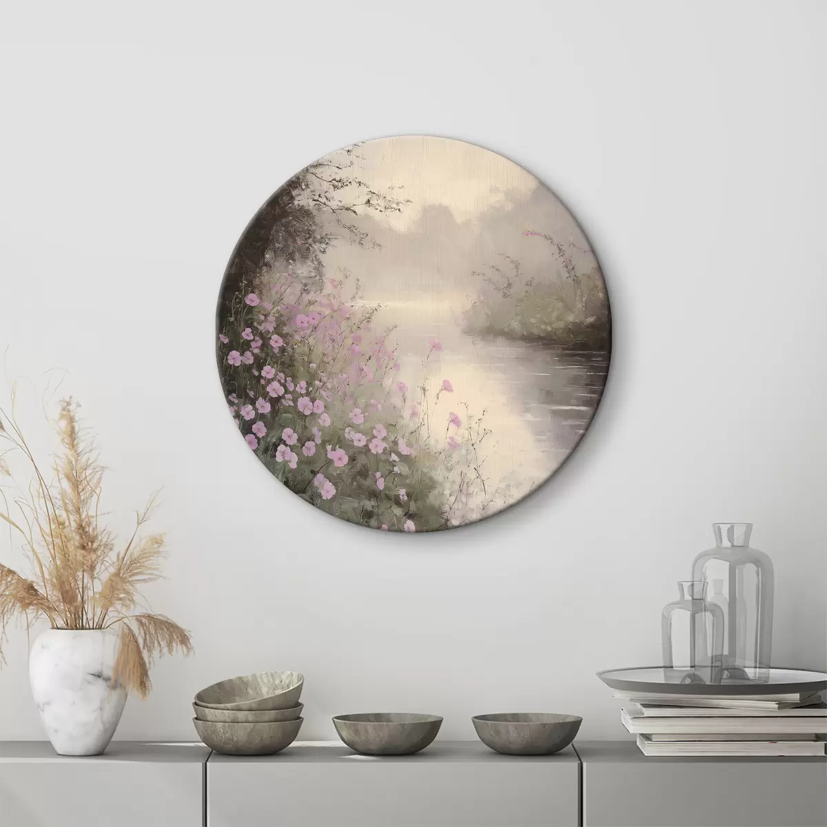 Nuotrauka Ežeras su rožinėmis gėlėmis, saulėtekis, aliejinis piešinys, pastelinės smėlio spalvos, migla Nr r40229