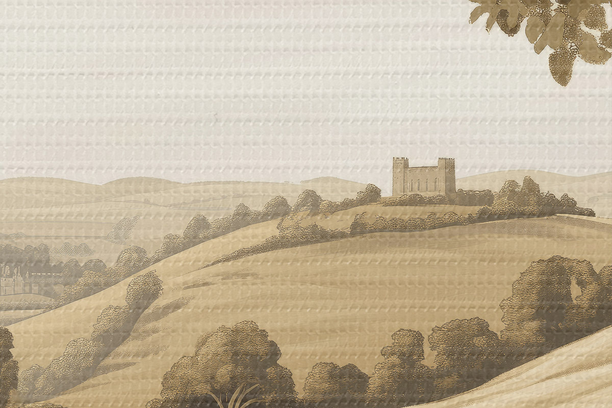 Nuotrauka Gamtos peizažas smėlio spalvos paletėje, pieva, gėlės, medžiai, pilis Nr r40230