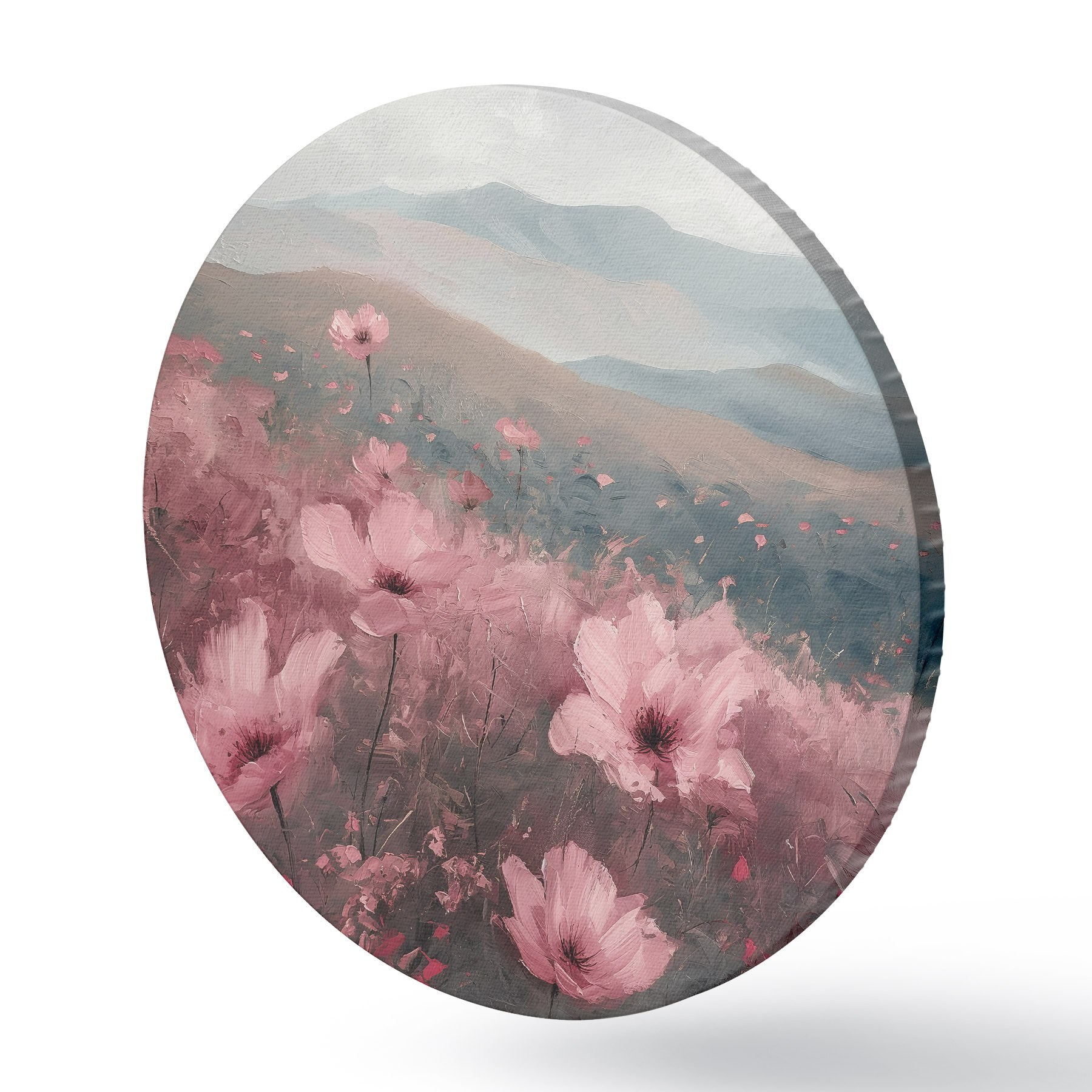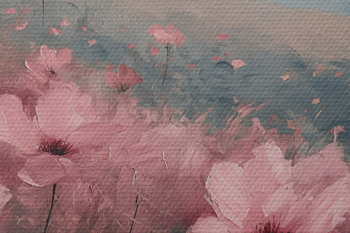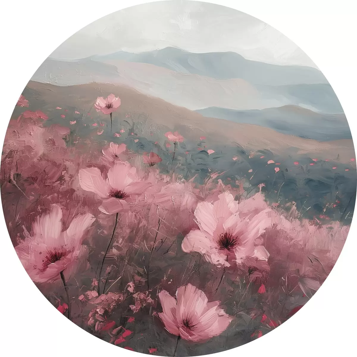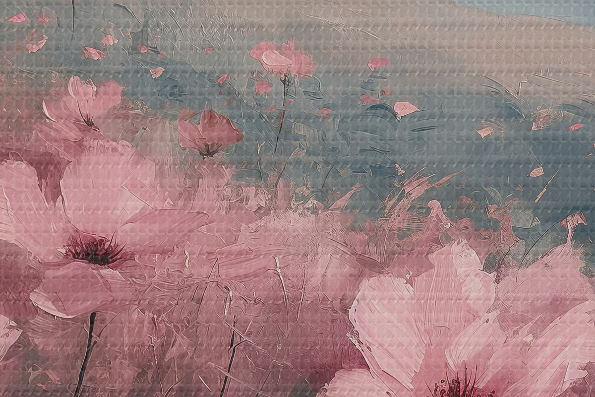 Nuotrauka Rožinės gėlės pievoje, gamtos peizažas, kalnai, aliejinė tapyba, ryškūs potėpiai Nr r40233