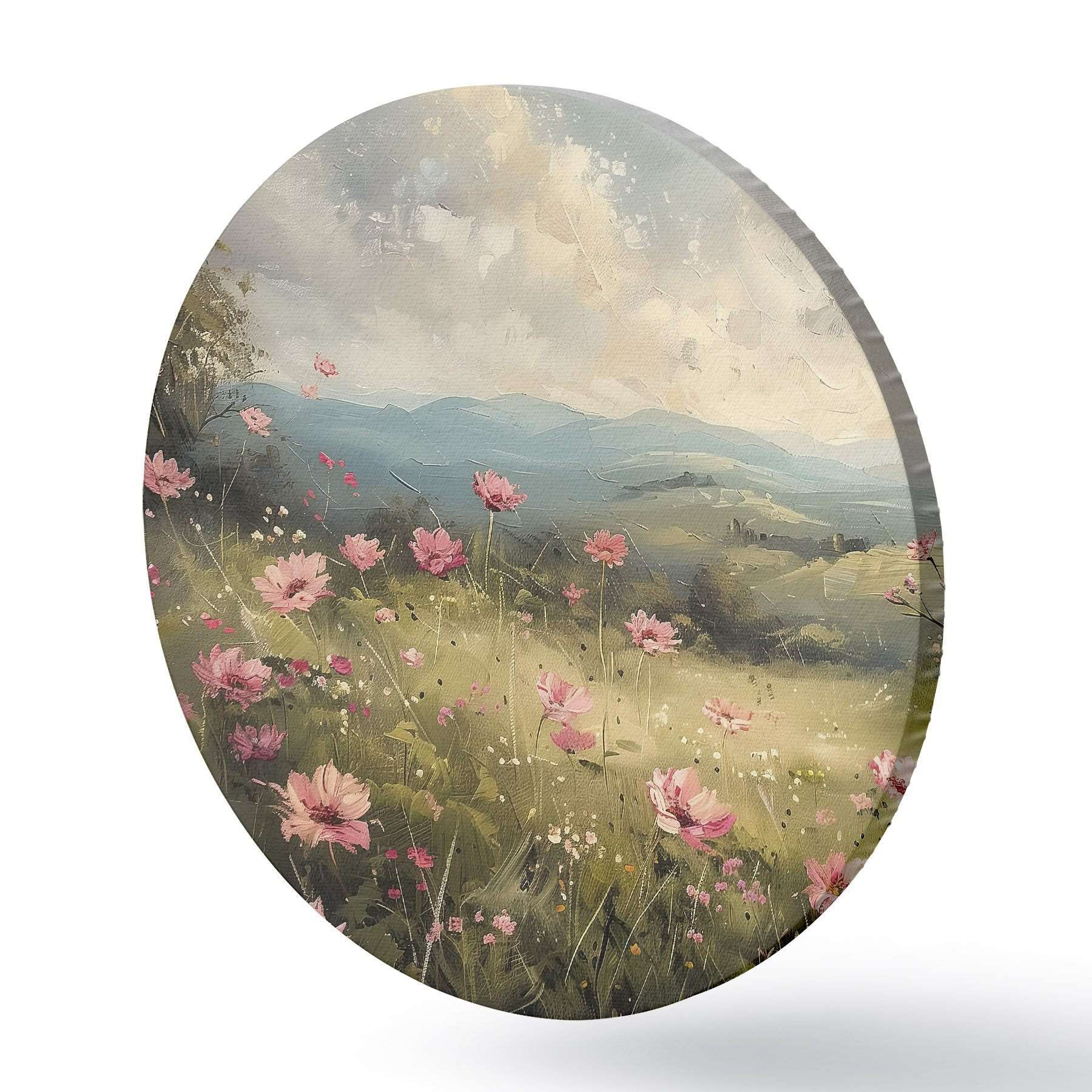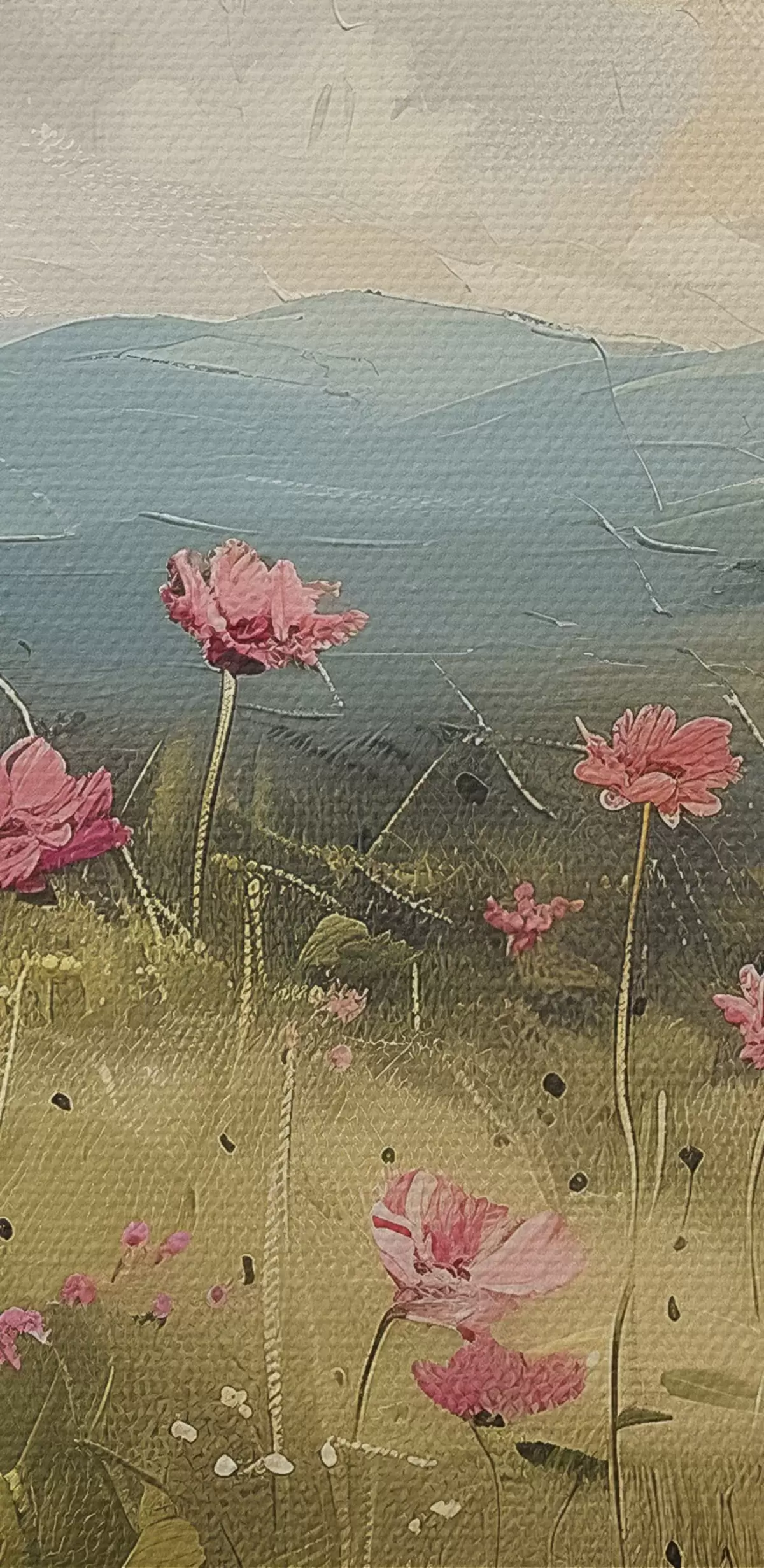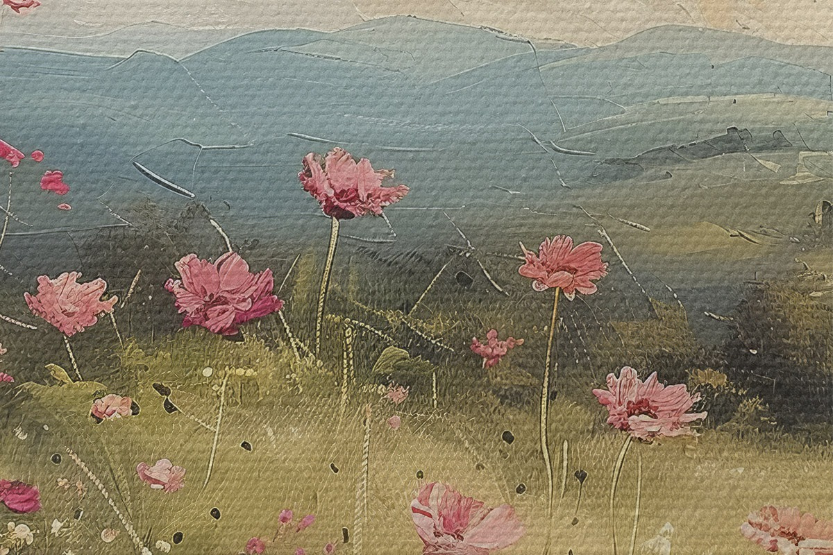 Nuotrauka Pieva su rožinėmis gėlėmis, žalia žolė, gamtos peizažas, dangus su debesimis, akrilo piešinys Nr r40234