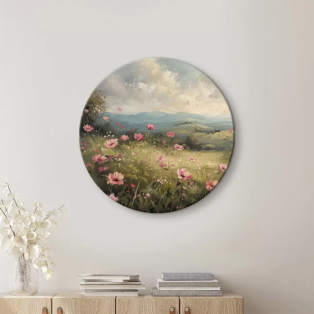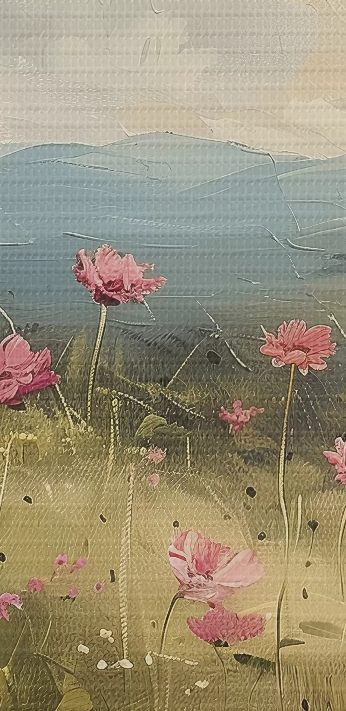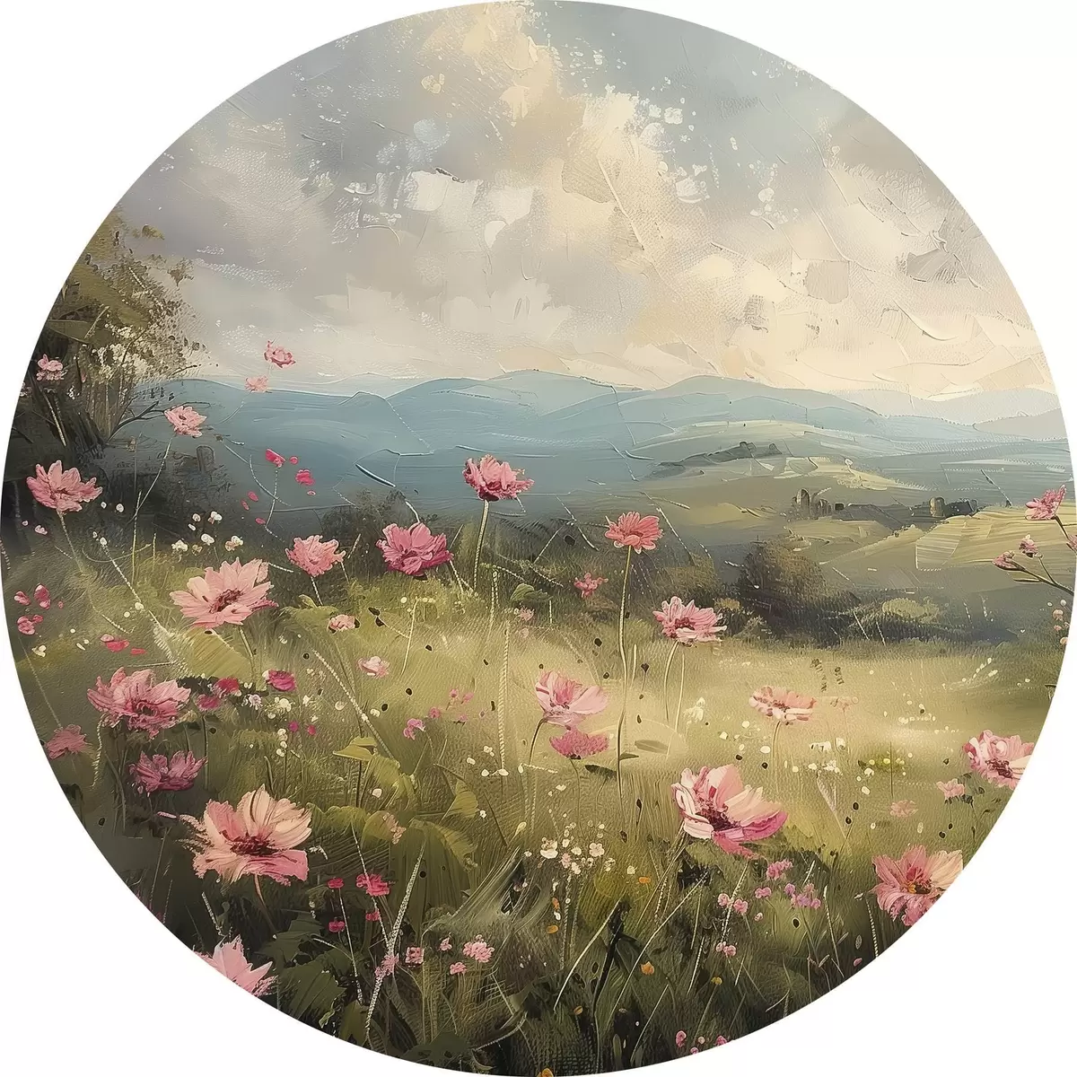 Nuotrauka Pieva su rožinėmis gėlėmis, žalia žolė, gamtos peizažas, dangus su debesimis, akrilo piešinys Nr r40234