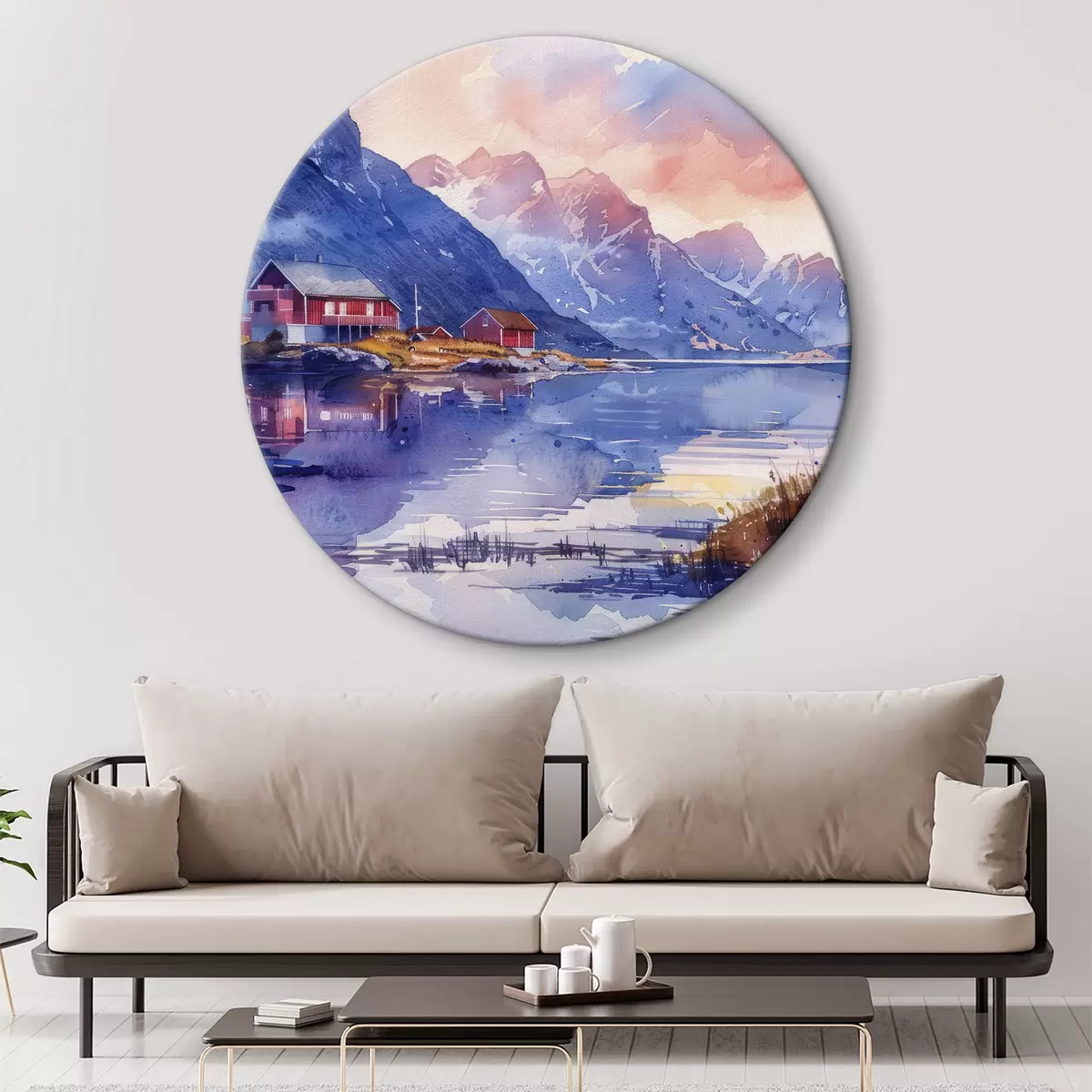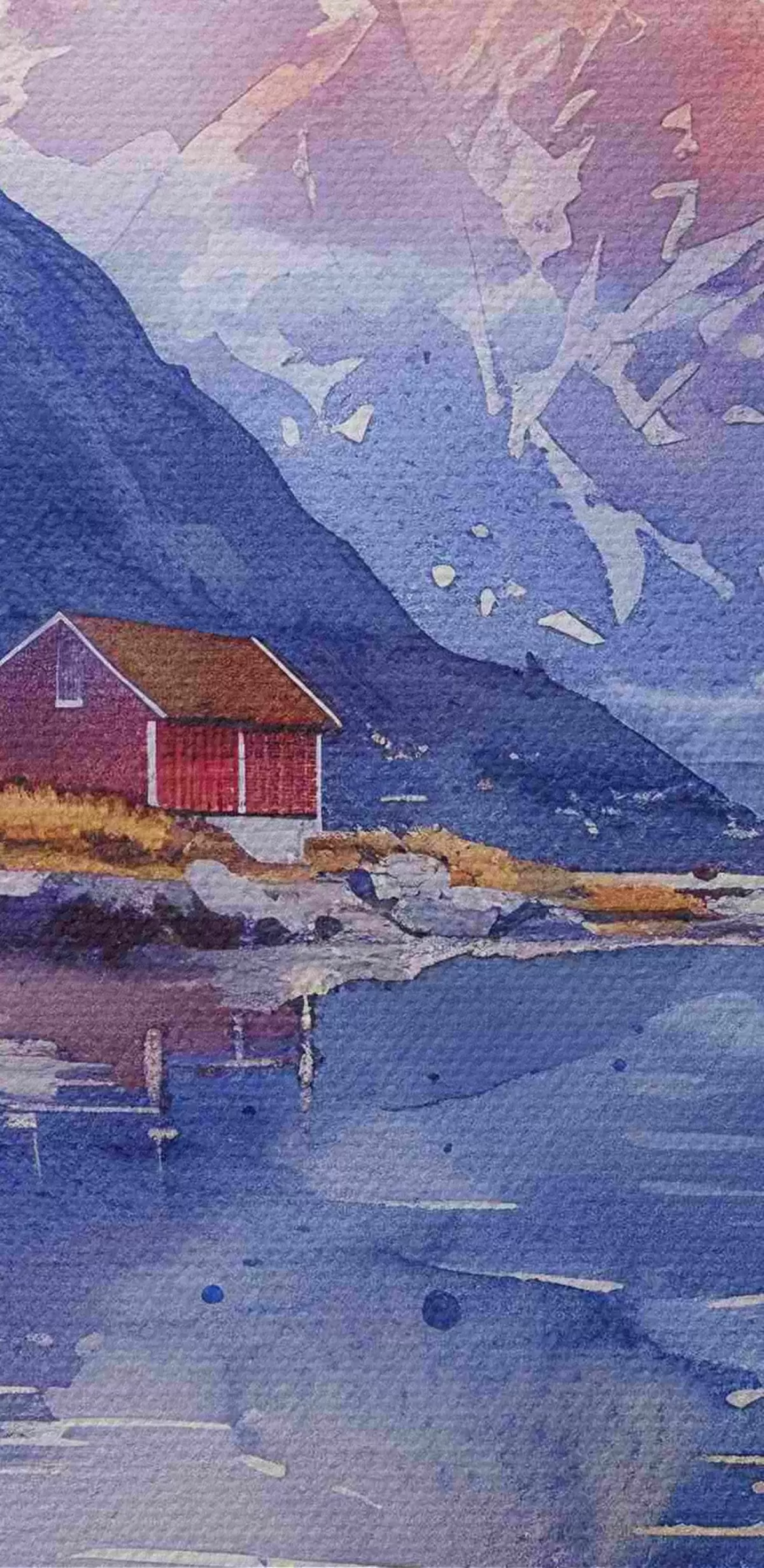 Nuotrauka Norvegijos kaimas, saulėlydžio dangus, rami upė, kalnai, akvarelė Nr r40311