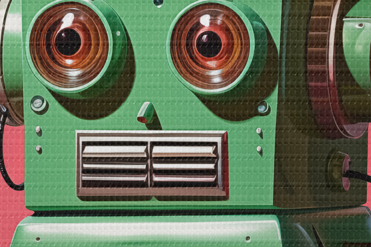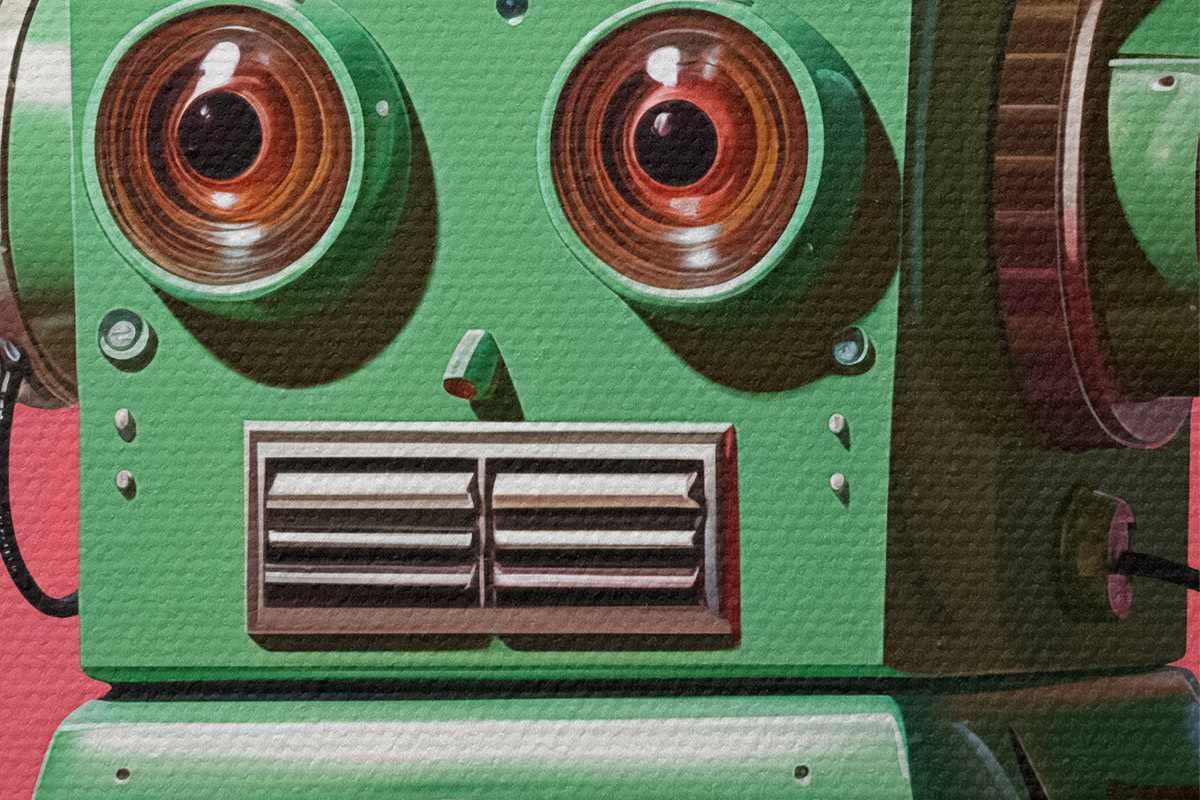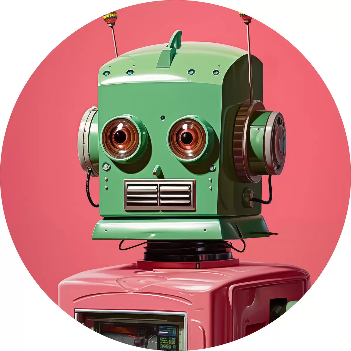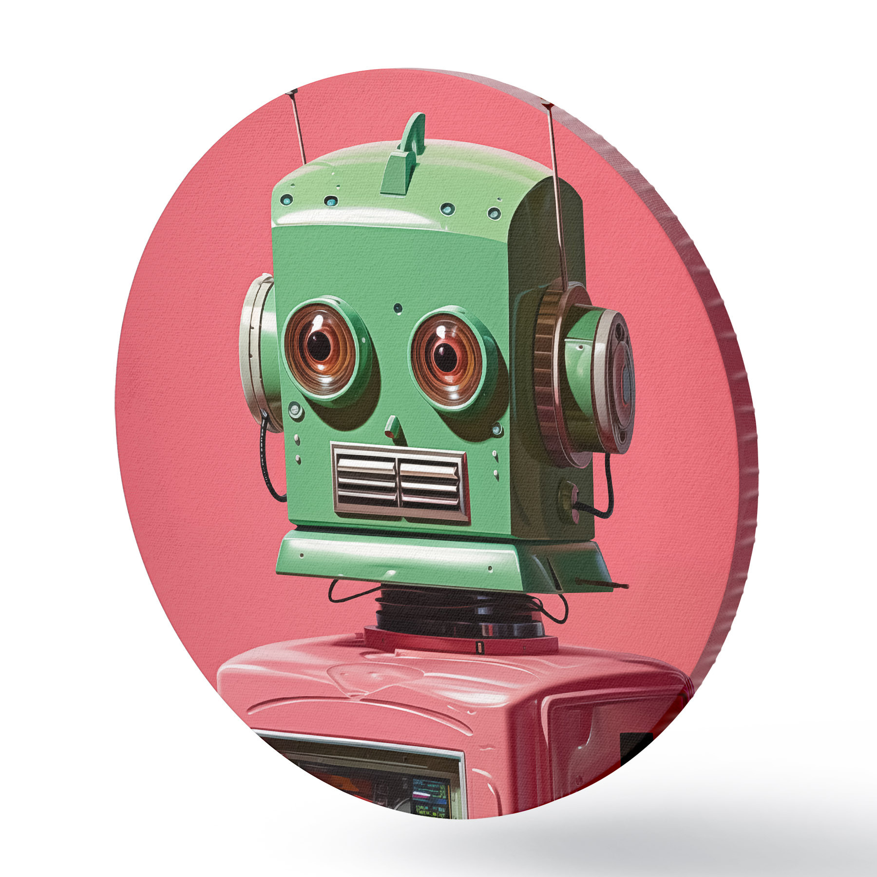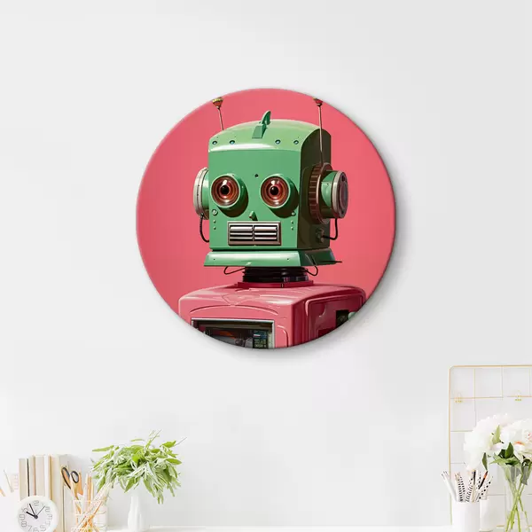 Nuotrauka Android robotas su žalia galva rožiniame fone Nr r40314