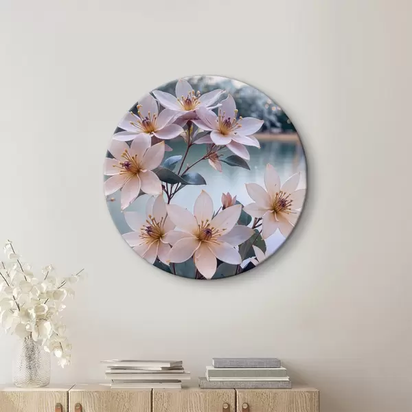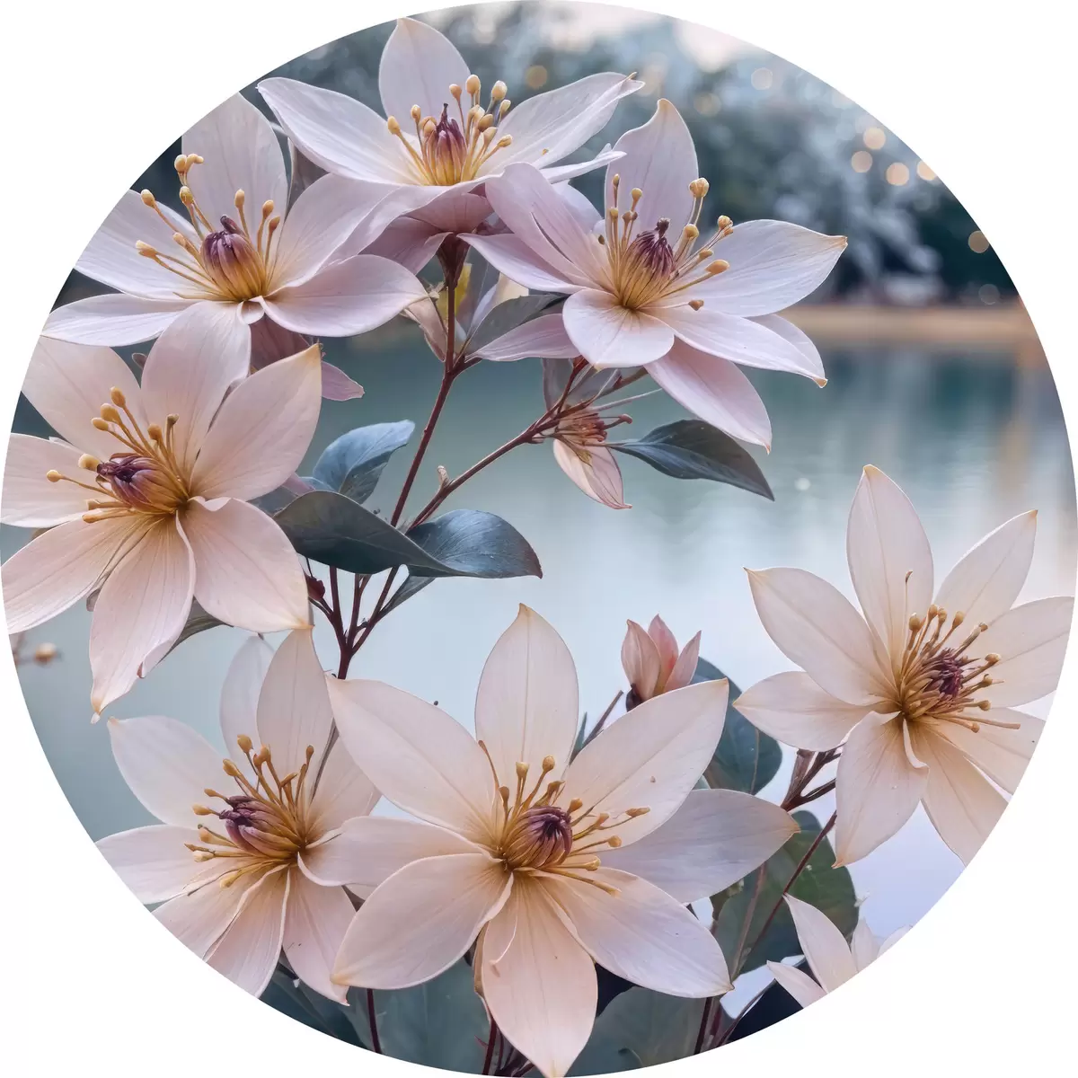 Nuotrauka Švelnios rausvos lotoso gėlės, plūduriuojančios ant ramaus vandens, su neryškiu medžių ir lapijos fonu Nr r40388