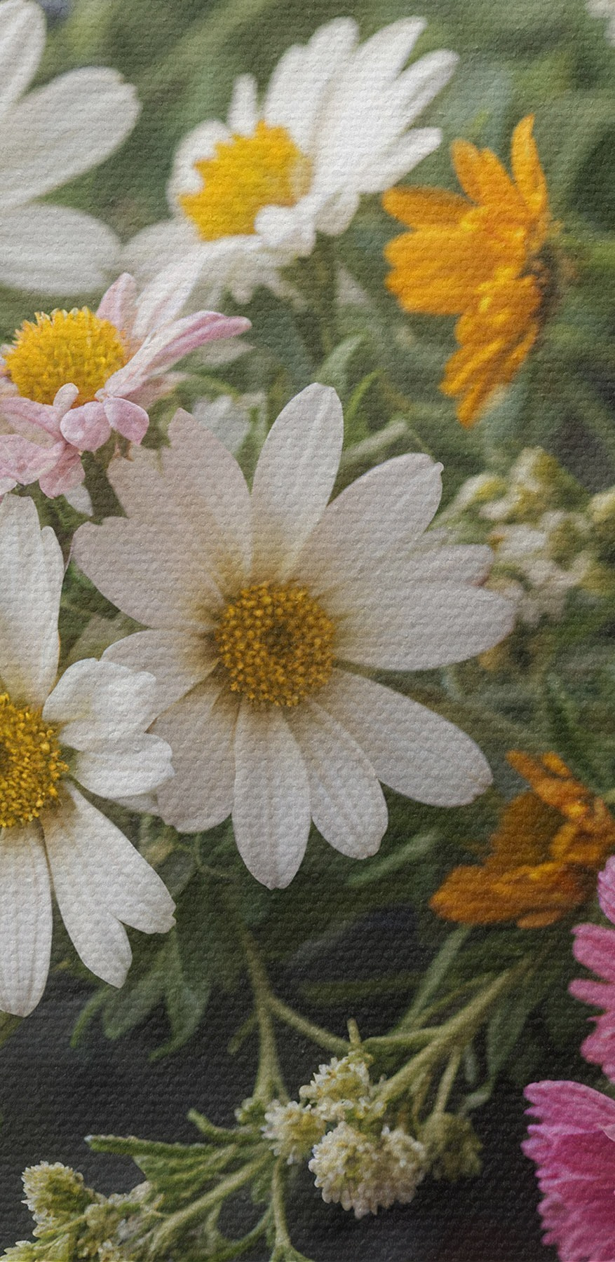 Nuotrauka Spalvingų lauko gėlių puokštė, įskaitant ramunes, kiaulpienes ir rožines gėles pilkame fone Nr r40389