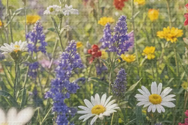 Nuotrauka Spalvinga lauko gėlių pieva su įvairiomis žydinčiomis gėlėmis, įskaitant ramunes, levandas ir raudonas gėles Nr r40390
