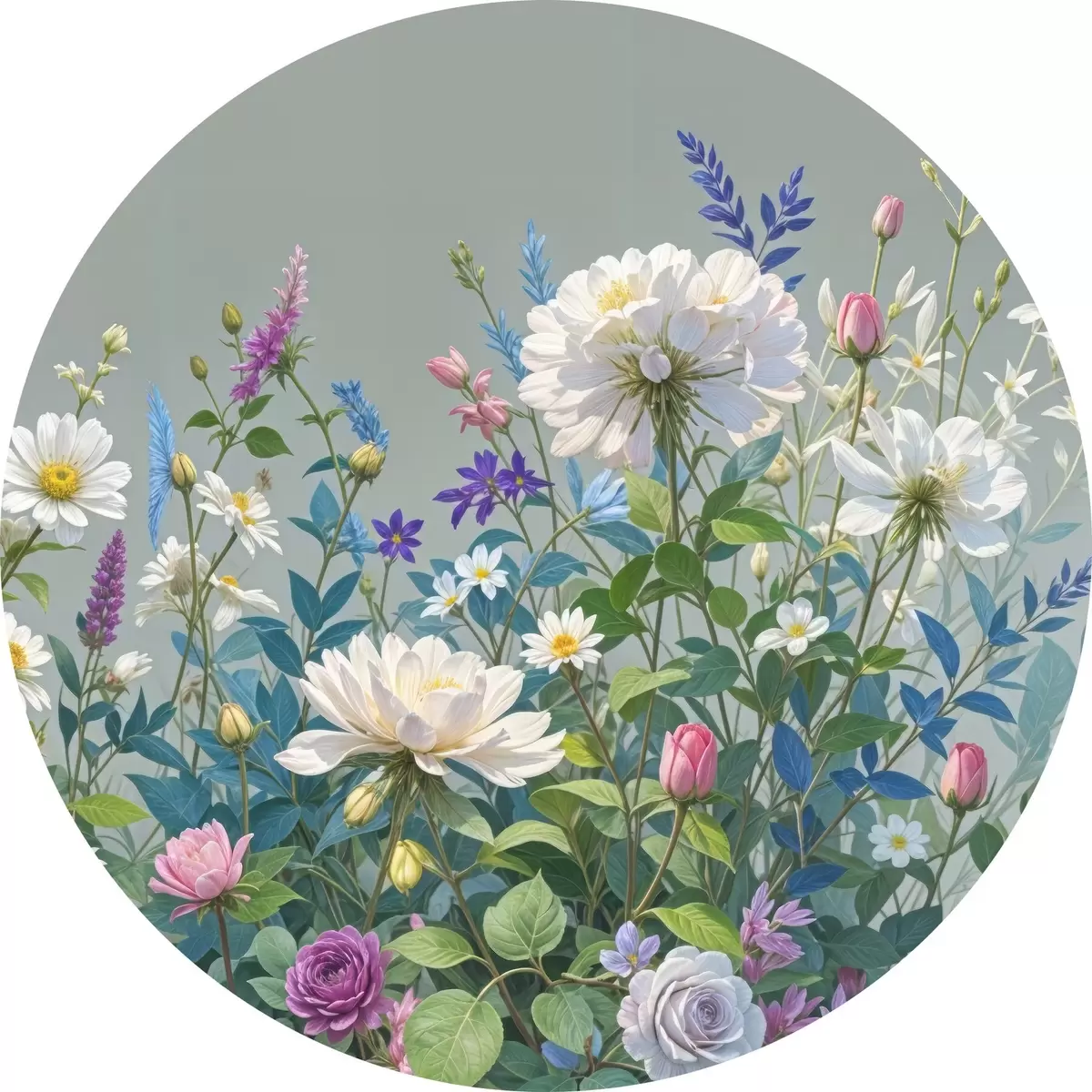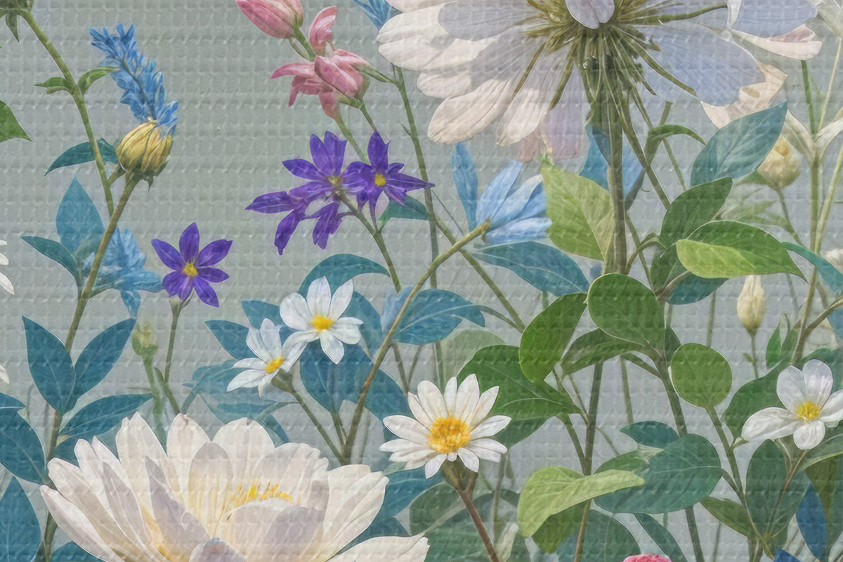 Nuotrauka Vešlus, gyvybingas sodas, pilnas įvairių spalvingų gėlių ir žydinčių augalų pilkame fone Nr r40393