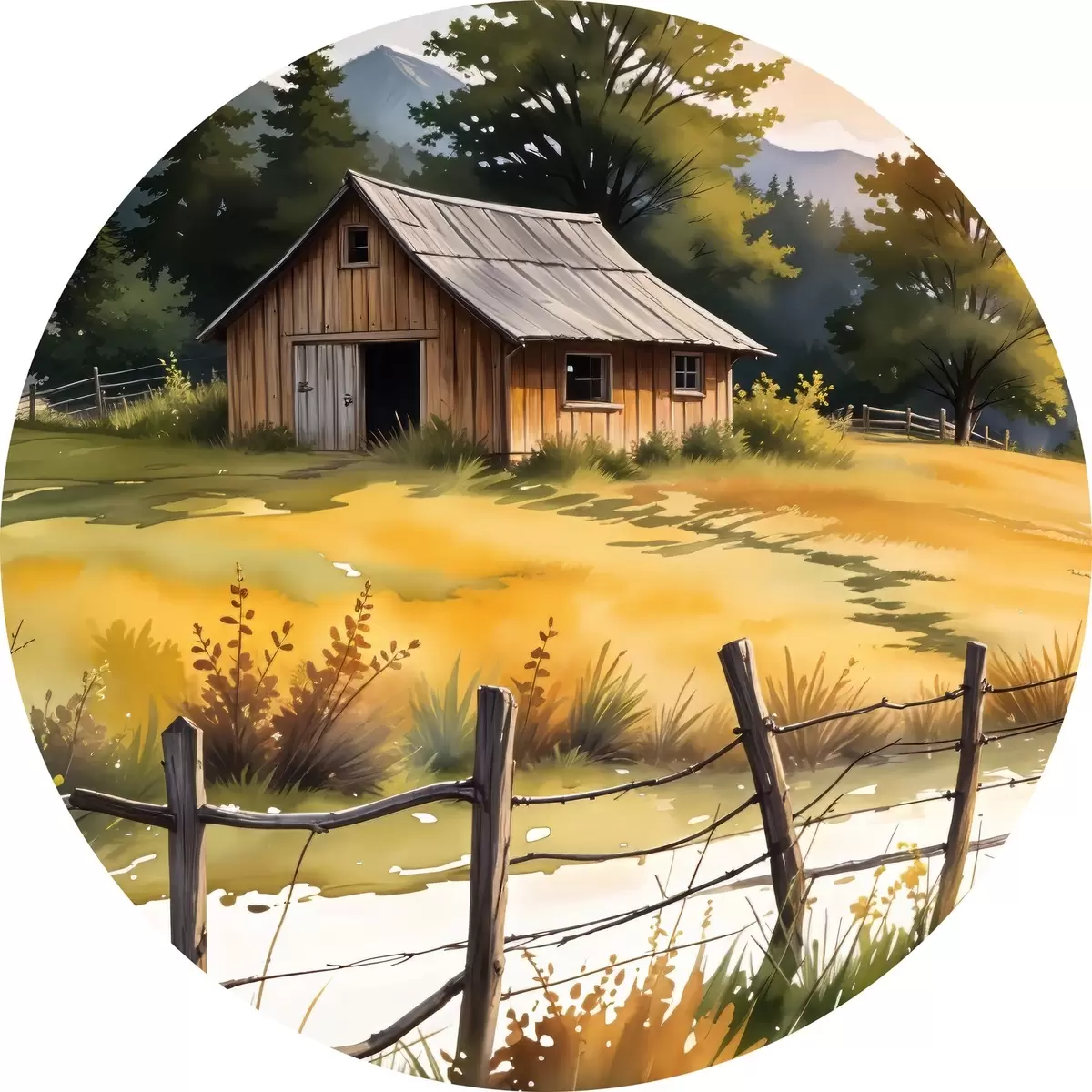 Nuotrauka Senas medinis namas kaimo vietovėje, apsuptas žolingo lauko, pušų ir kalnų Nr r40394
