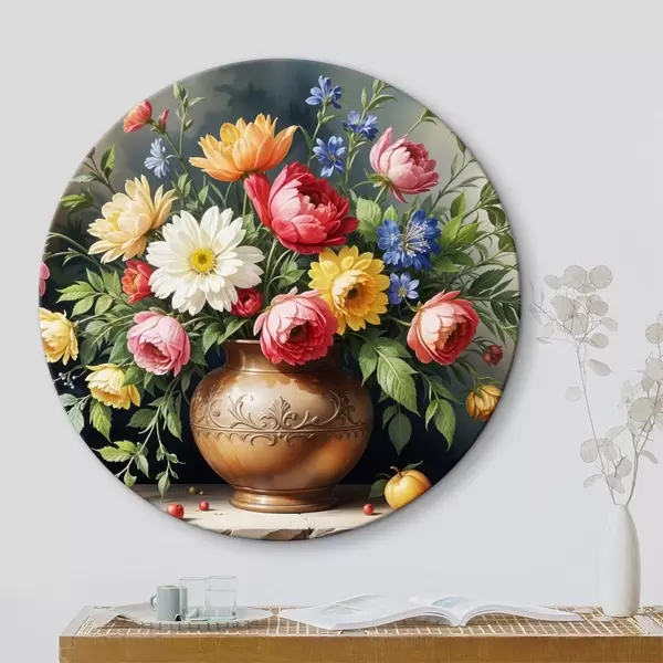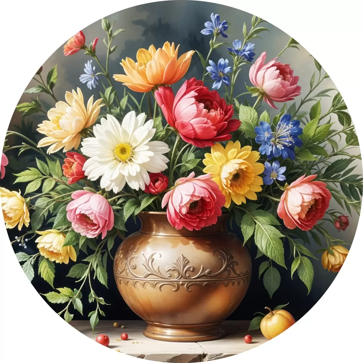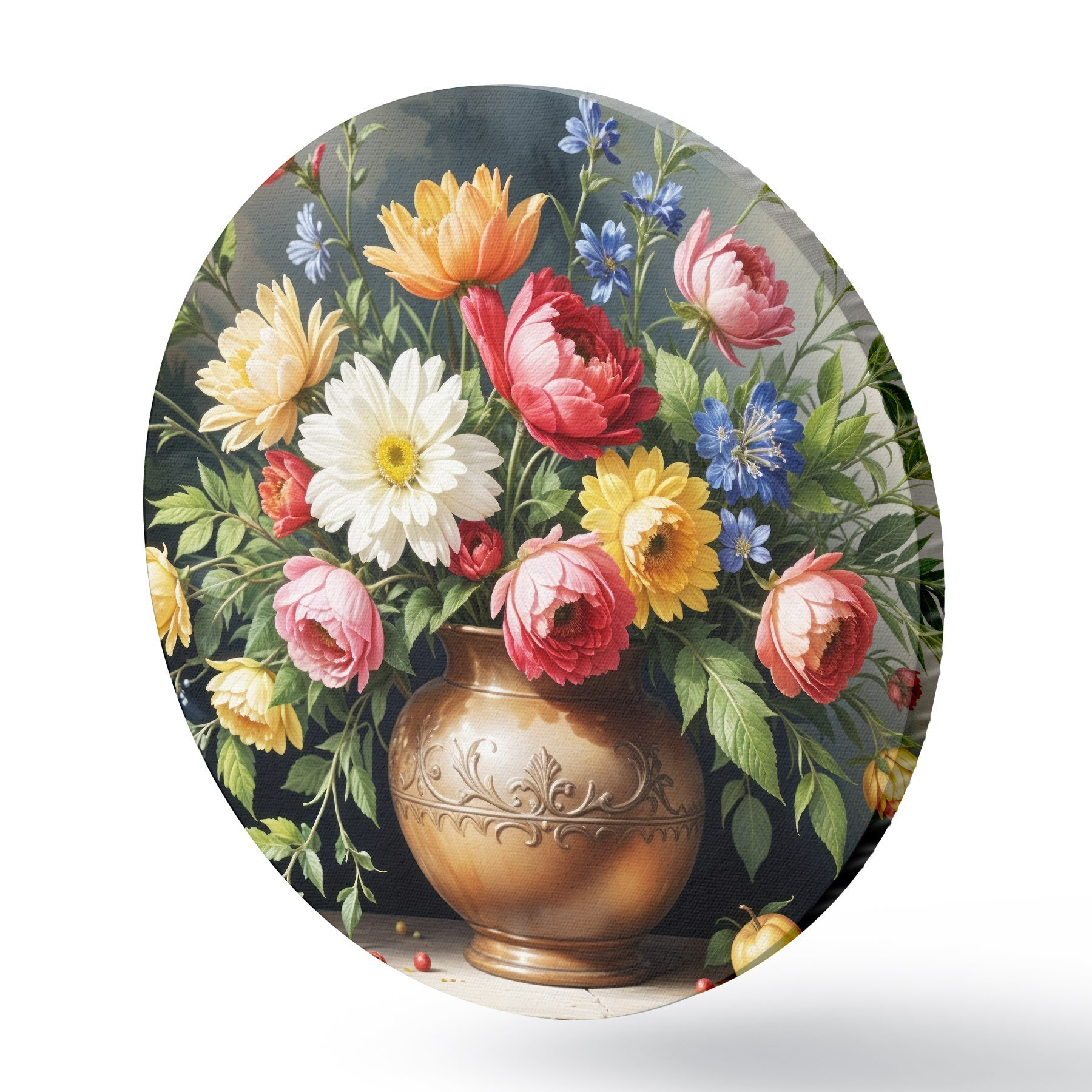 Apvalūs paveikslai Ryškus paveikslas su spalvingų gėlių puokšte, įskaitant raudonas rožes, geltonus narcizus ir baltas ramunes r40395