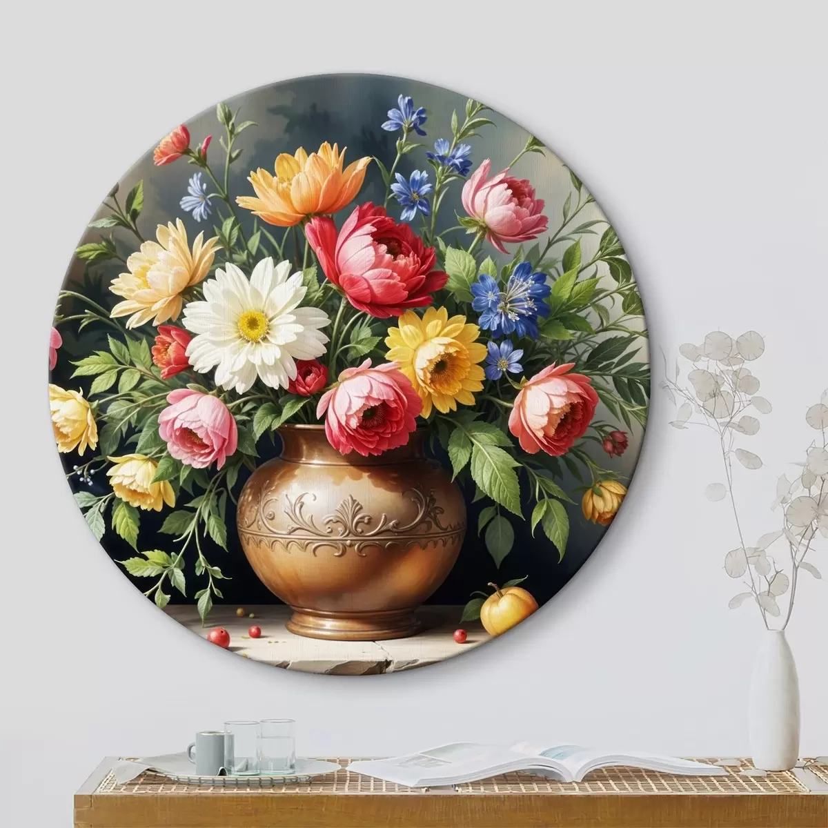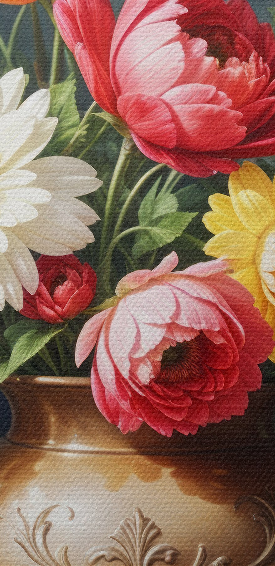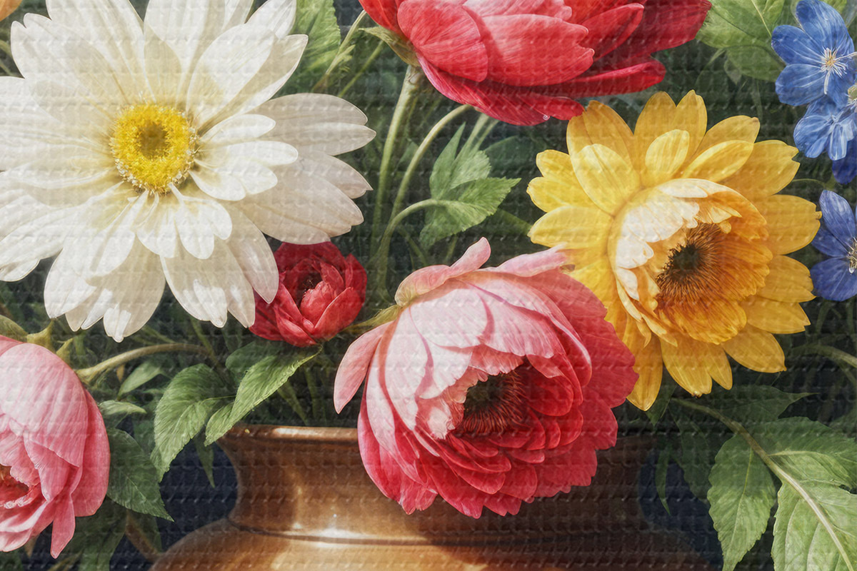 Nuotrauka Ryškus paveikslas su spalvingų gėlių puokšte, įskaitant raudonas rožes, geltonus narcizus ir baltas ramunes Nr r40395