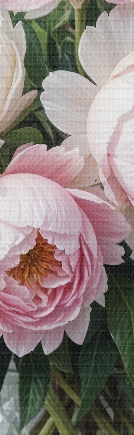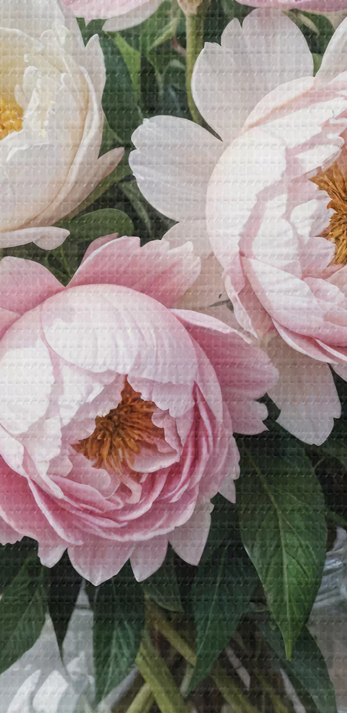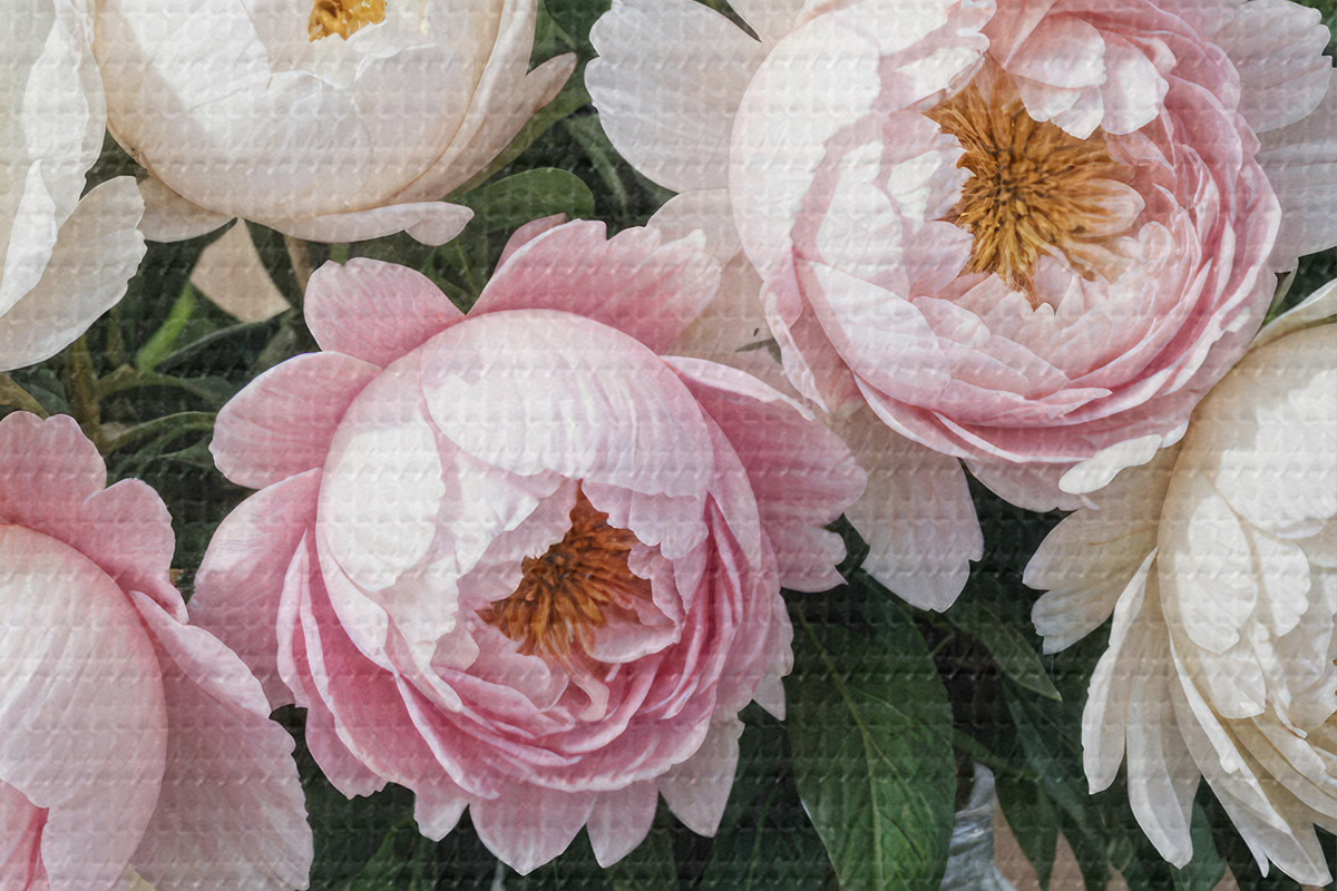 Nuotrauka Gražių rožinių ir baltų bijūnų puokštė stiklinėje vazoje, išdėliota ant medinio paviršiaus Nr r40398