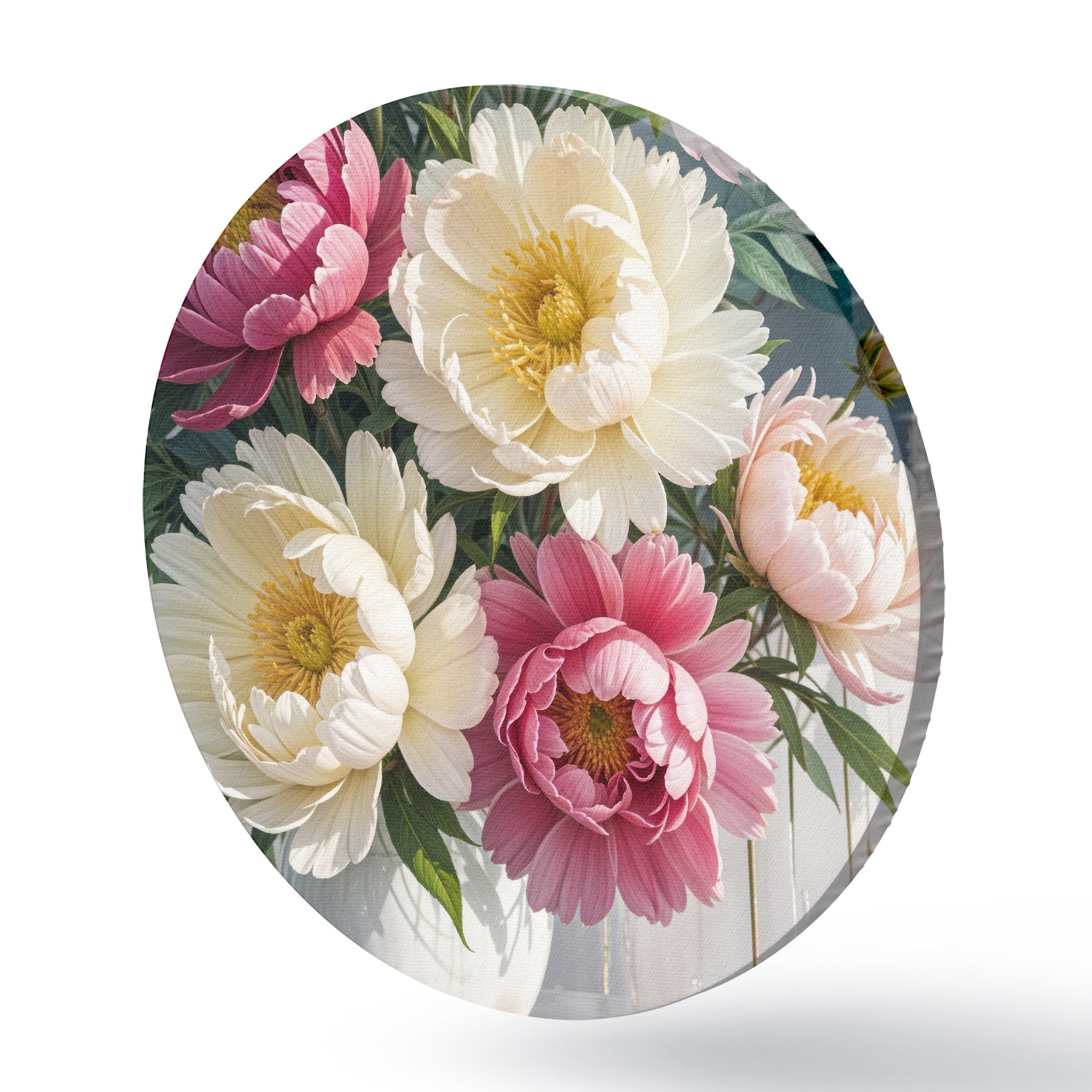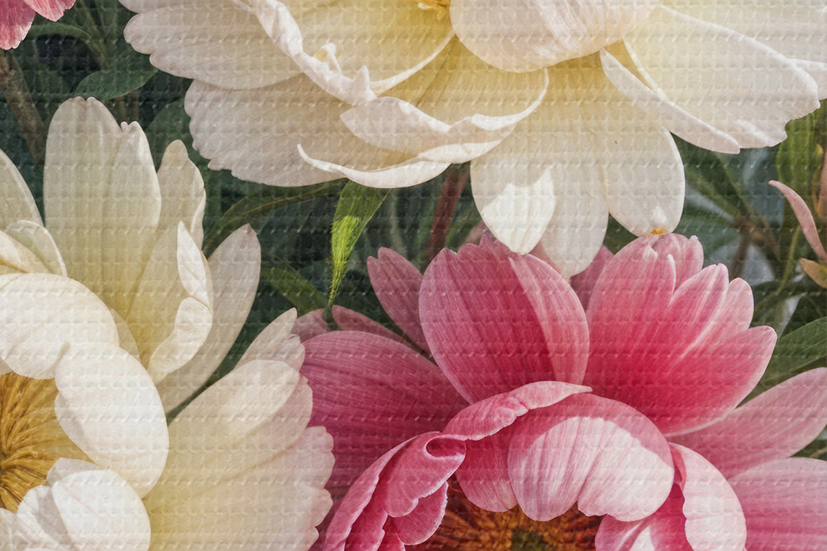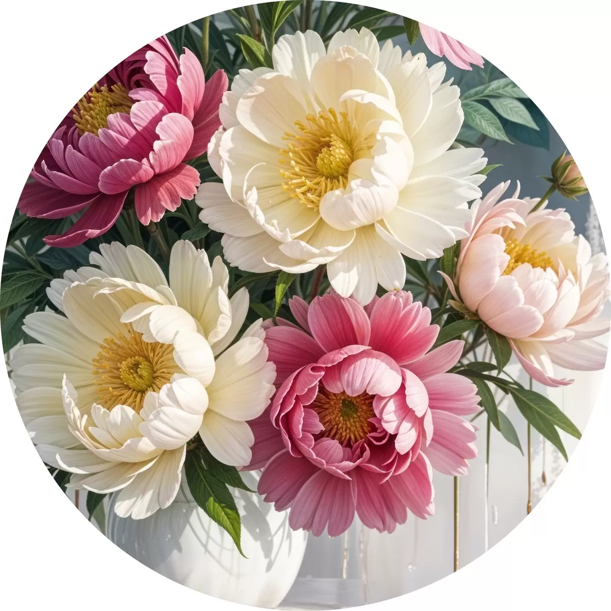 Nuotrauka Įvairių rožinių, baltų ir geltonų atspalvių su dažų purslais ryškių bijūnų gėlių puokštė Nr r40403