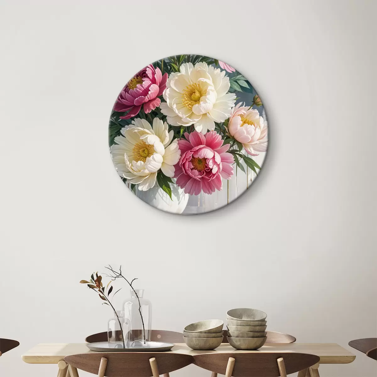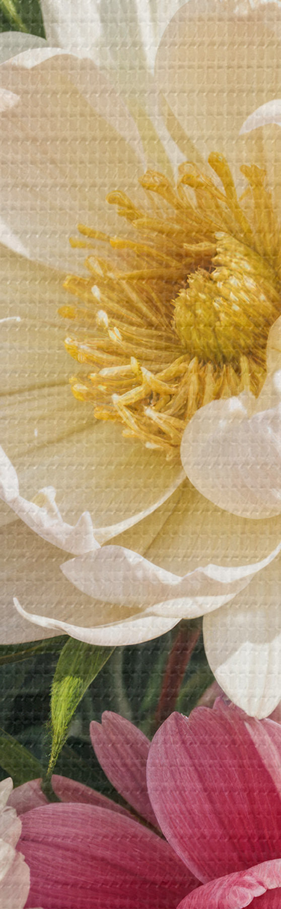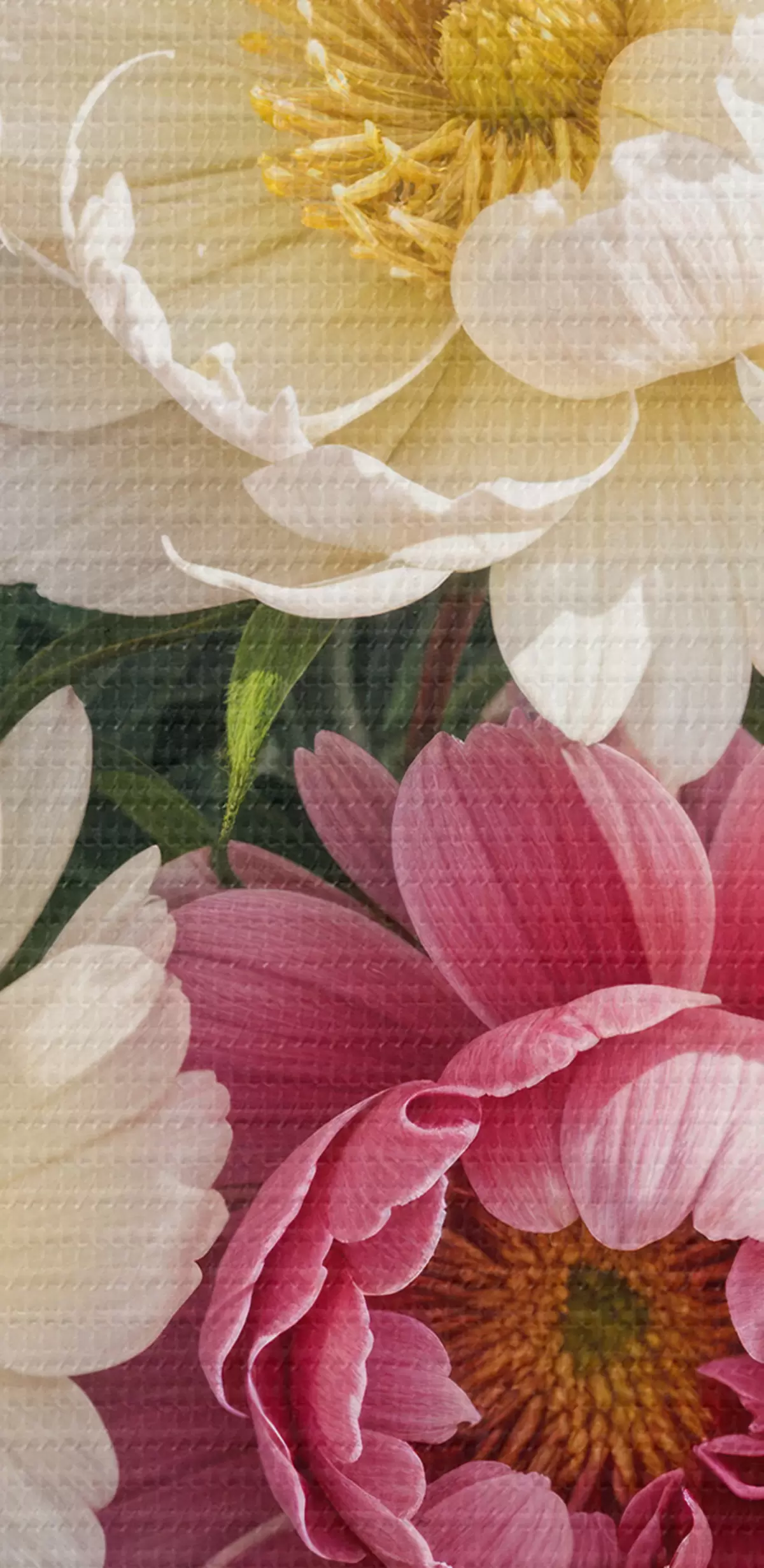 Nuotrauka Įvairių rožinių, baltų ir geltonų atspalvių su dažų purslais ryškių bijūnų gėlių puokštė Nr r40403